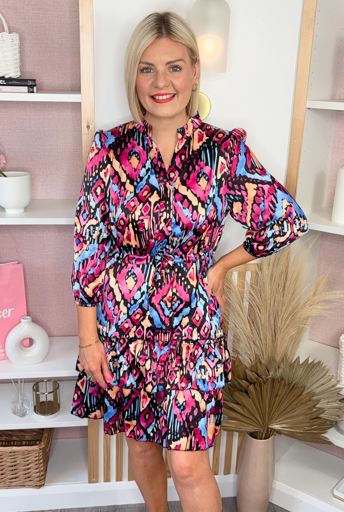 V-neck dress with drawstring waist, tiered skirt and half sleeve with elasticated. This style is lined