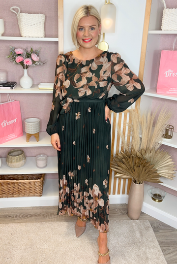Round neck midi dress with pleated skirt and tie belt. The body and skirt is lined and the sleeves are sheer