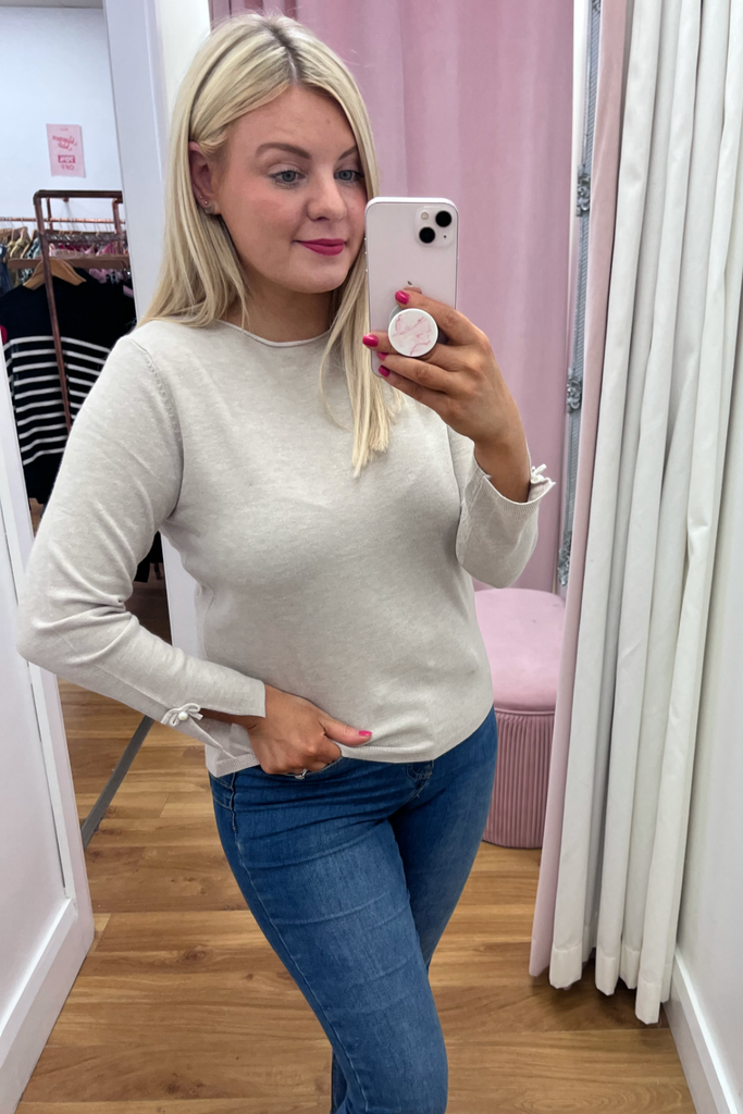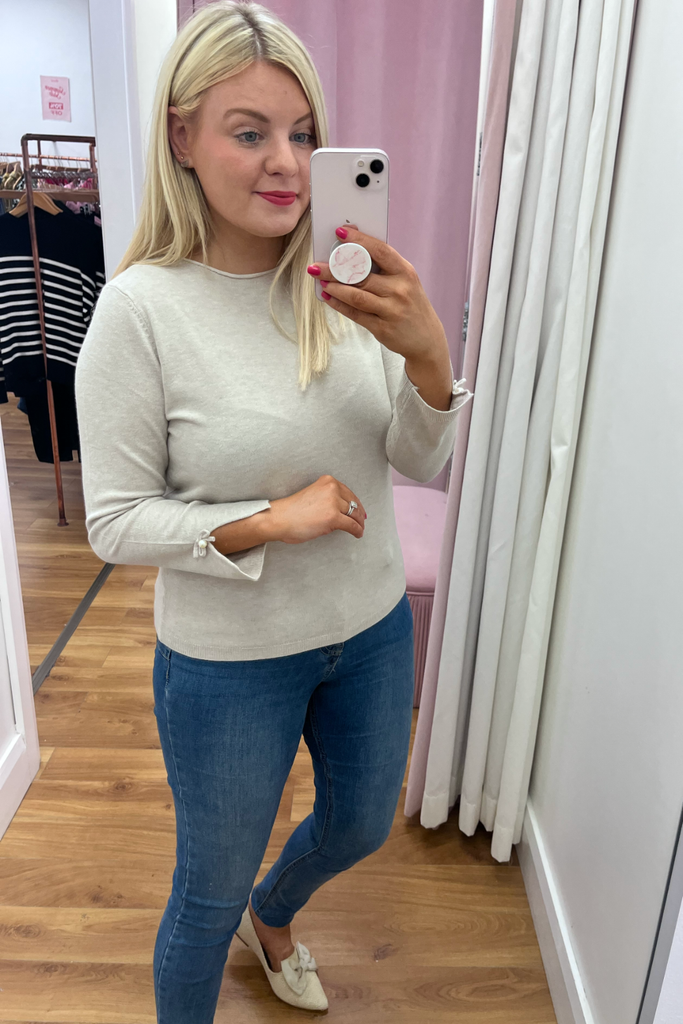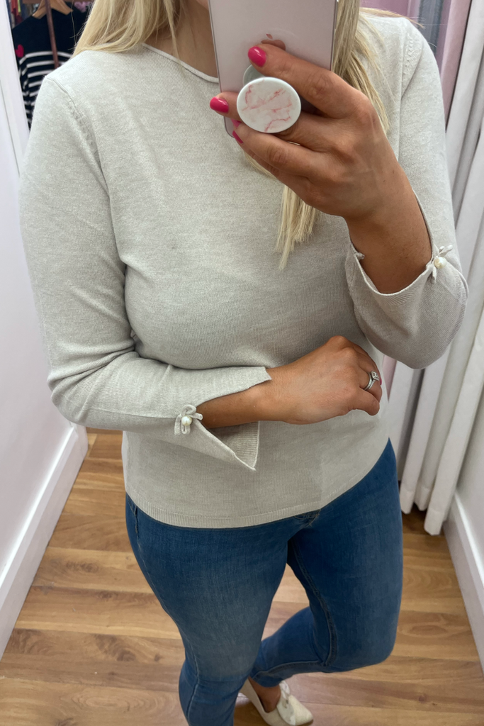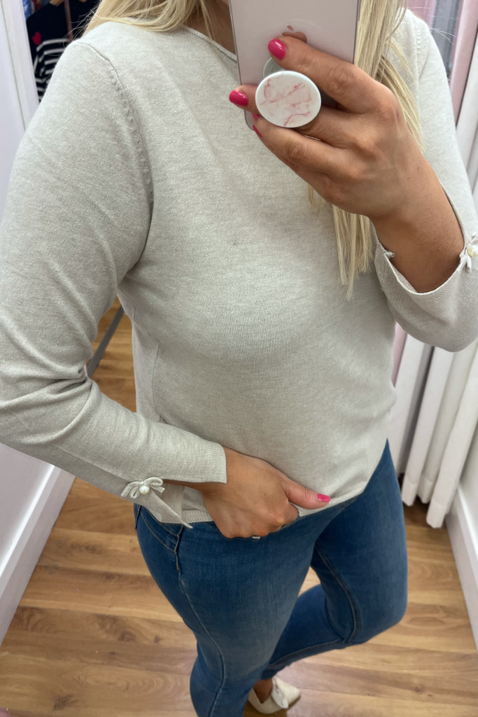 Fine solid colour knit with round neck. Featuring bow and pearl detail at the cuff. The sweetest knit perfect to wear on its own or layer over dresses