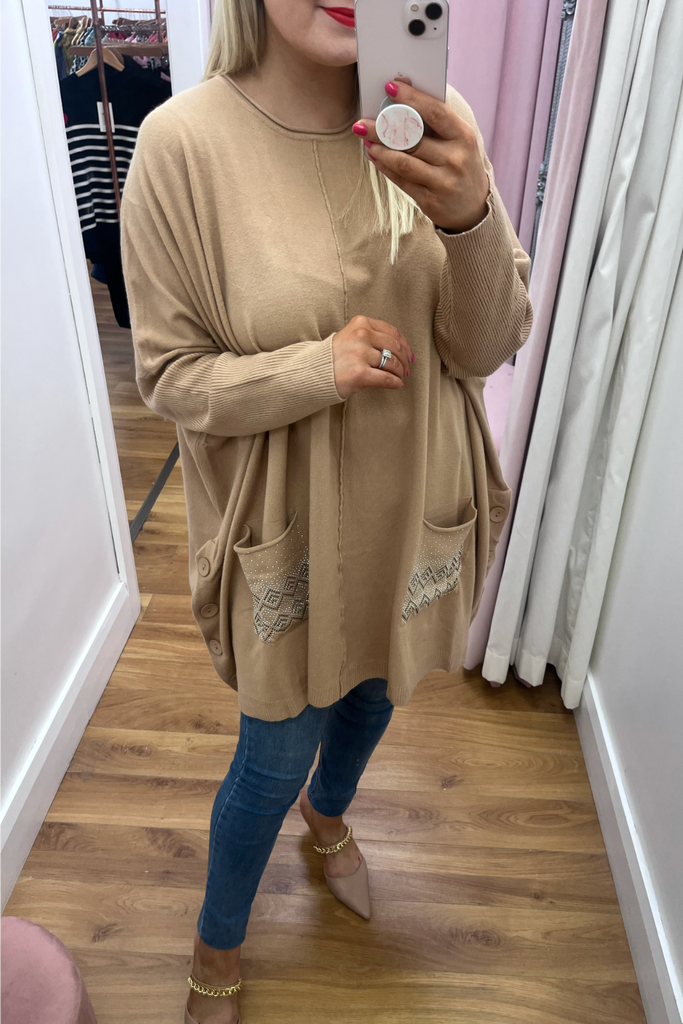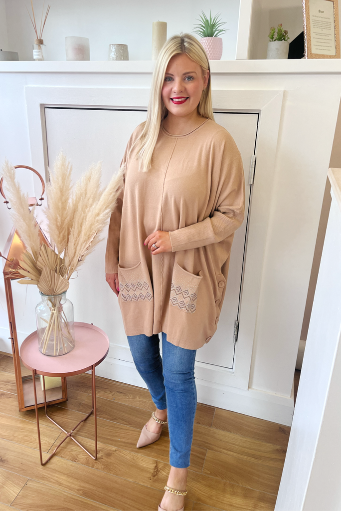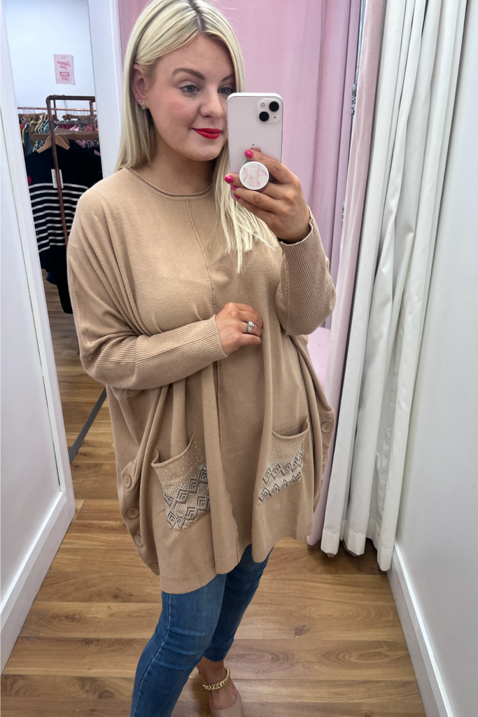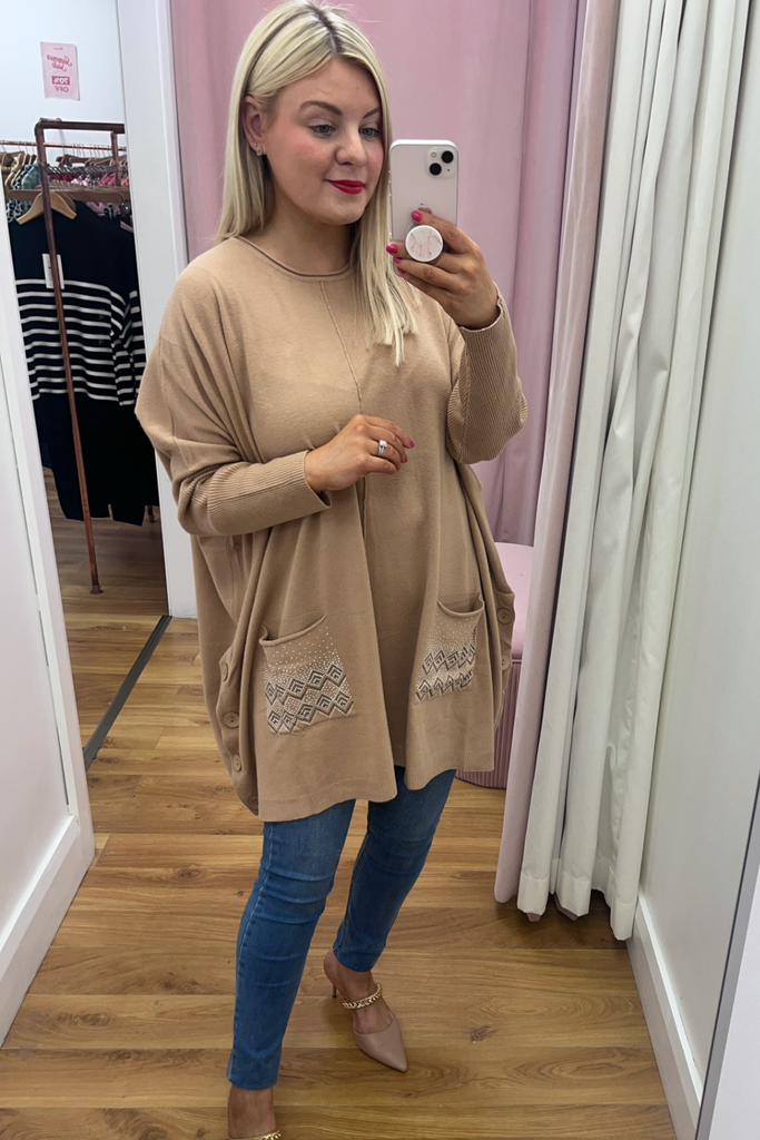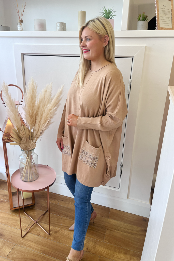 A beautiful mix of comfortable and luxurious! Our knitted cape jumper has sleeves and embellished pockets. With faux button detail on each side. Many colours available.