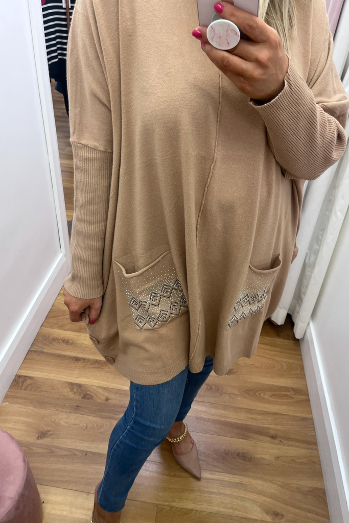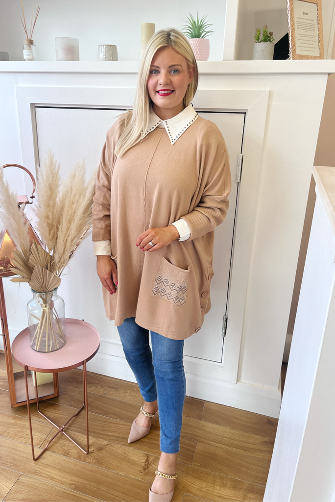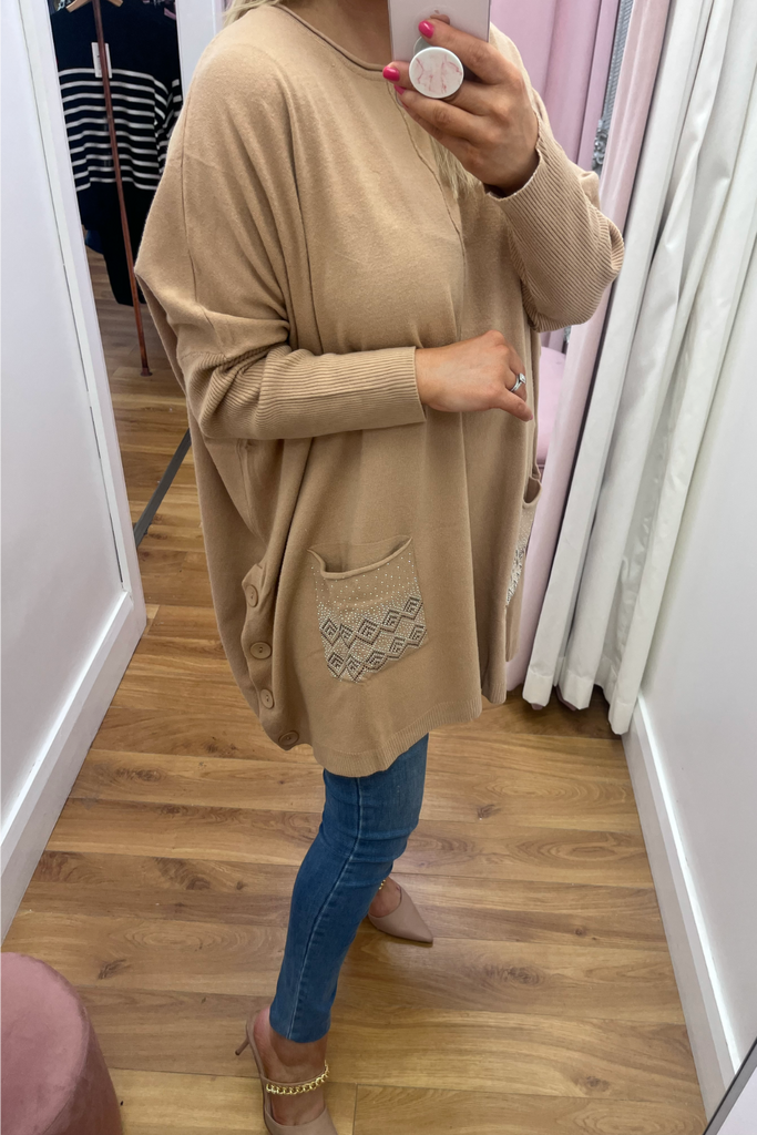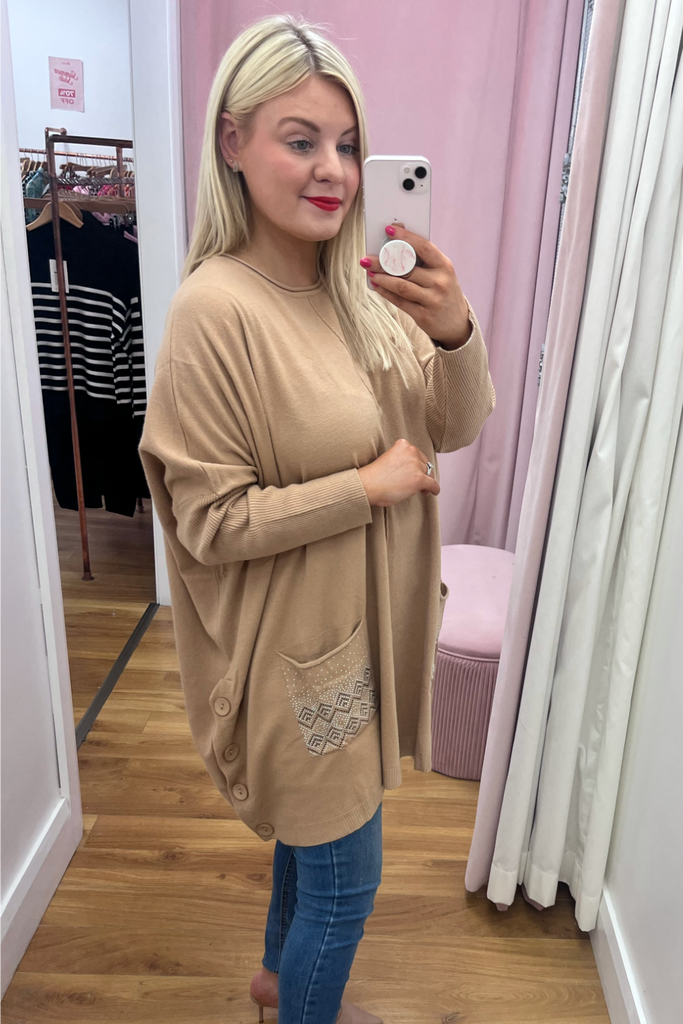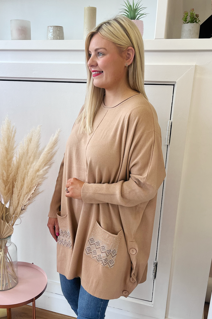 A beautiful mix of comfortable and luxurious! Our knitted cape jumper has sleeves and embellished pockets. With faux button detail on each side. Many colours available.