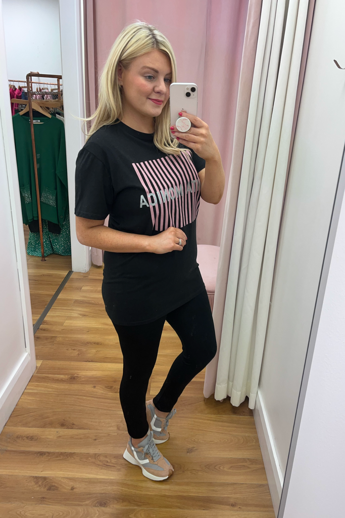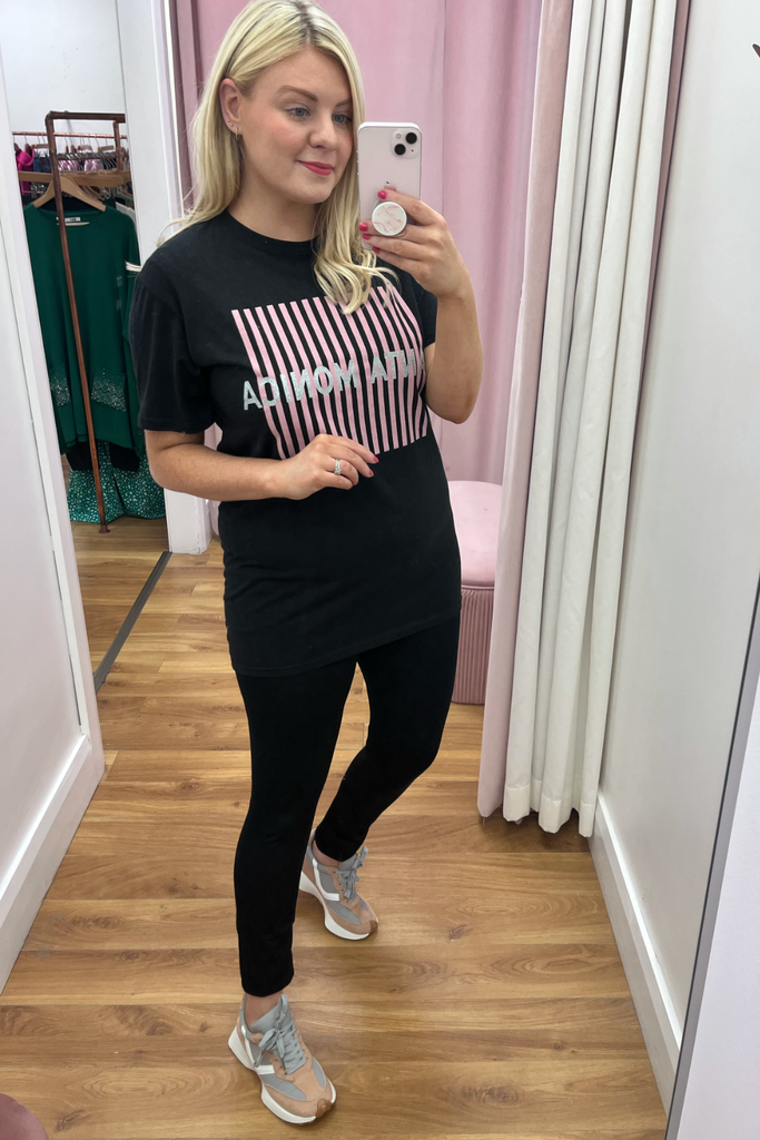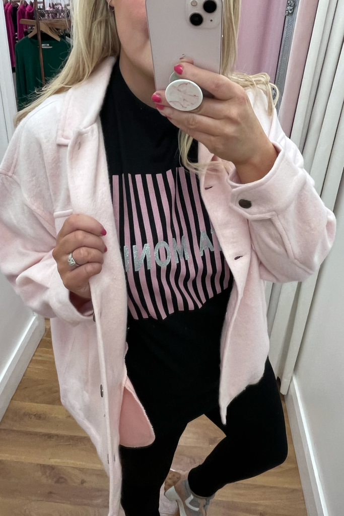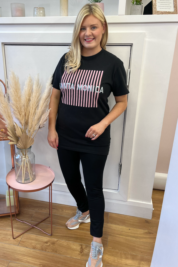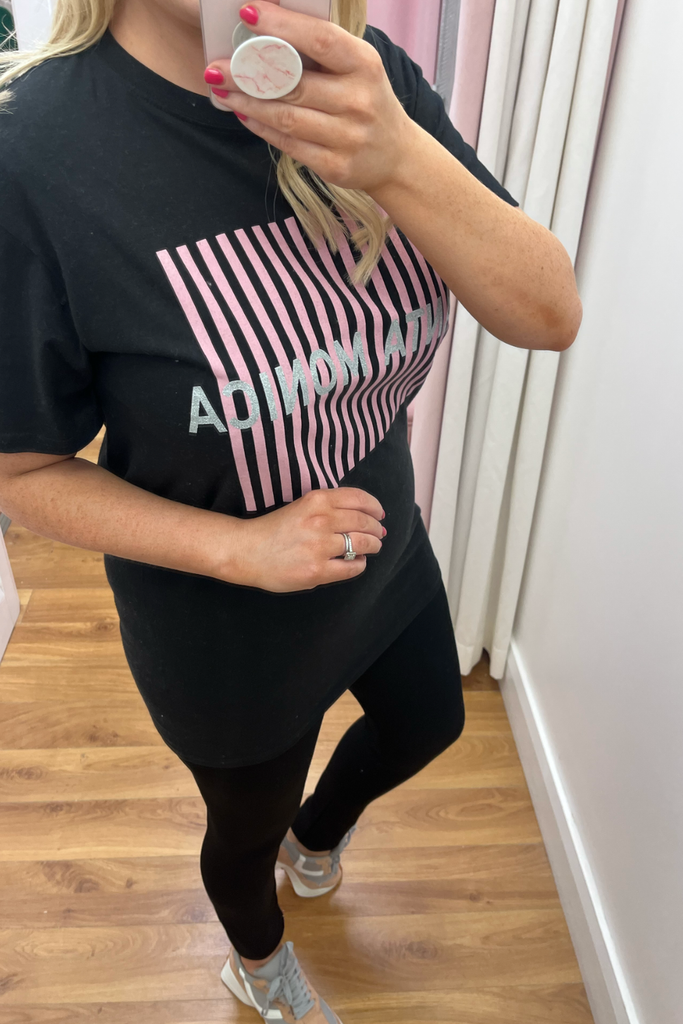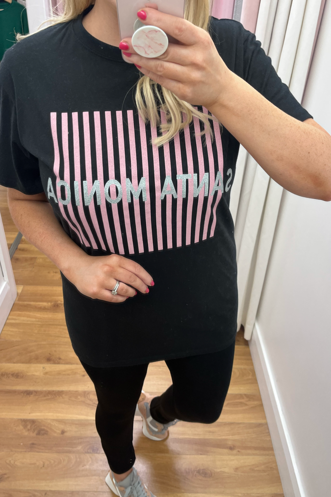 Black tee with pink and metallic Santa Monica graphic. The perfect all-season style to layer under our shackets!