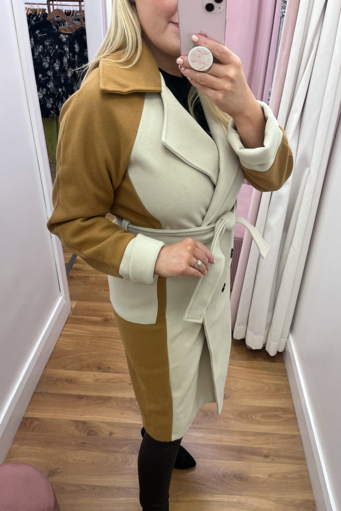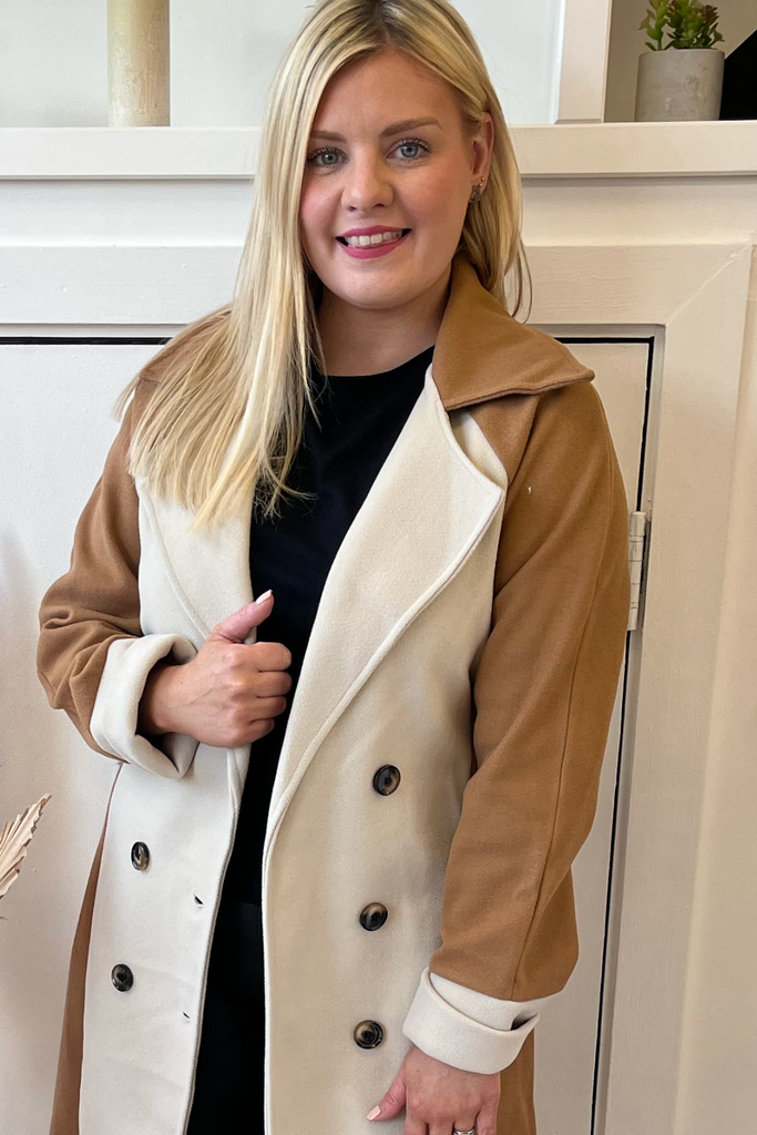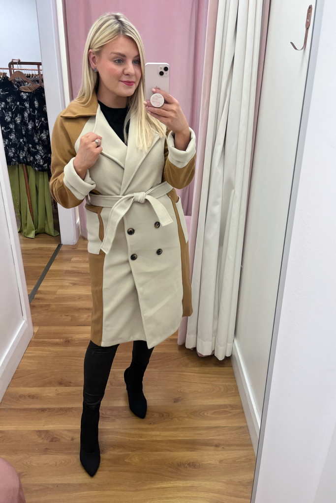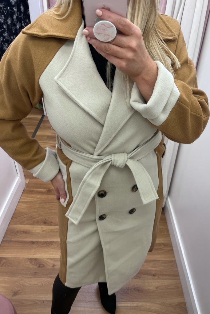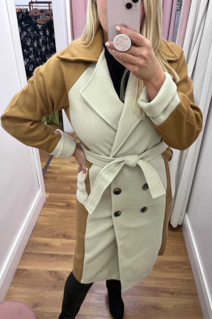 Belted double breasted Trench Coat in a rich tan and stone contrasting style. With front button closure, pockets and tie belt. A classic style to dress up any simple outfit or layer over dresses for a cool chic look!