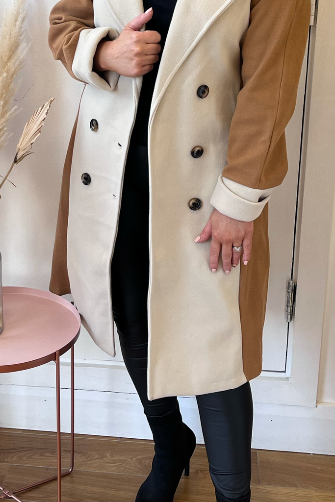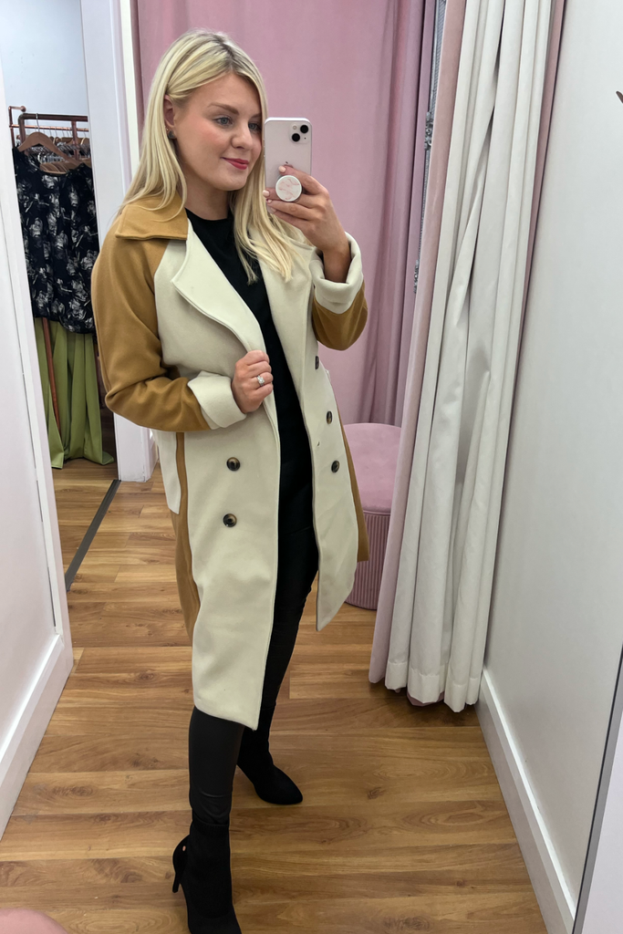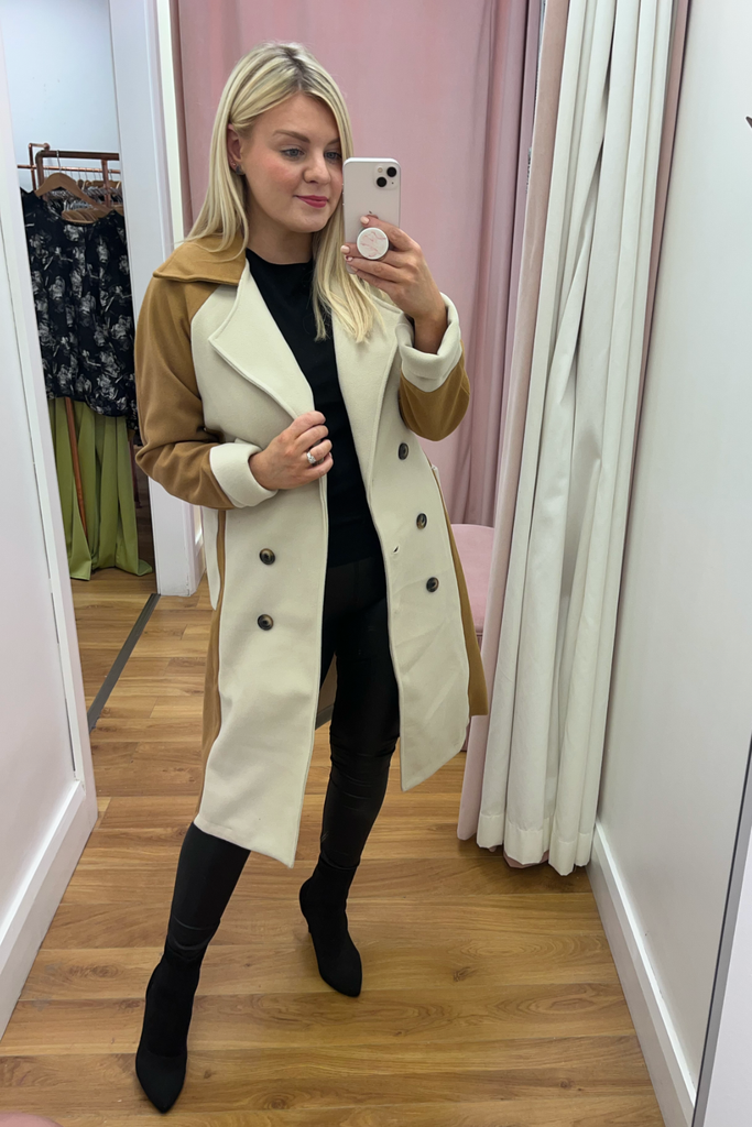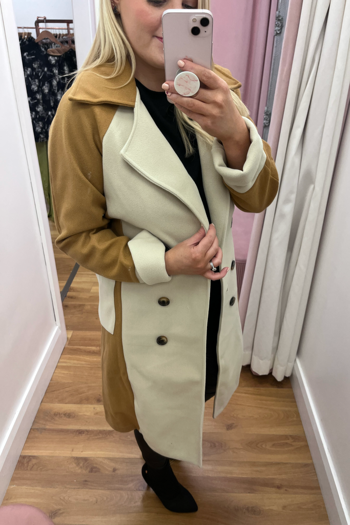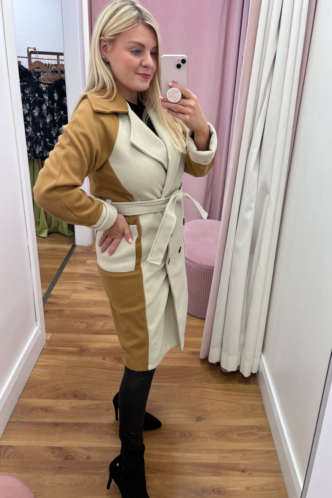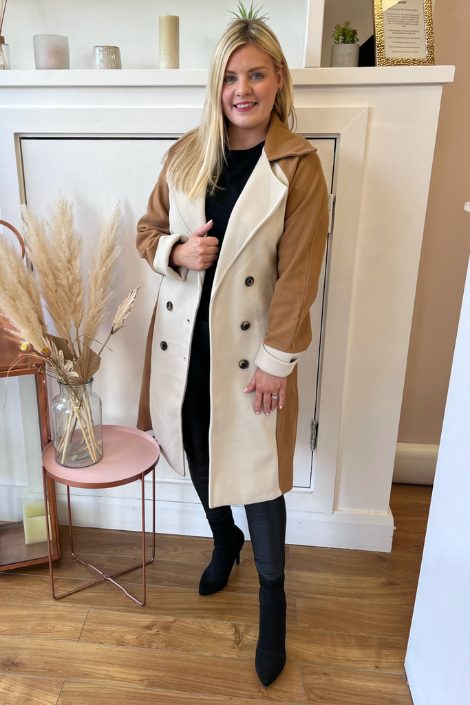Belted double breasted Trench Coat in a rich tan and stone contrasting style. With front button closure, pockets and tie belt. A classic style to dress up any simple outfit or layer over dresses for a cool chic look!