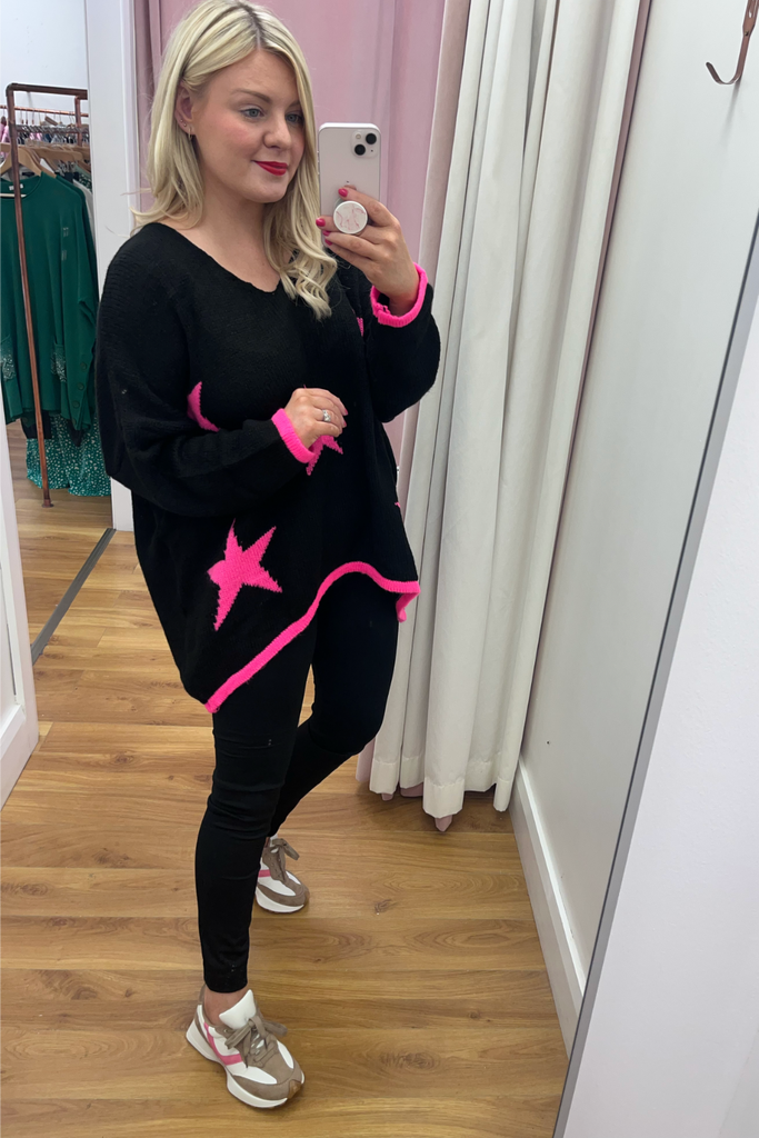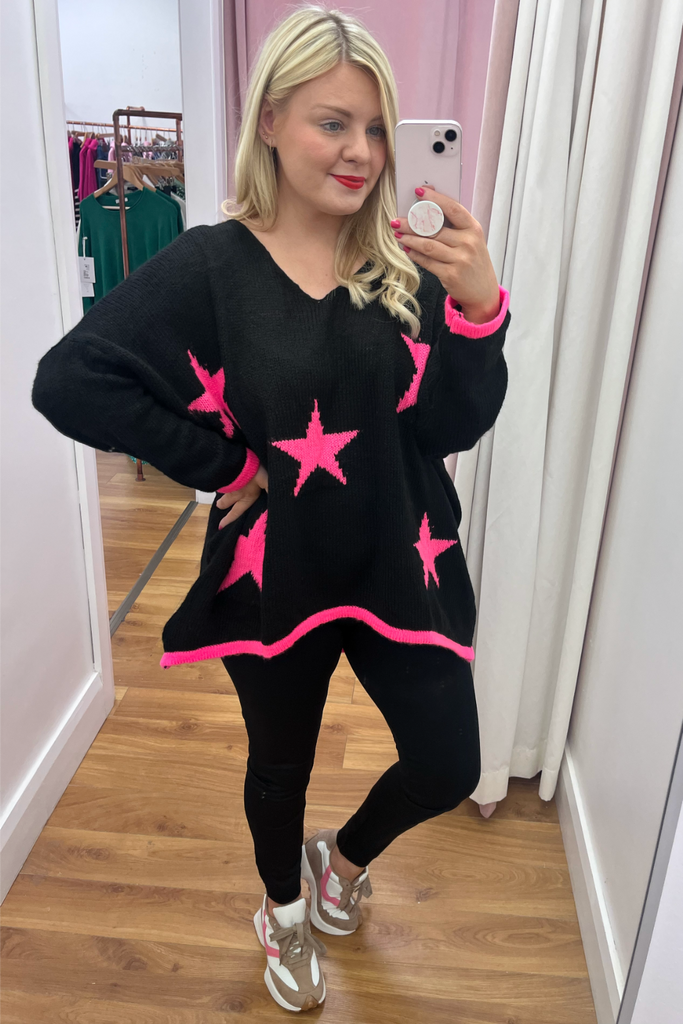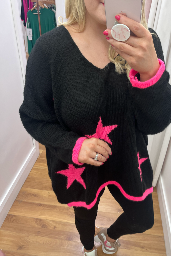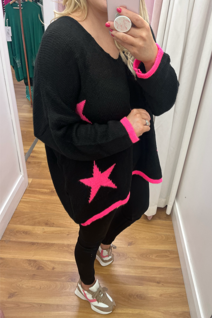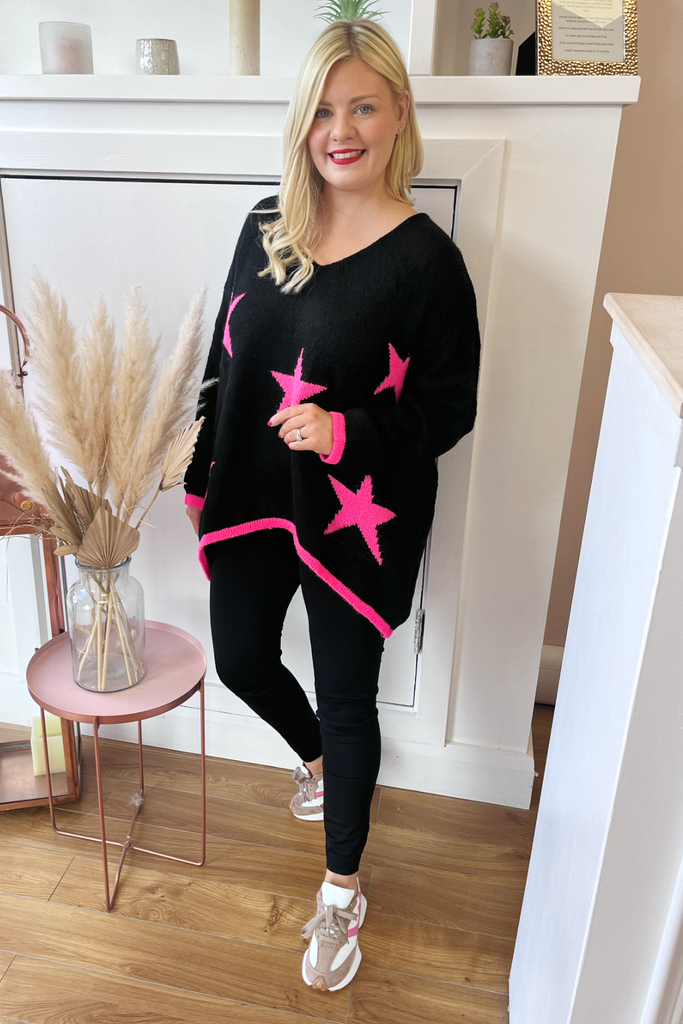 *BEST-SELLER RESTOCKED* A statement knit with V-neckline, full length sleeves and long length body with dipped hem to the back. With pink stars and contrasting cuff and trimmed hemline. Team it with denims, leggings or leather-look jeans. The perfect casual style with a statement colour!