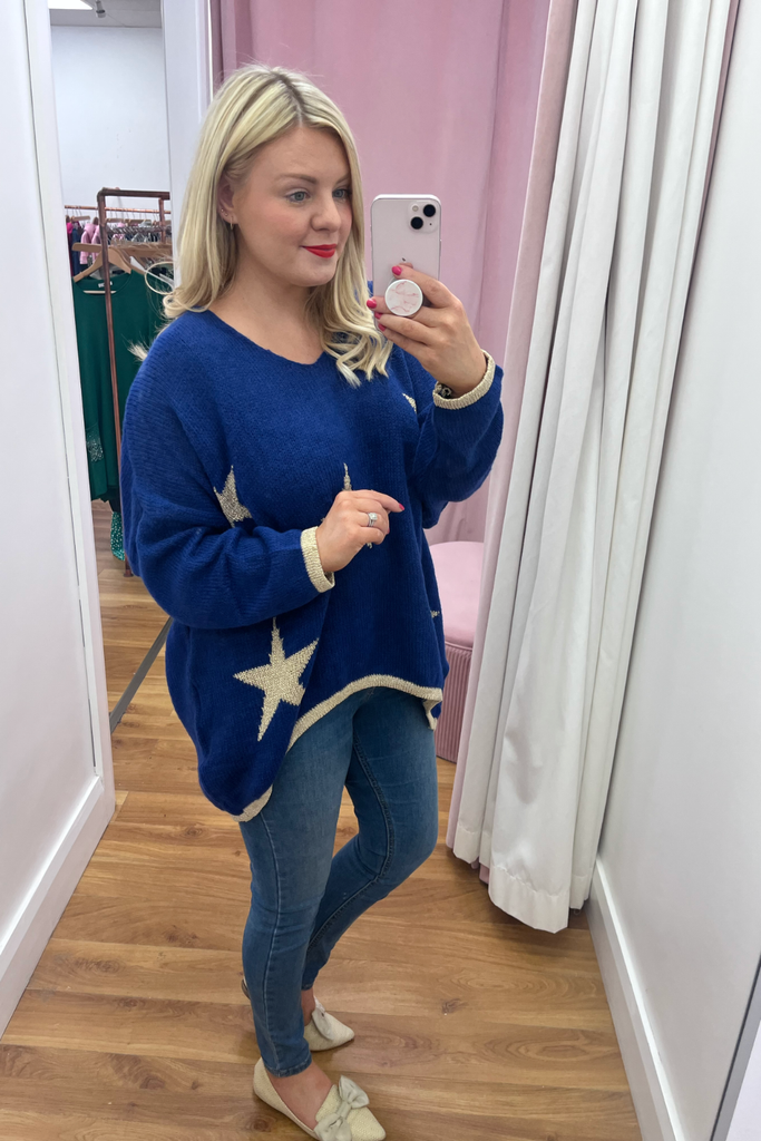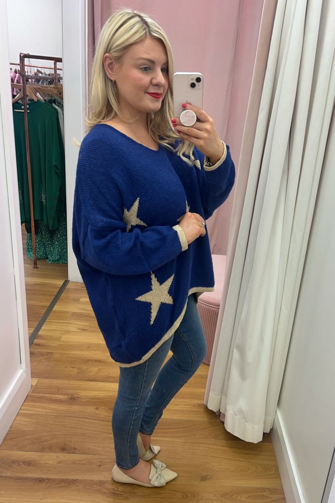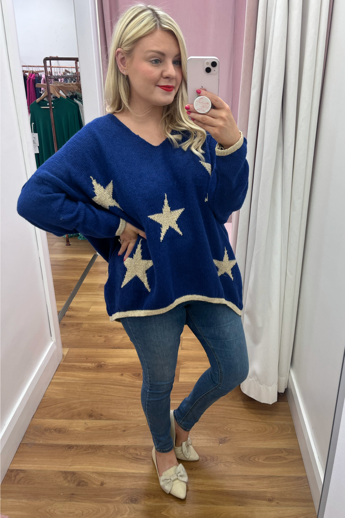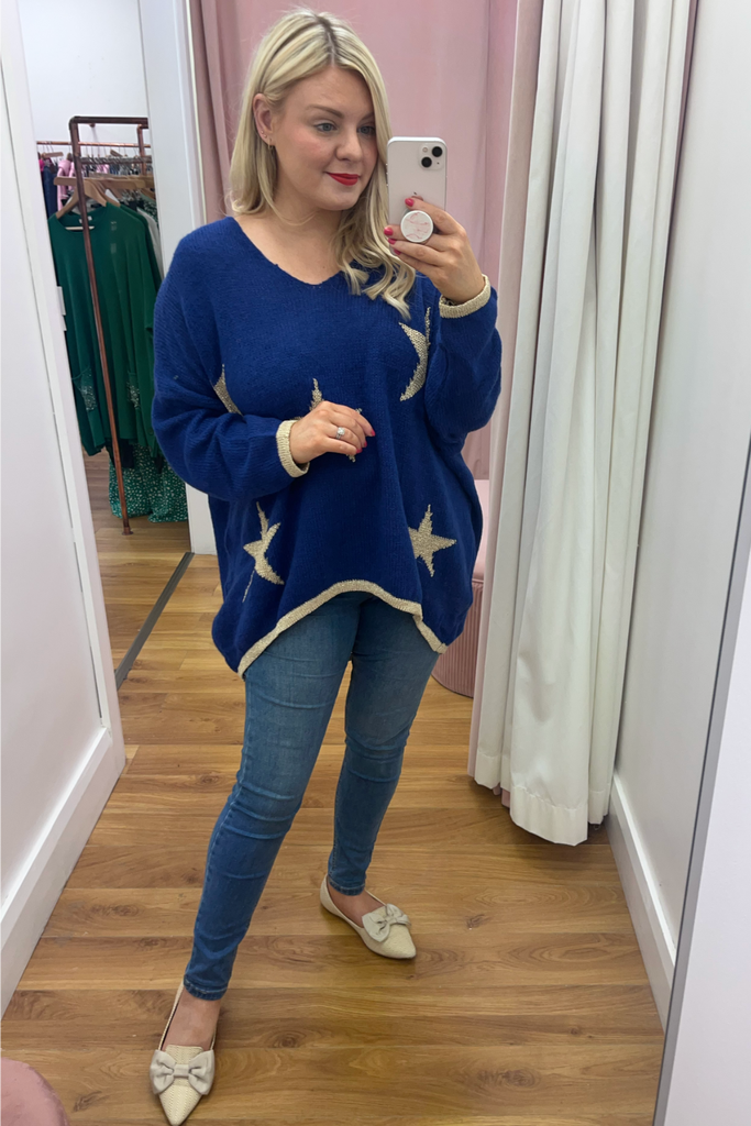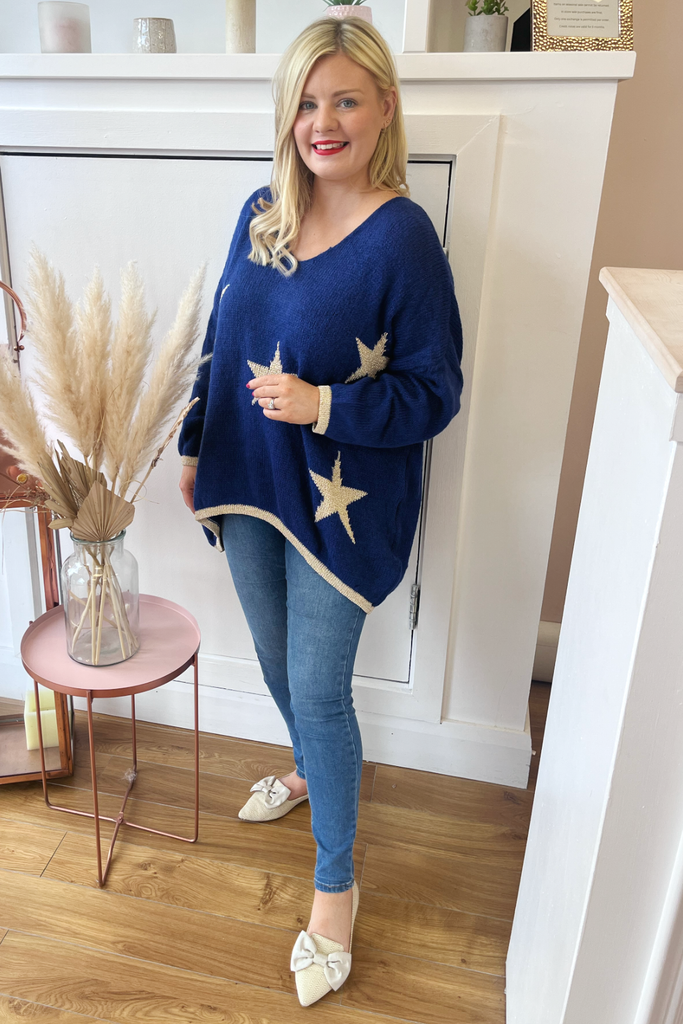 *BEST-SELLER RESTOCKED* A statement knit with V-neckline, full length sleeves and long length body with dipped hem to the back. With contrasting stars and cuff and trimmed hemline. Team it with denims or layer it over a dress. The perfect casual style with a statement colour!