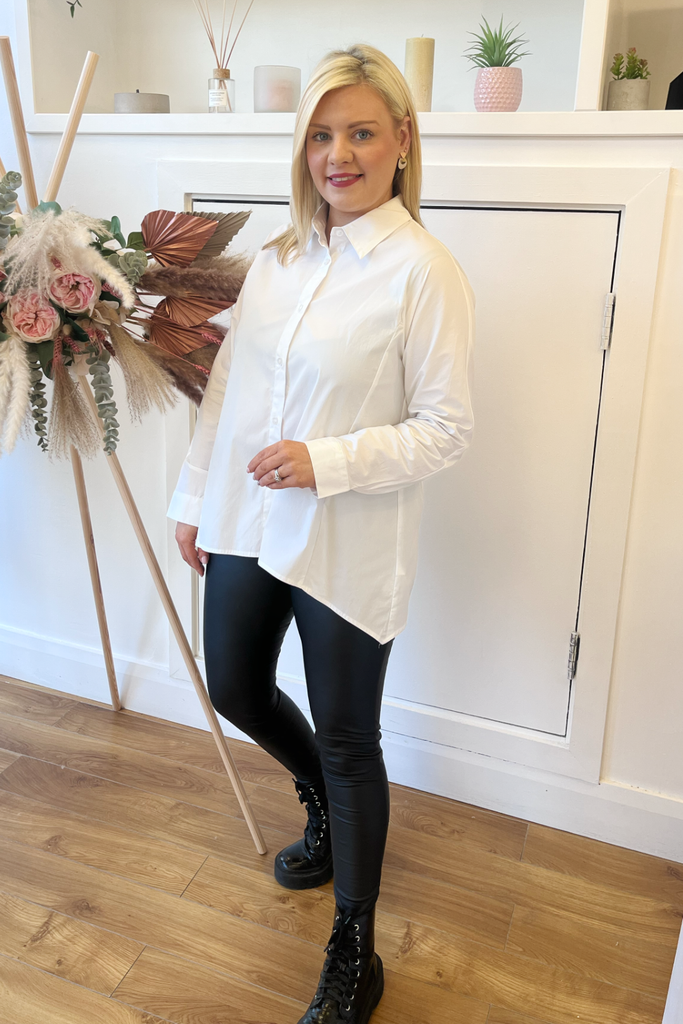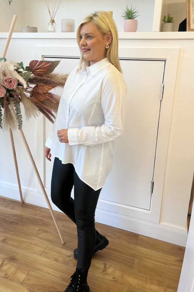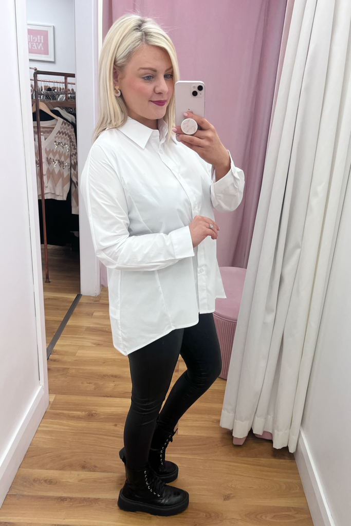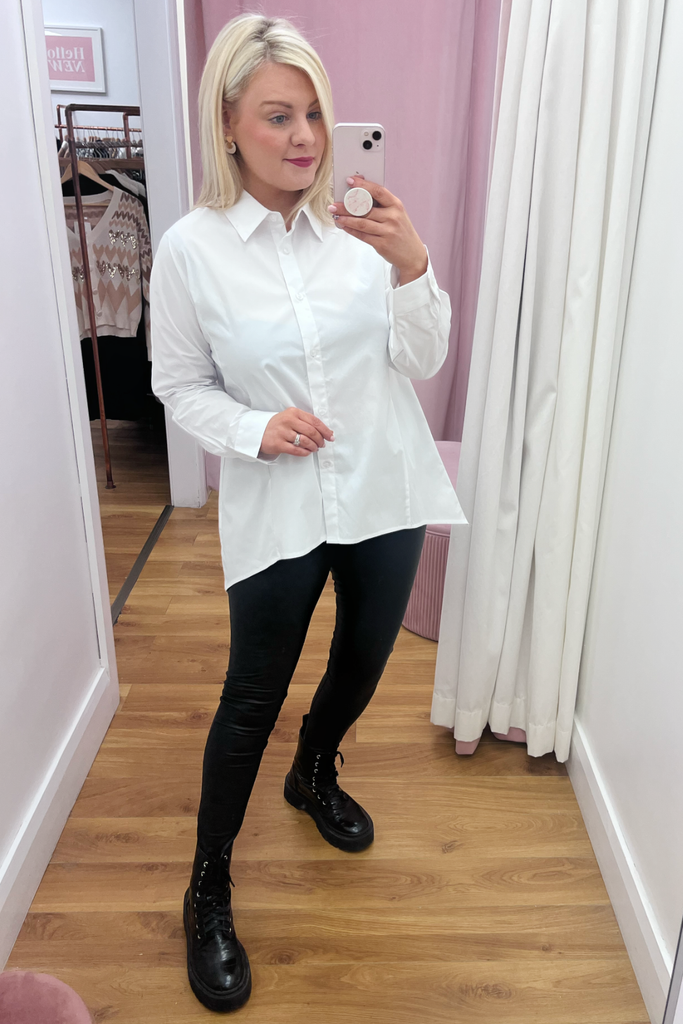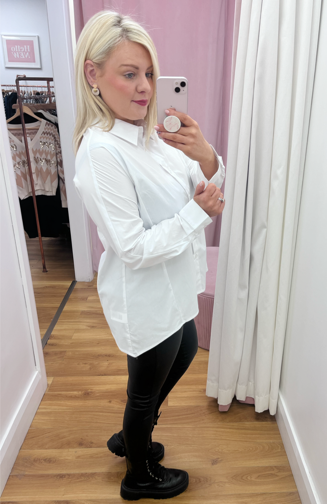 Crisp white tailored shirt with dipped hemline to the sides. Perfect for a pretty work wardrobe or layering under knitwear.