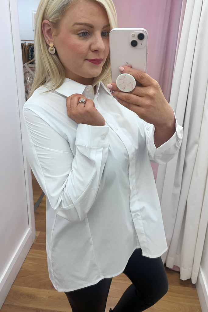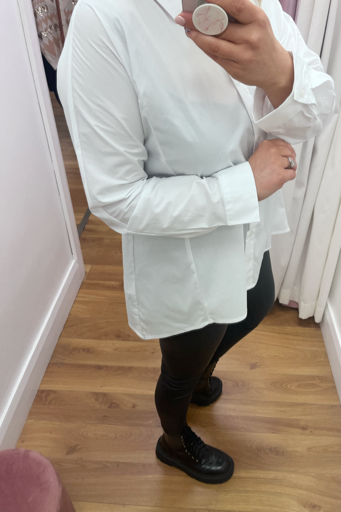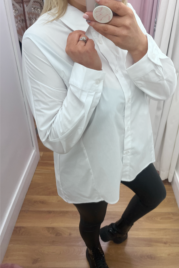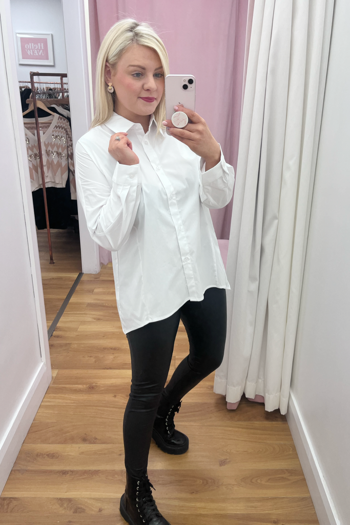 Crisp white tailored shirt with dipped hemline to the sides. Perfect for a pretty work wardrobe or layering under knitwear.