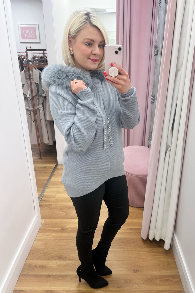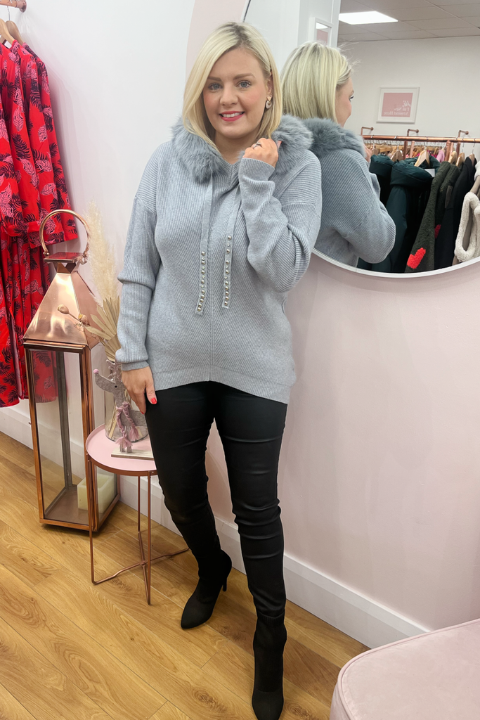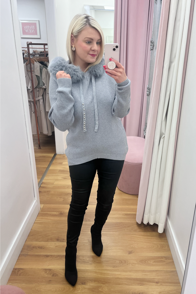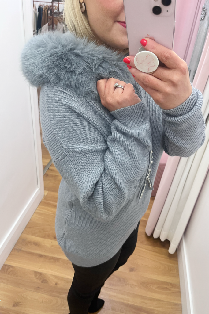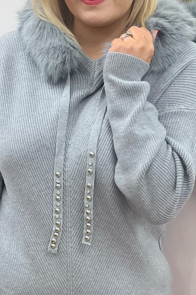 Super soft knit with V hemline, hood and embellished draw string. The hood has a faux fur detachable trim. This style has gorgeous length with dipped hemline