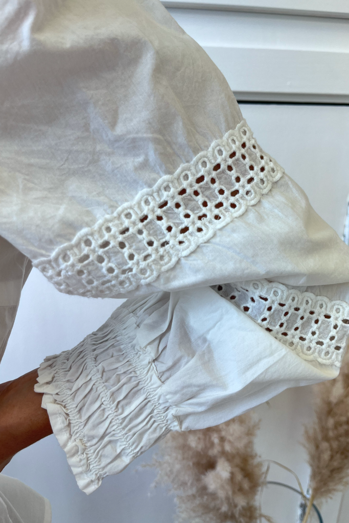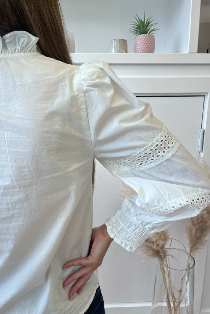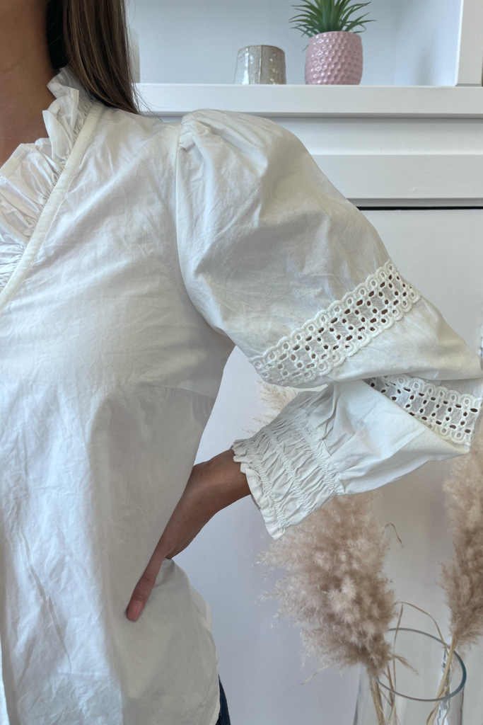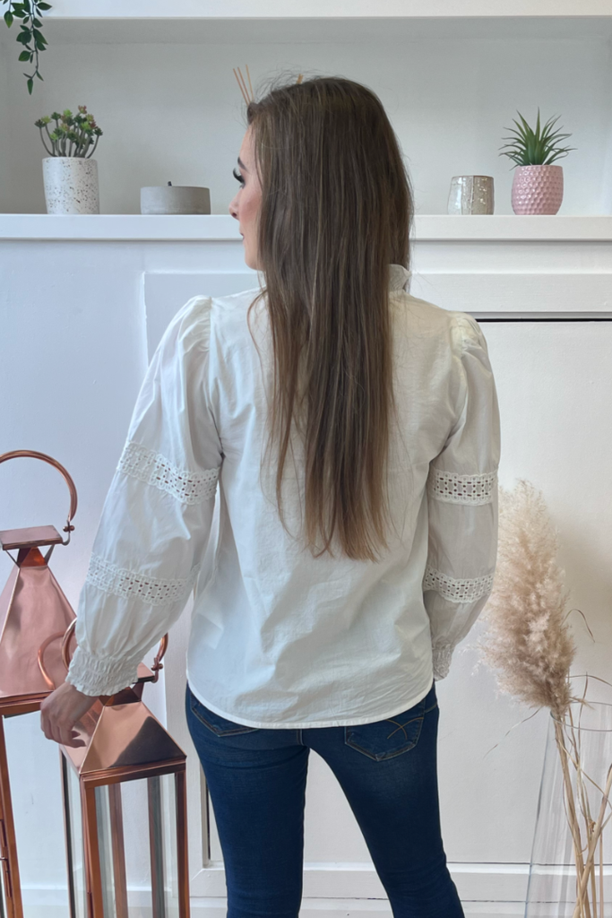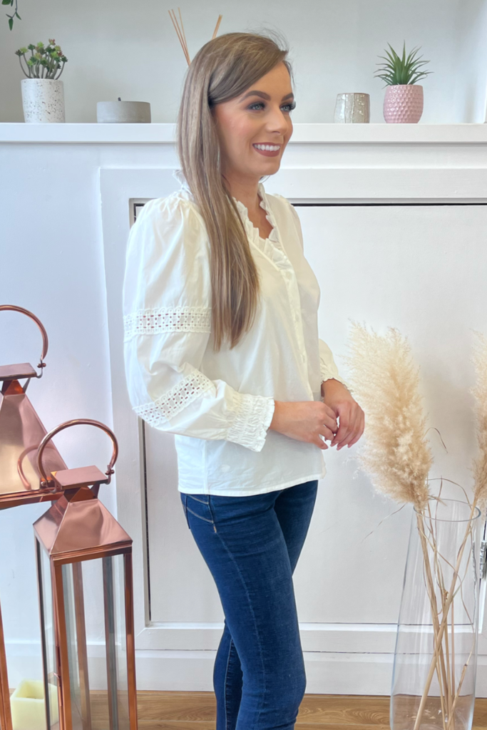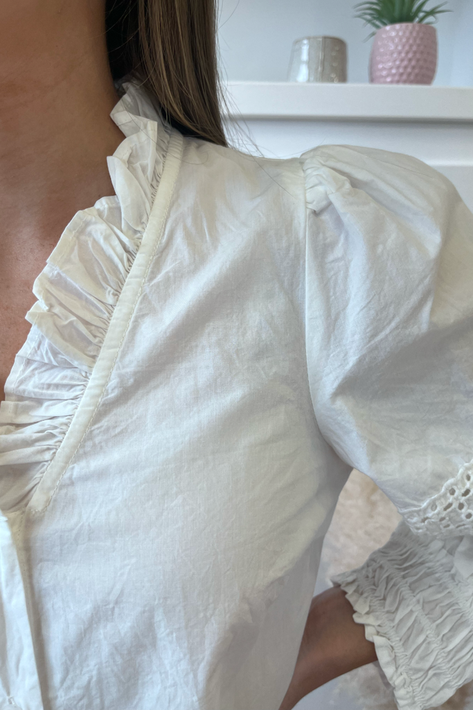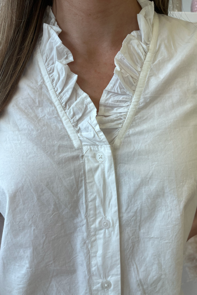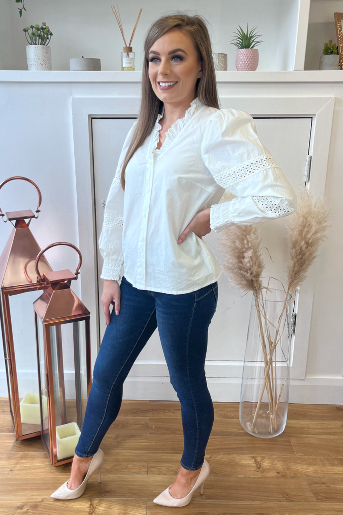 Crisp white button down blouse with ruffled V neckline, full length sleeves with embroidered detailing and elasticated cuff. Lightweight material.