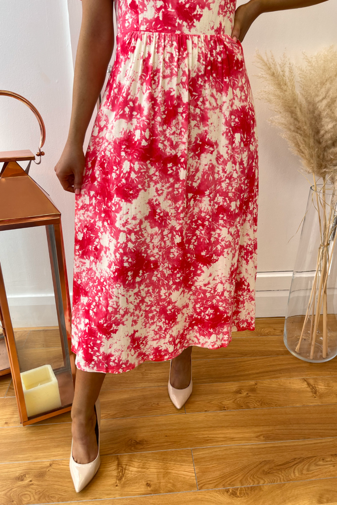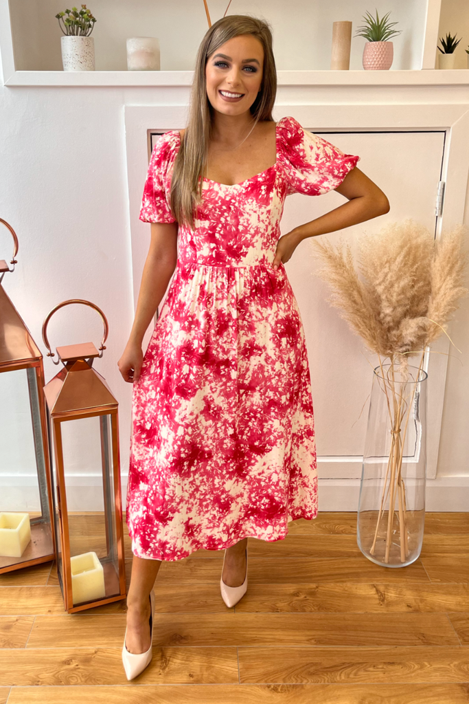 Stunning raspberry and white printed, midi length dress. Feature a flattering neckline, short puff sleeves and elasticated shoulder and back for comfort. Concealed zip closure at the back and fully lined.