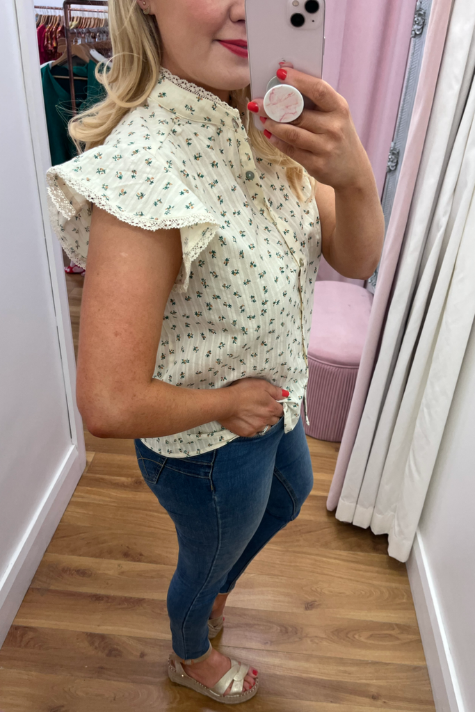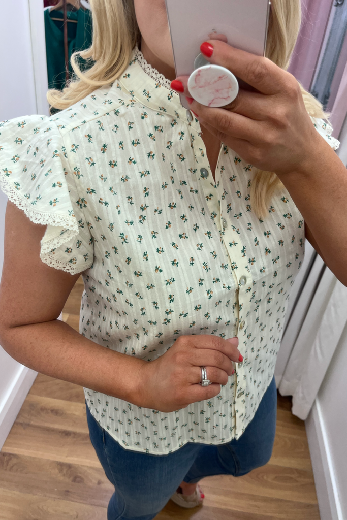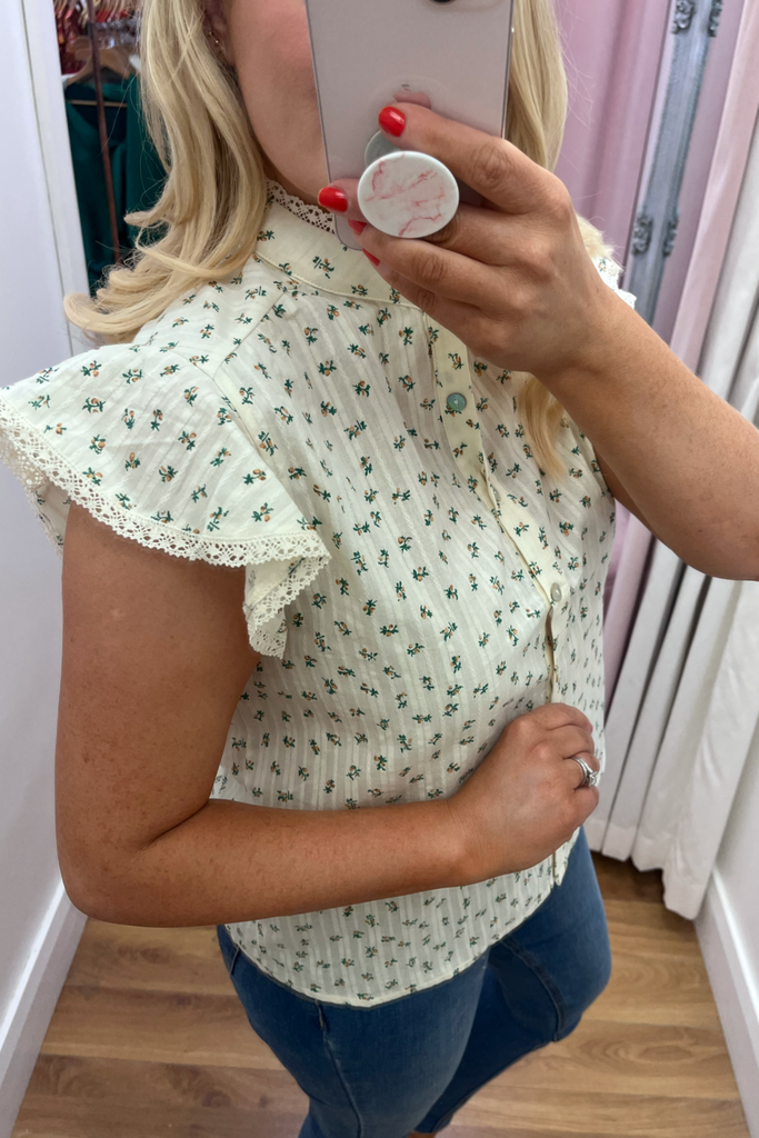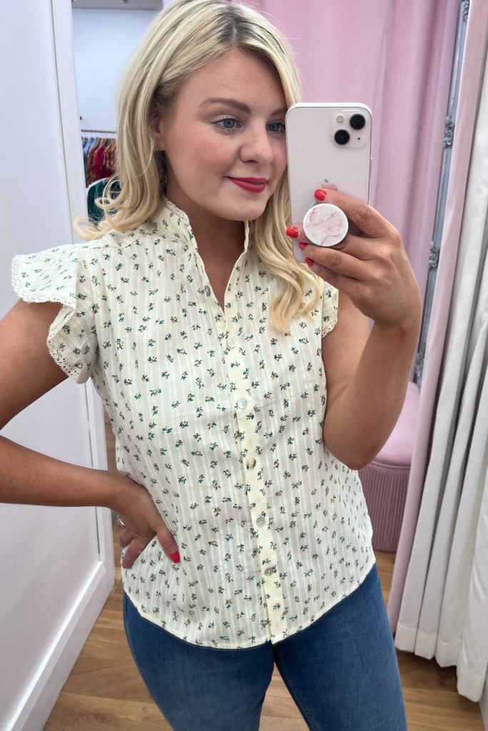 Soft cream blouse with delicate floral print. Features feminine flutter cap sleeve and embroidery. It has a slightly raised neckline and button down front