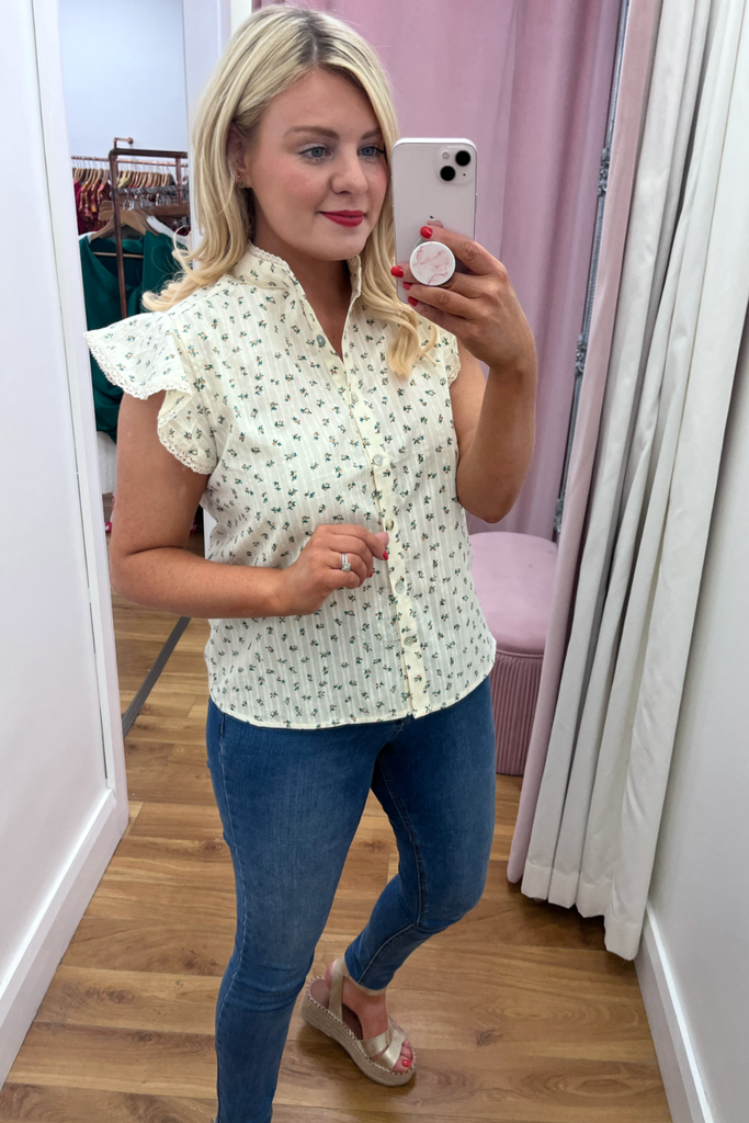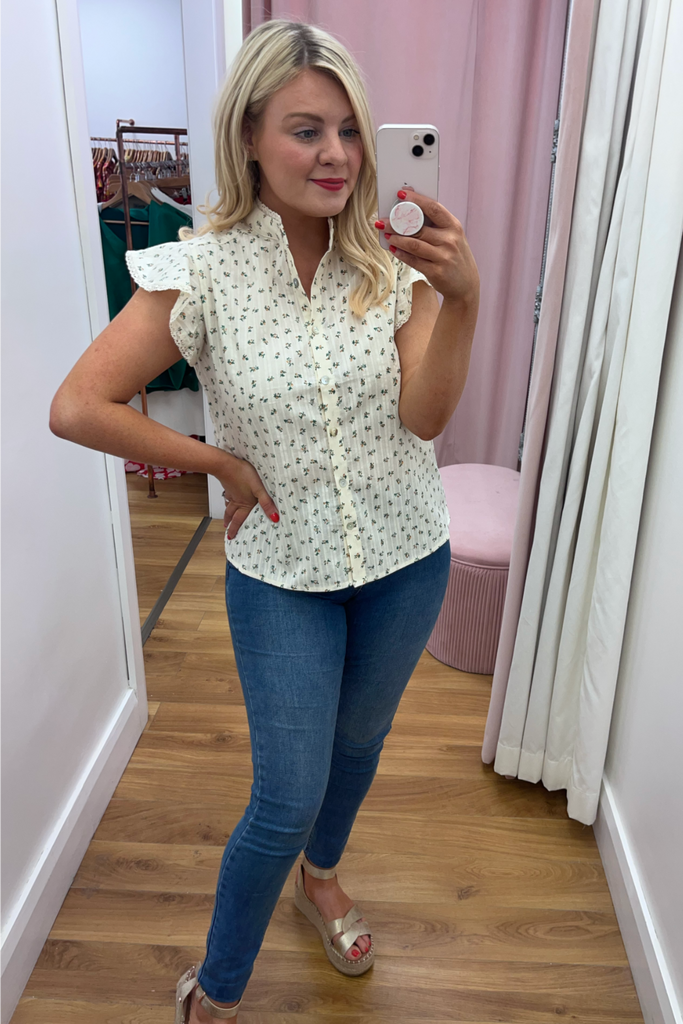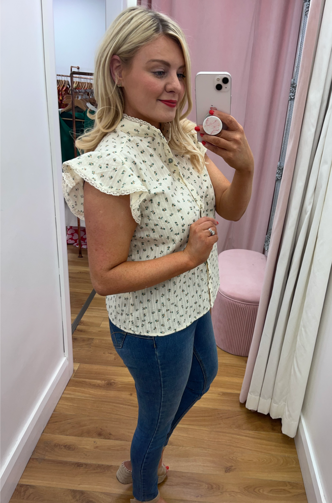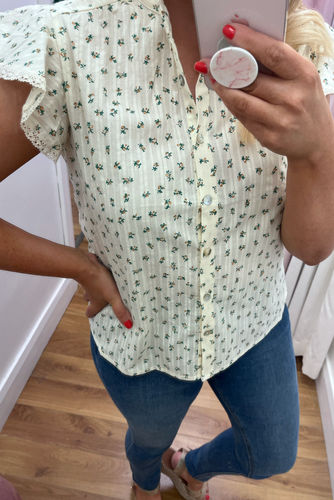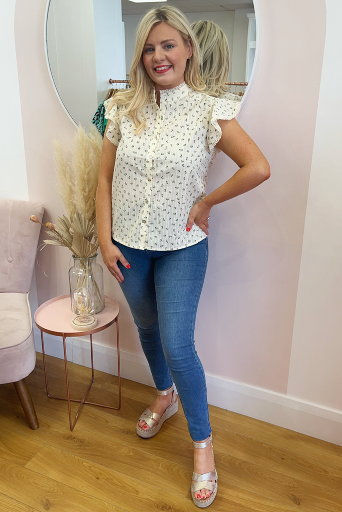 Soft cream blouse with delicate floral print. Features feminine flutter cap sleeve and embroidery. It has a slightly raised neckline and button down front