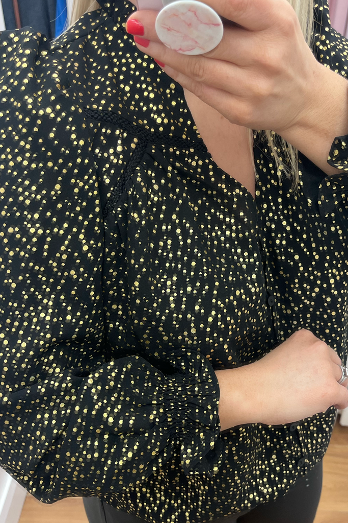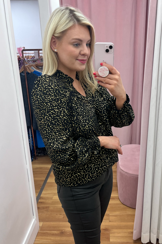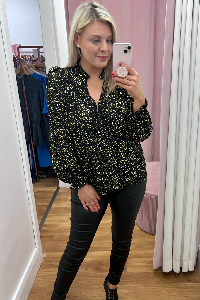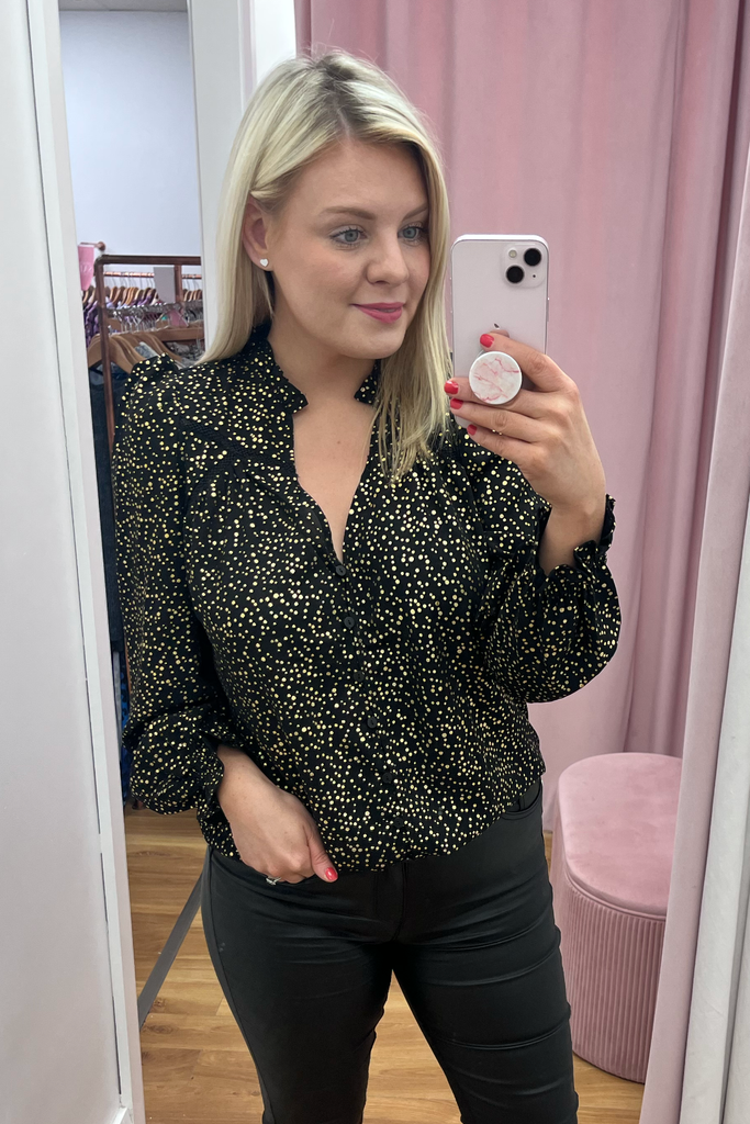 Stunning blouse in a jet black with gold metallic polka dots throughout. Features a V-neckline and slightly raised ruffled neckline to the side and back. It has full length balloon sleeves with elasticated peplum cuff, and button at the bust.
