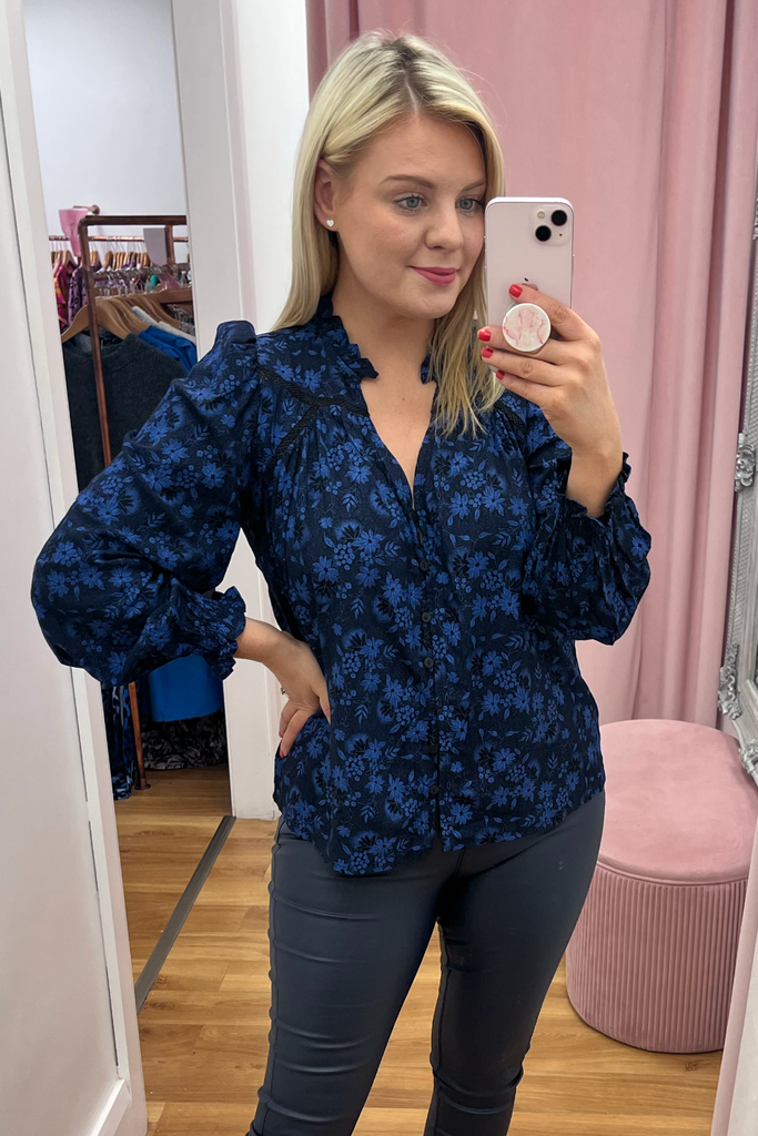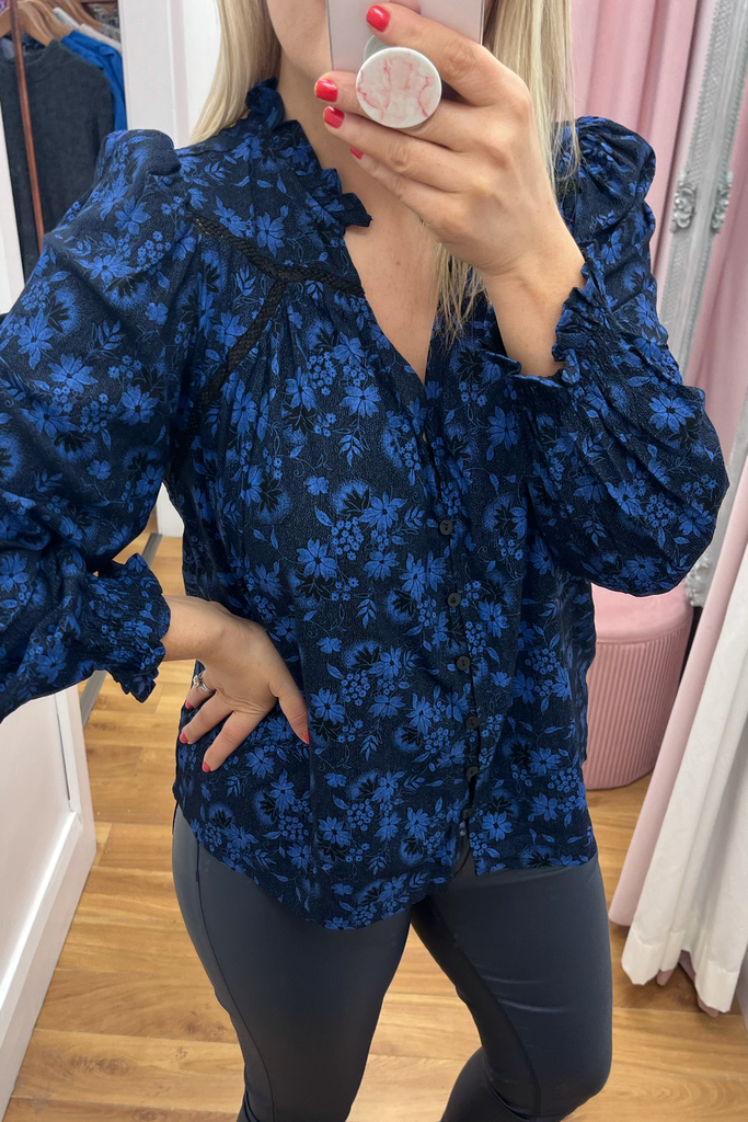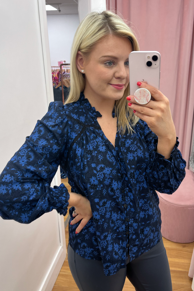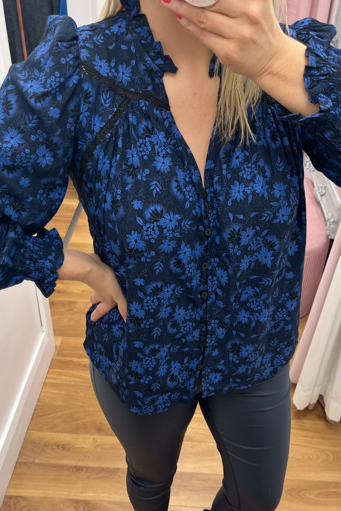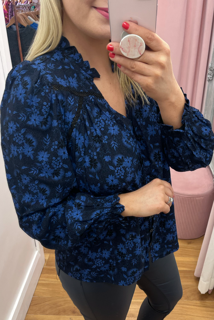 Stunning blouse in a black with striking blue and navy floral throughout. Features a V-neckline and slightly raised ruffled neckline to the side and back. It has full length balloon sleeves with elasticated peplum cuff, with lace detail and and button at the bust.