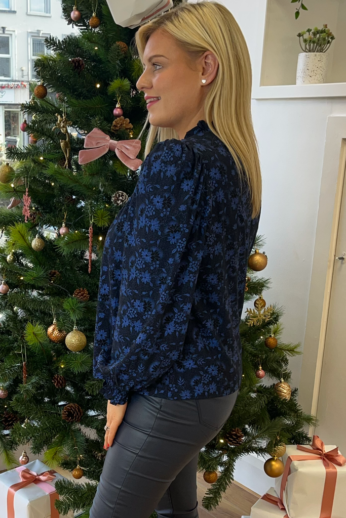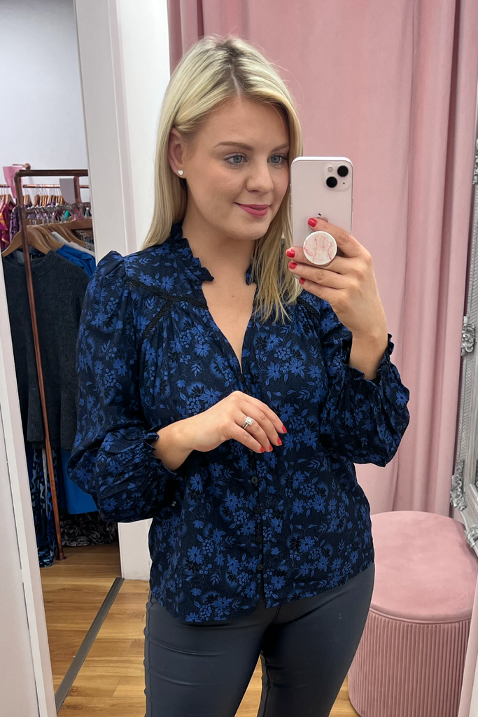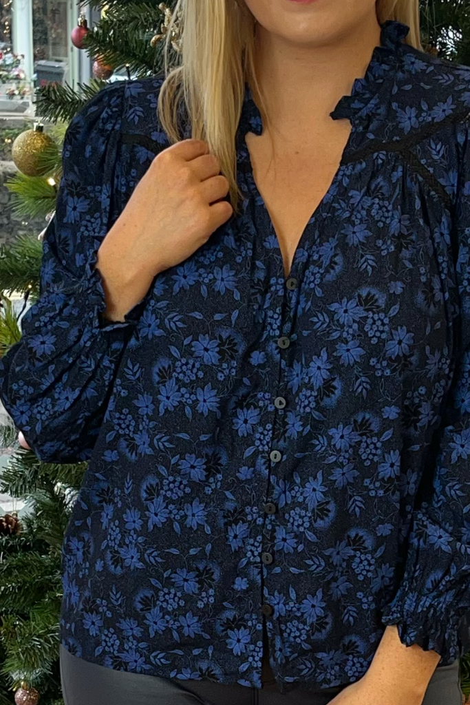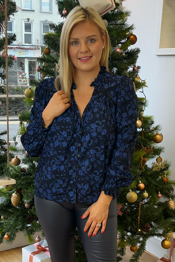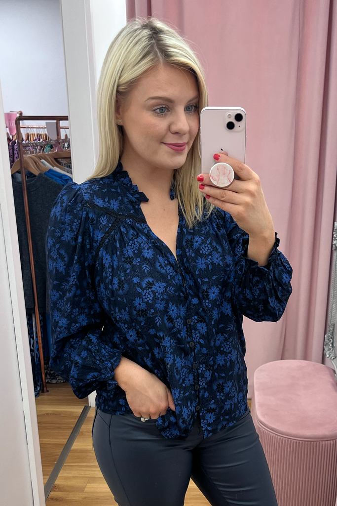 Stunning blouse in a black with striking blue and navy floral throughout. Features a V-neckline and slightly raised ruffled neckline to the side and back. It has full length balloon sleeves with elasticated peplum cuff, with lace detail and and button at the bust.