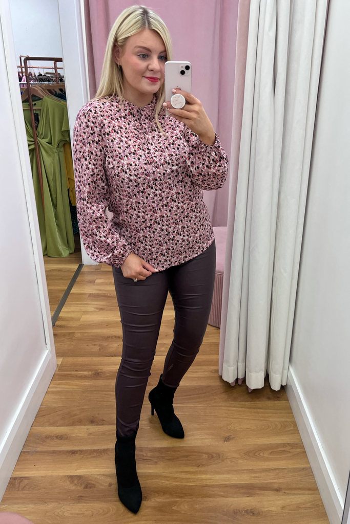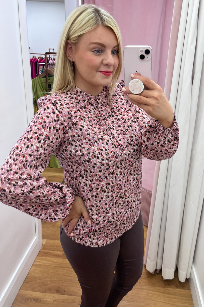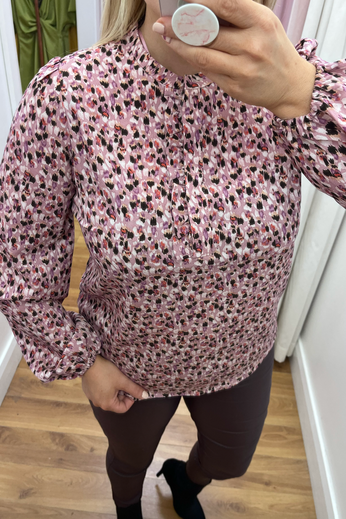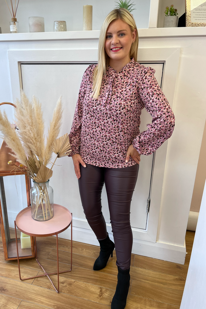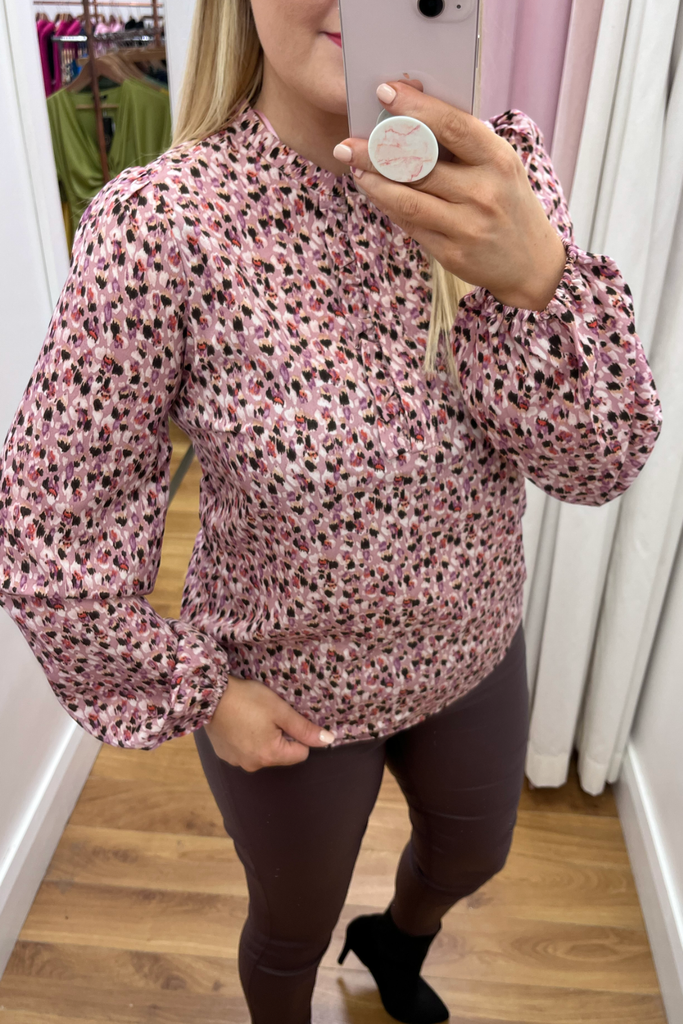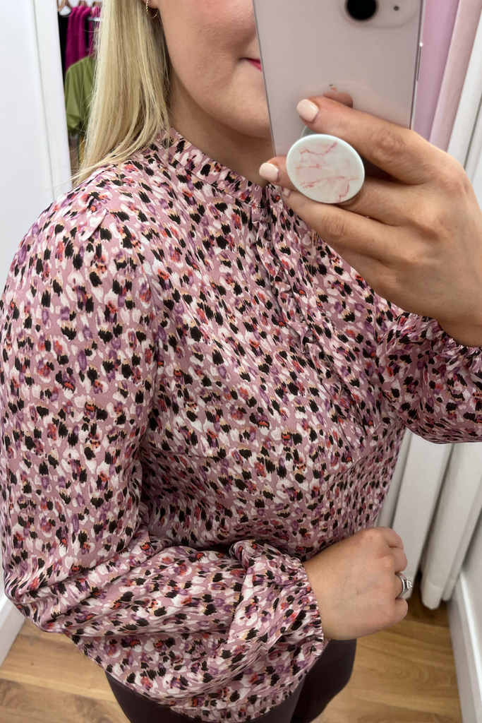 Soft pink base with a mix of purple and burgundy. The top features a soft ruffle and button detail on the top half. With elasticated cuffs.
