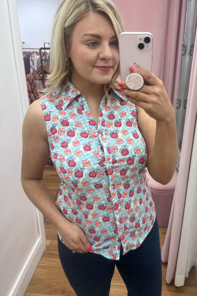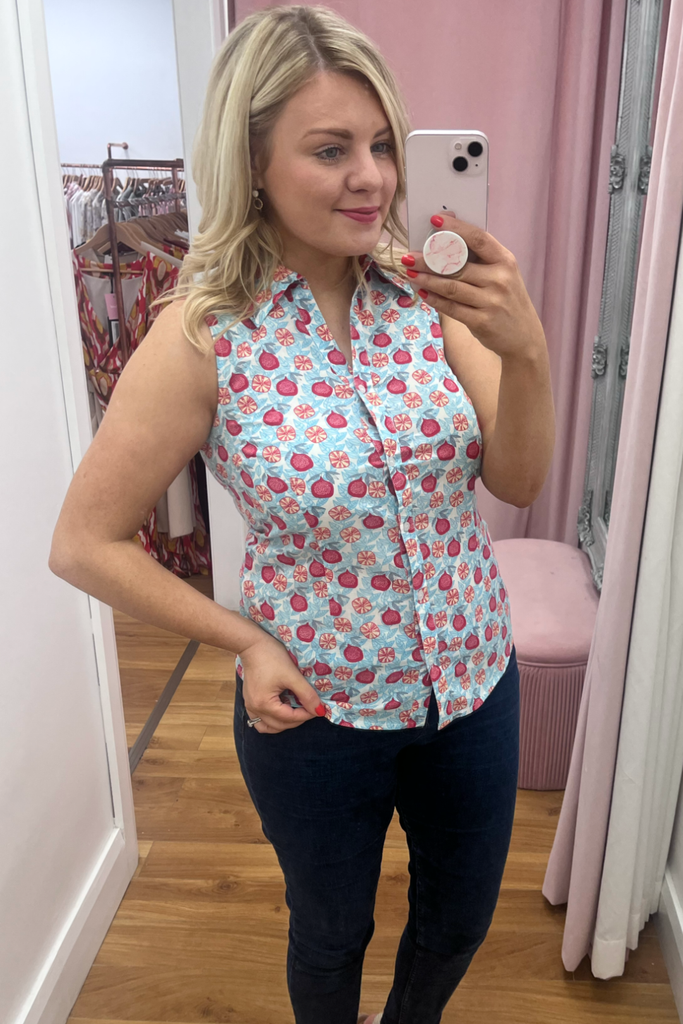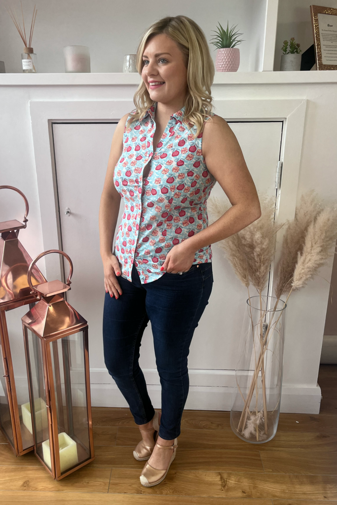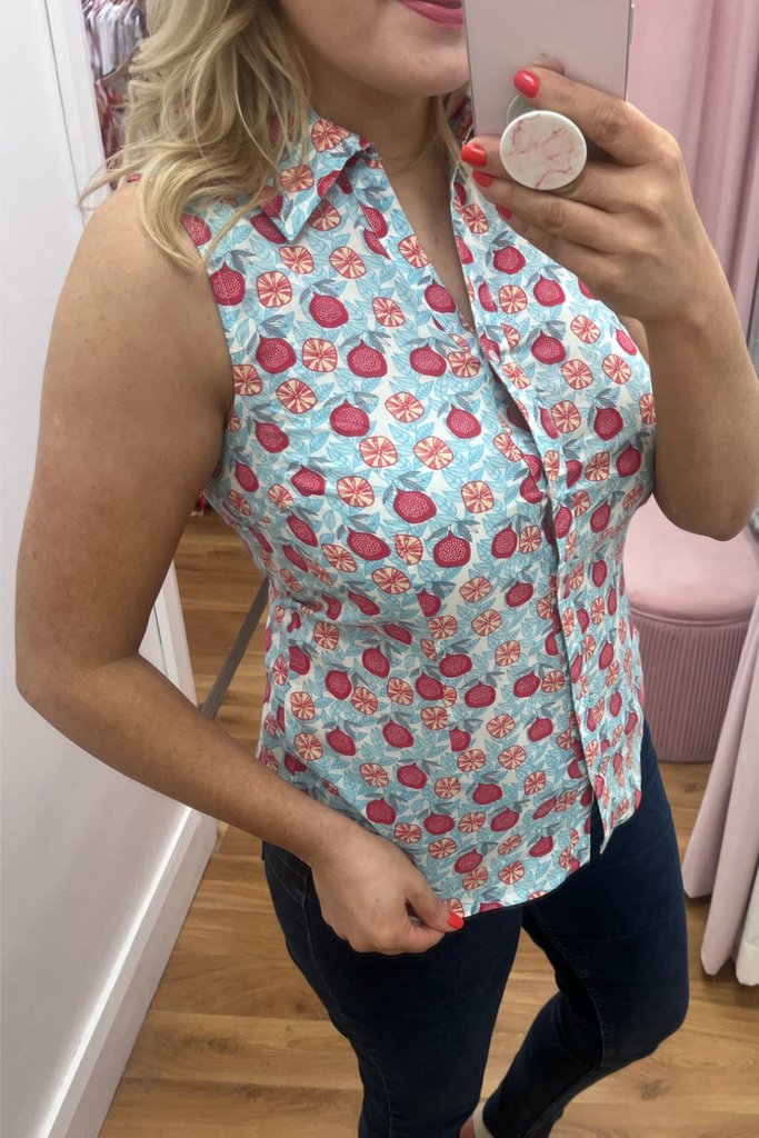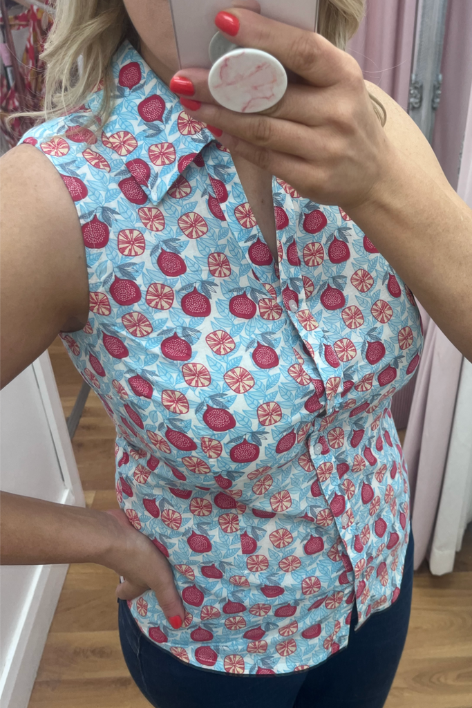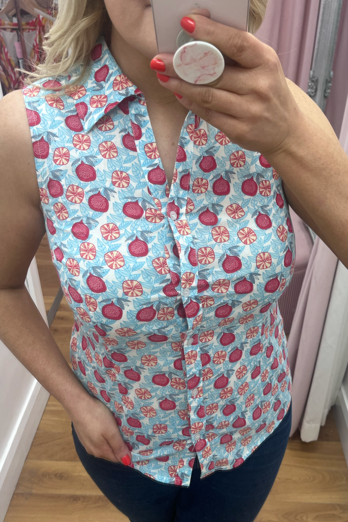 Blue, red and orange printed collared blouse on a white base. Features a V-neckline and buttoned front. Perfectly paired with denims and a trainer, wedge or heel.