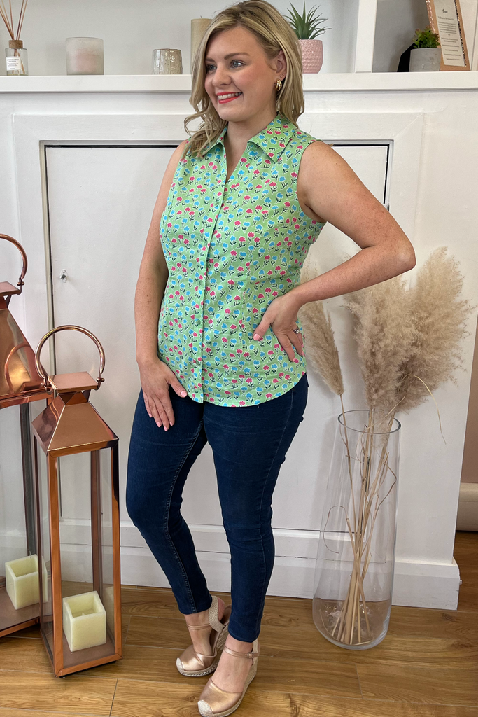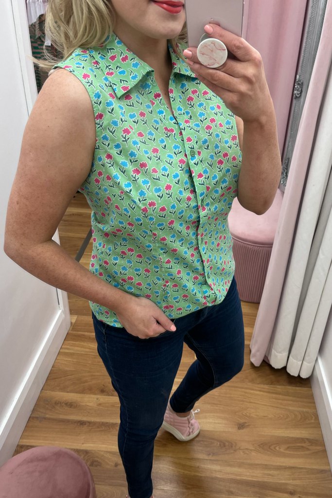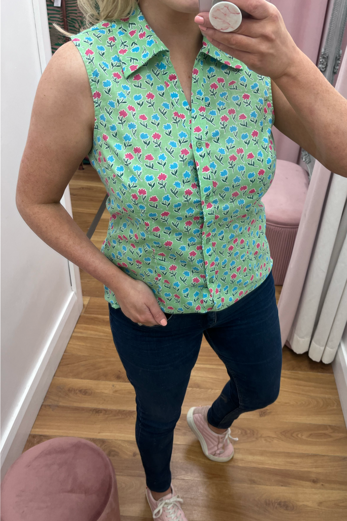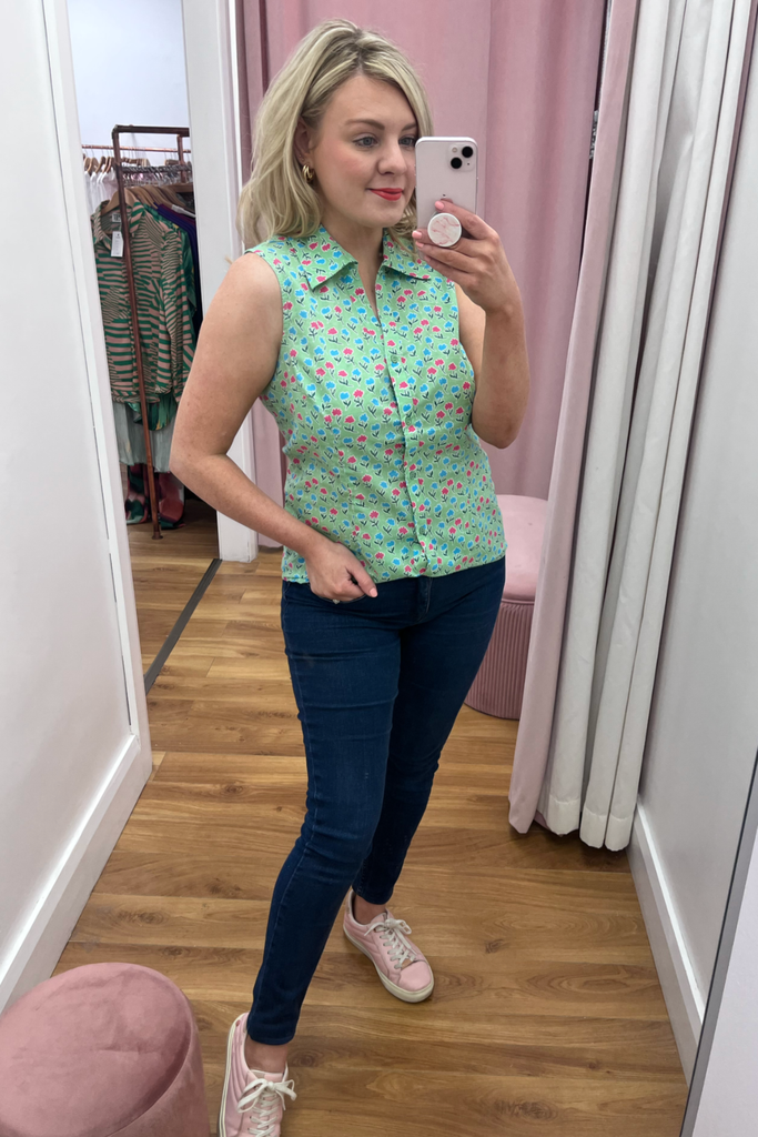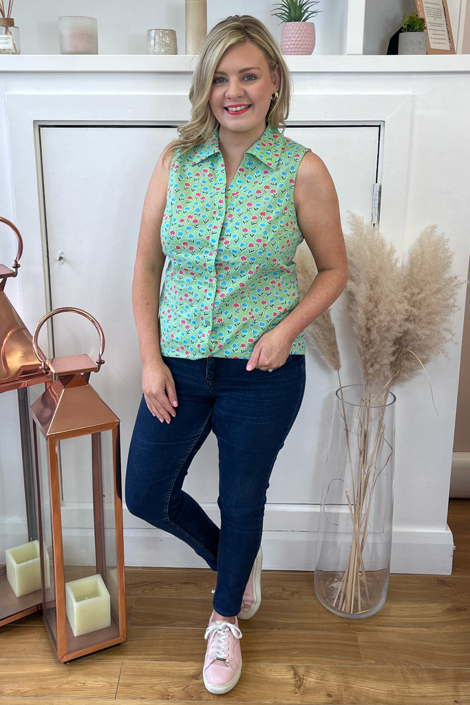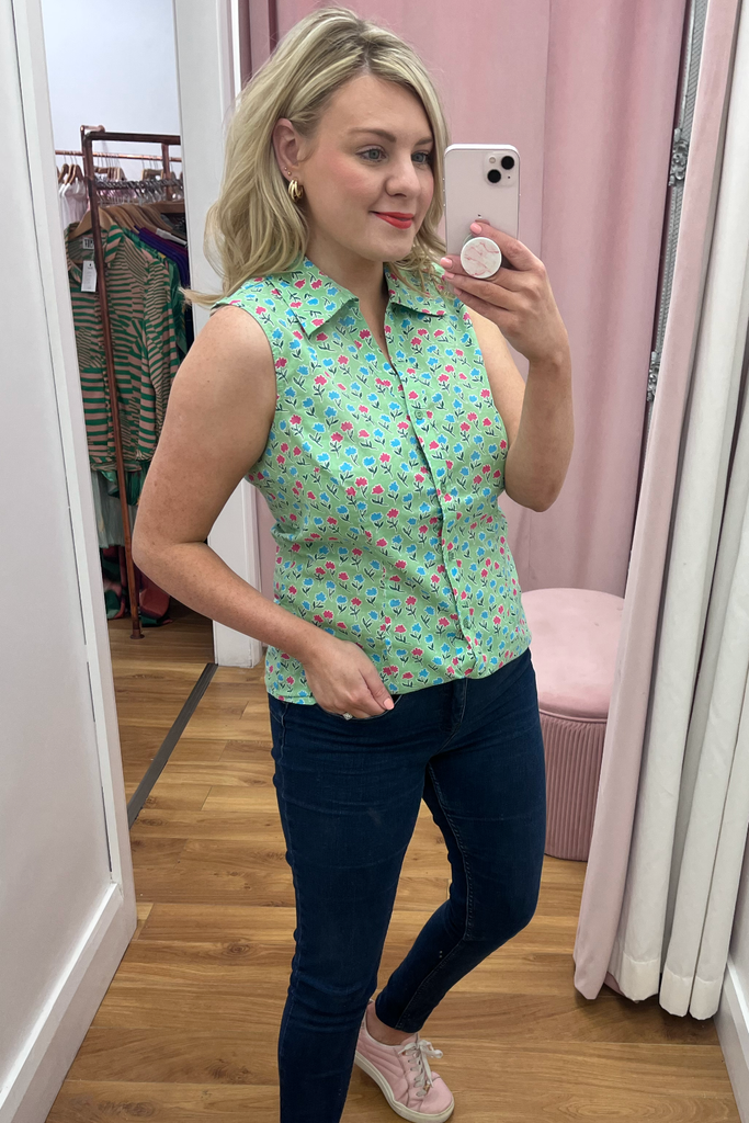 Soft green collared blouse with pink and blue floral print. Features a V-neckline and buttoned front. Perfectly paired with denims and a trainer, wedge or heel.