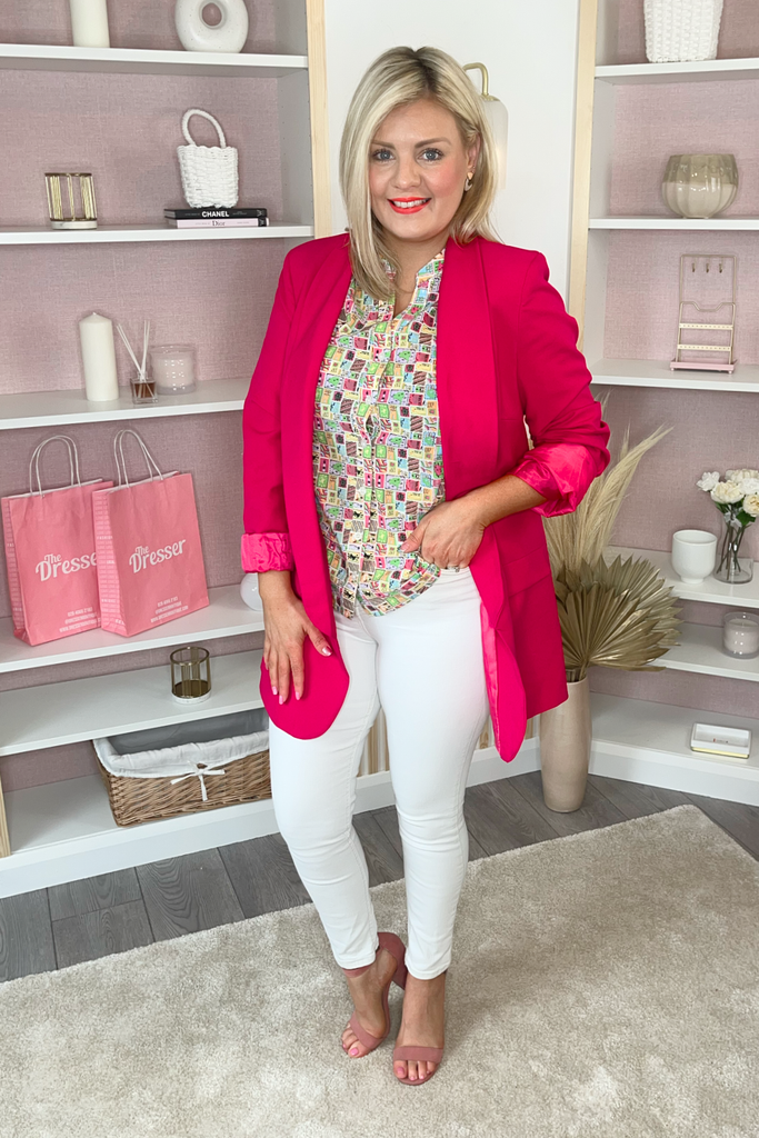 Printed V-neck blouse with buttoned front and half sleeve. Perfectly paired with denims and a trainer, wedge or heel.