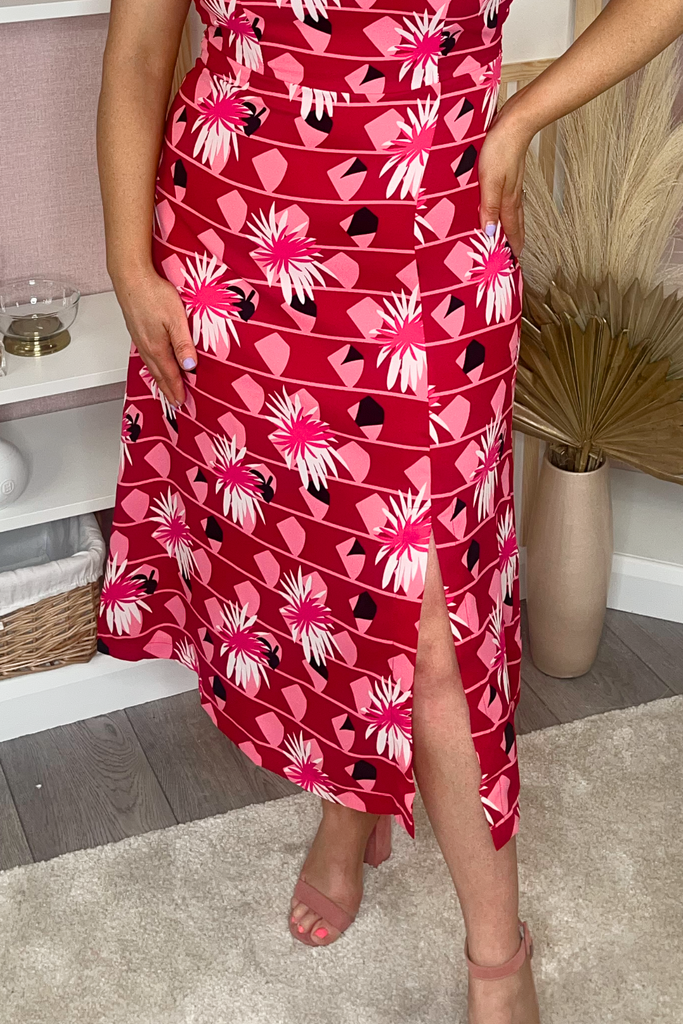Vibrant printed midi dress with square neckline and half puff sleeves. The waist band is fitted, with a split to the front of the skirt. This style is lined and zips to the back