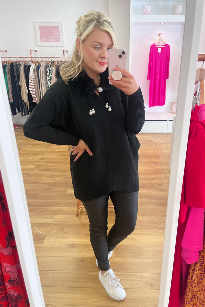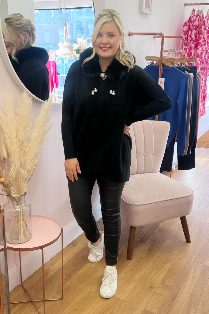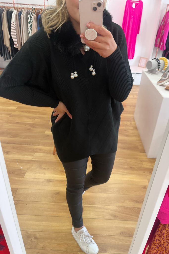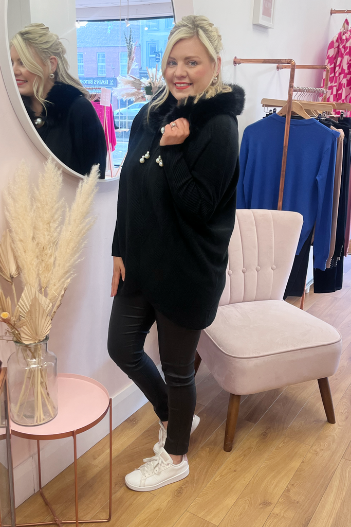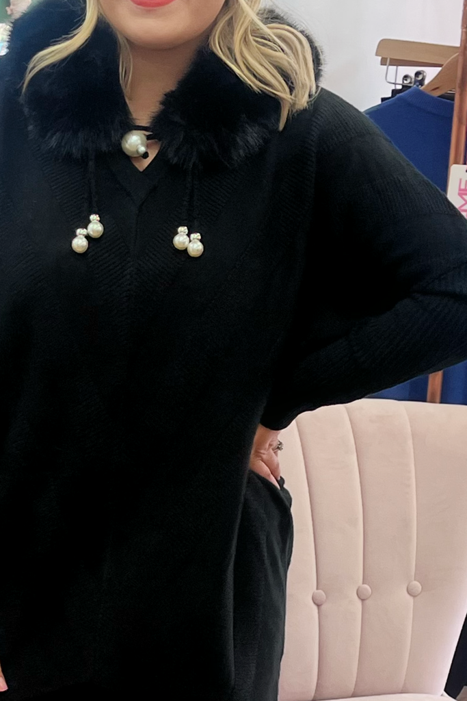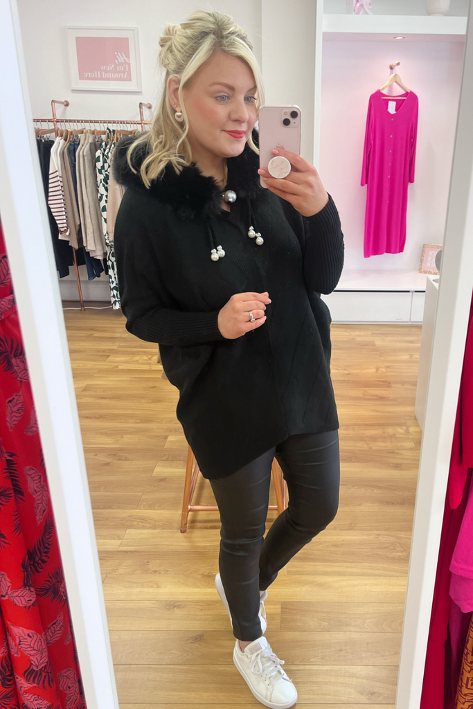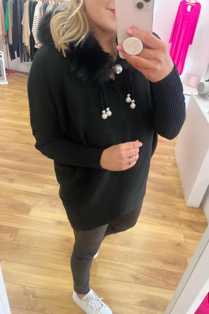 Super soft longline jumper with faux fur trim hood and pearl detail. The hood has a faux fur detachable trim and the hemline dips to the back