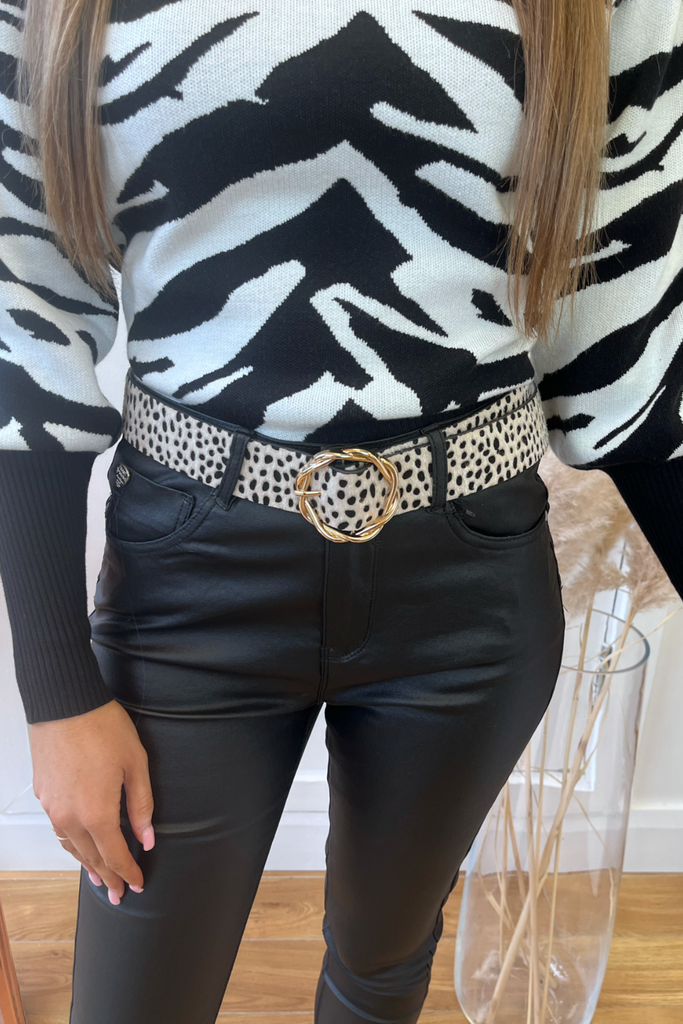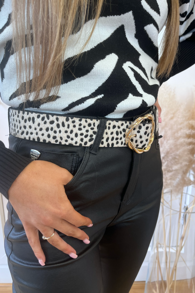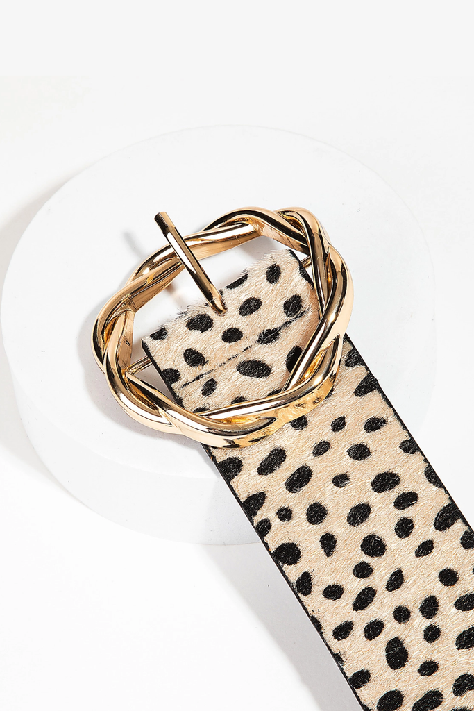 Animal print faux leather waist belt in stone and black, with twisted buckle in gold. Add some detail to every outfit pairing with your jeans or leather looks!