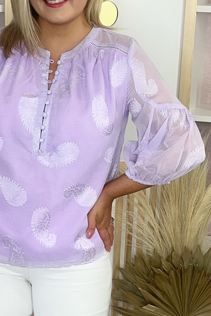 Leaf print blouse with buttoned neckline and balloon half sleeve with elasticated cuffs. This style is lined to the front, with sheer back and sleeves.