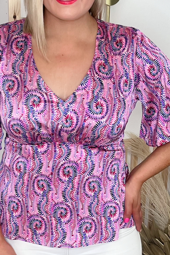 Vibrant satin feel printed blouse with V-neckline, fitted waist, flowy sleeve and peplum style body. This style zips to the back with a keyhole cut out