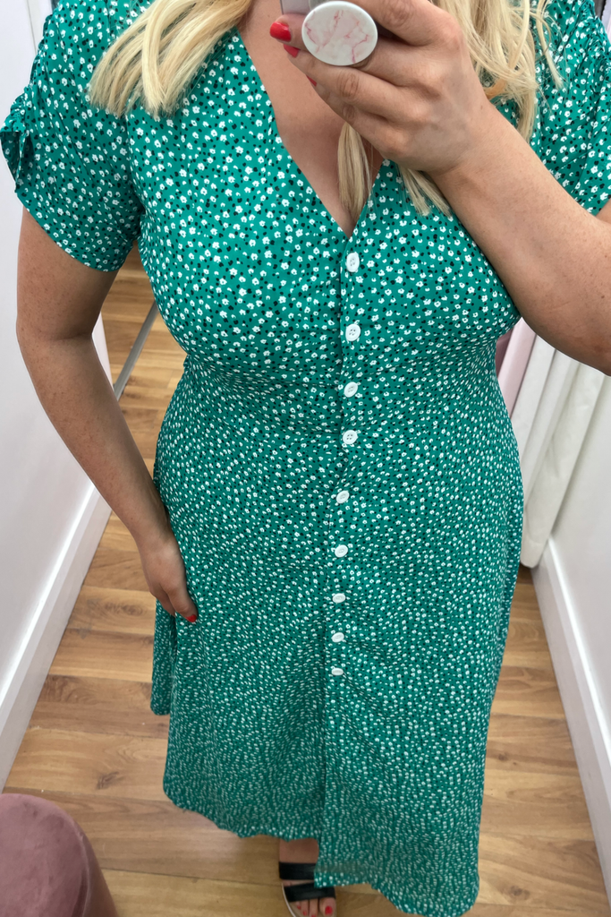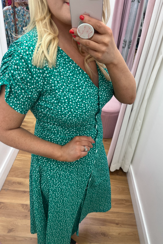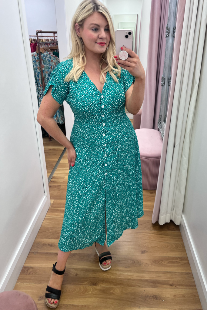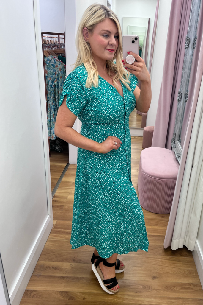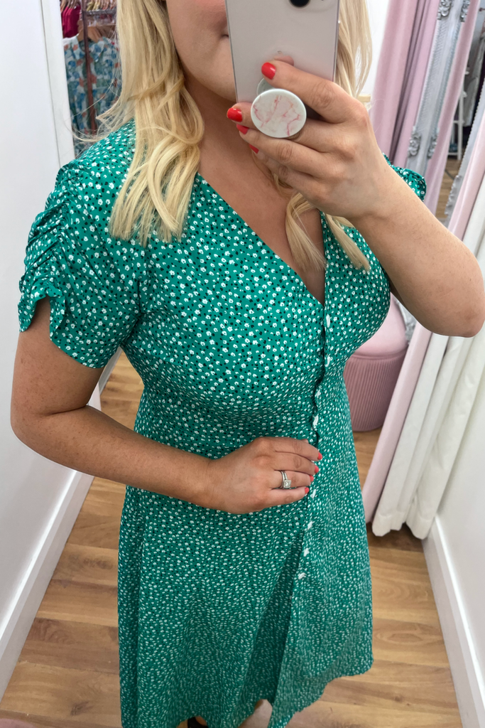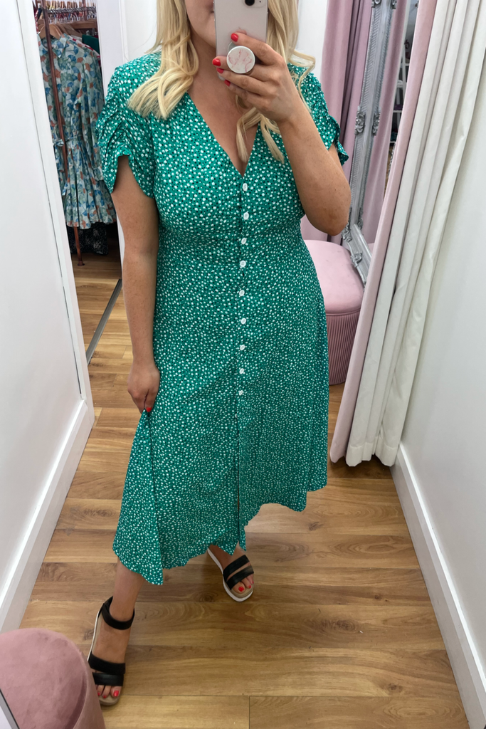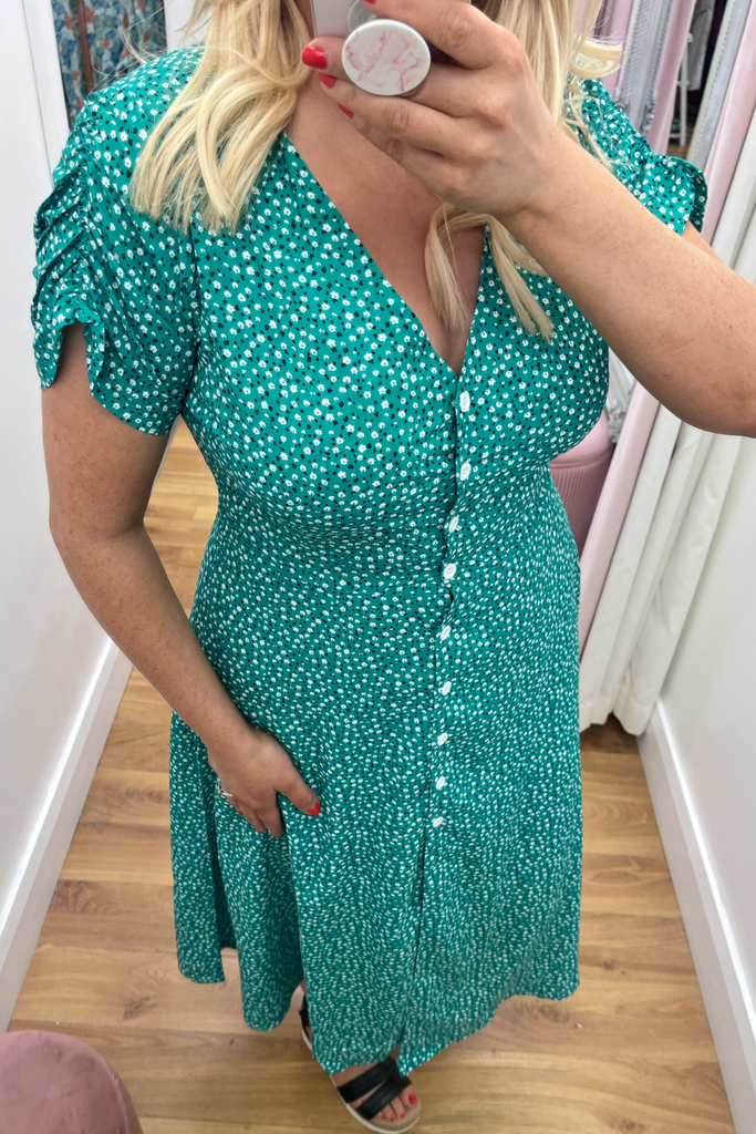 * Best-seller Restocked * Striking printed green dress with V-neckline, fitted waist and A-line skirt. It has front buttons which stop at the knee and gathered dramatic half sleeve. This style is light-weight and unlined