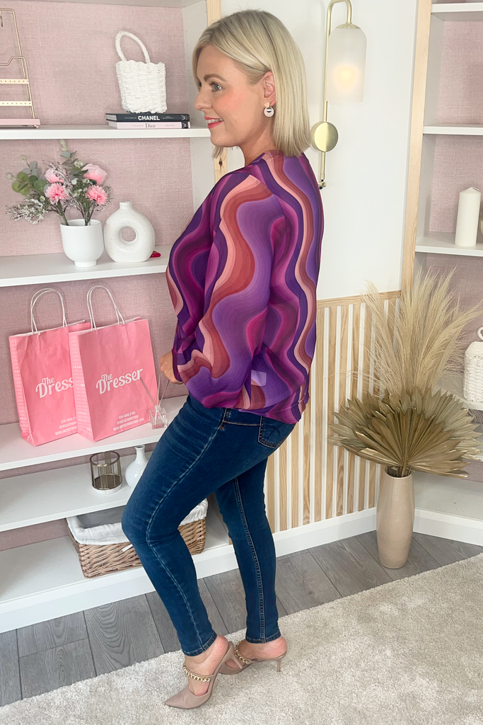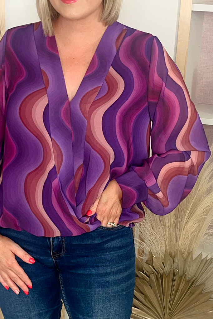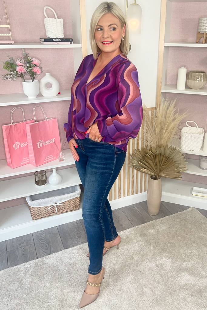 Vibrant printed blouse in a light-weight chiffon with romantic floaty sleeve. Features elasticated waistband to the front and dipped hem to the back, with wrap style neckline that is stitched in place at the bust. This style is lined in the front and semi-sheer to the back and sleeve