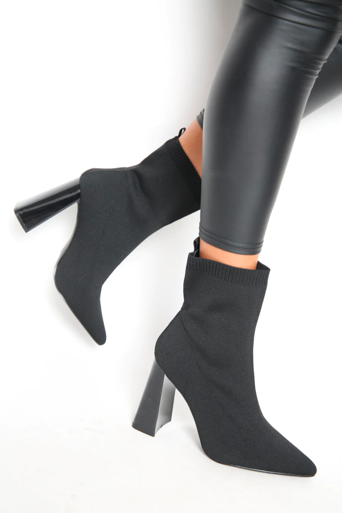 Black pull on sock boots with stretch fabric. Features a a ribbed cuff, pointed toe and a patent-finished block heel for the ultimate glam but also comfort.
