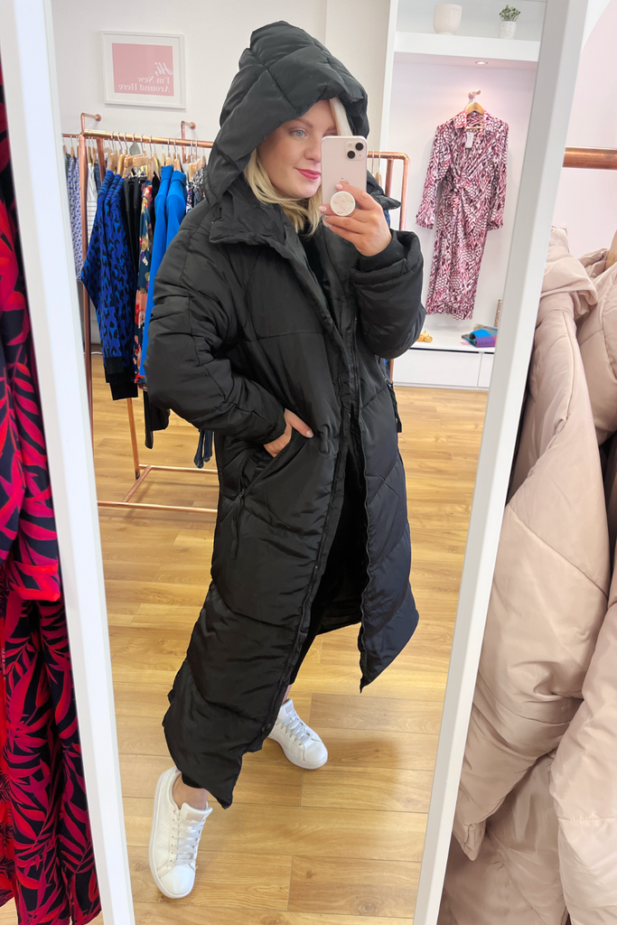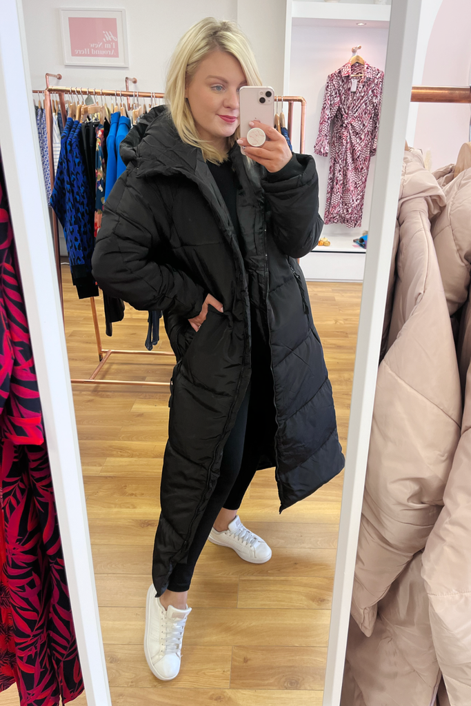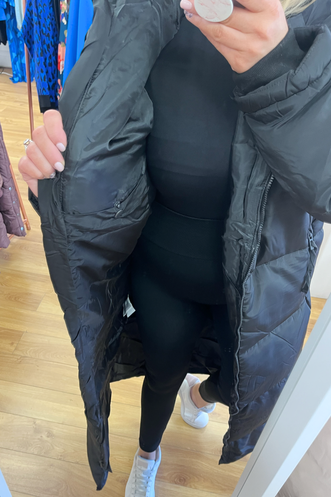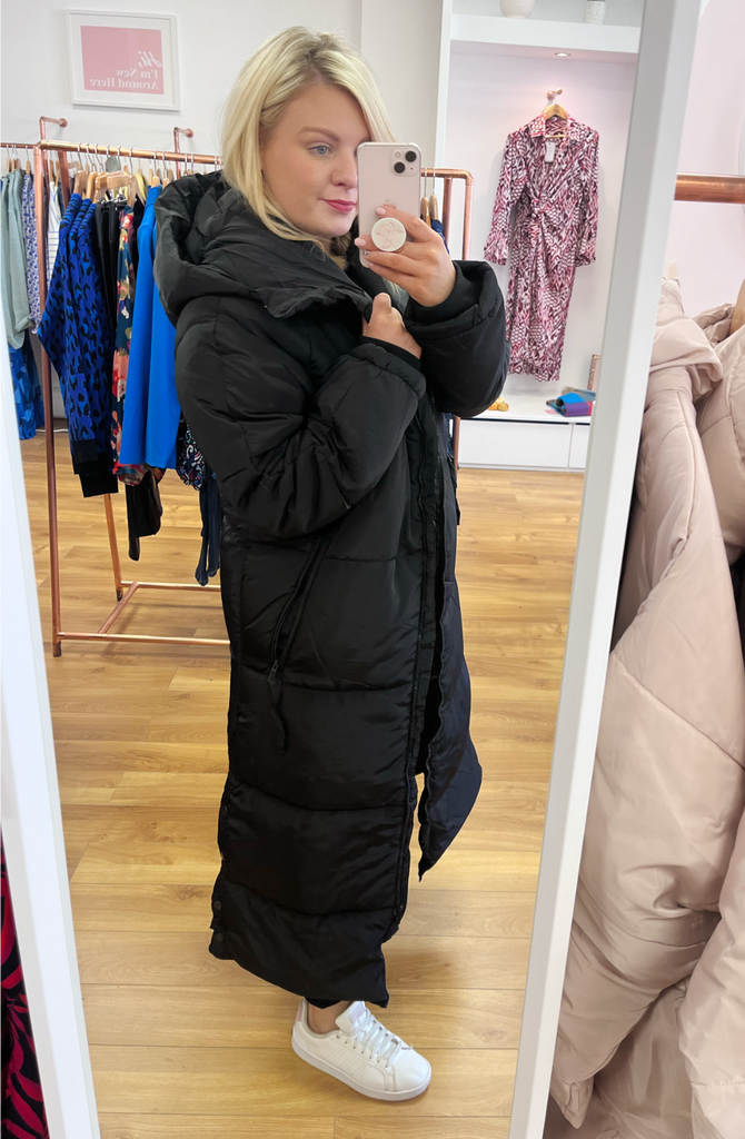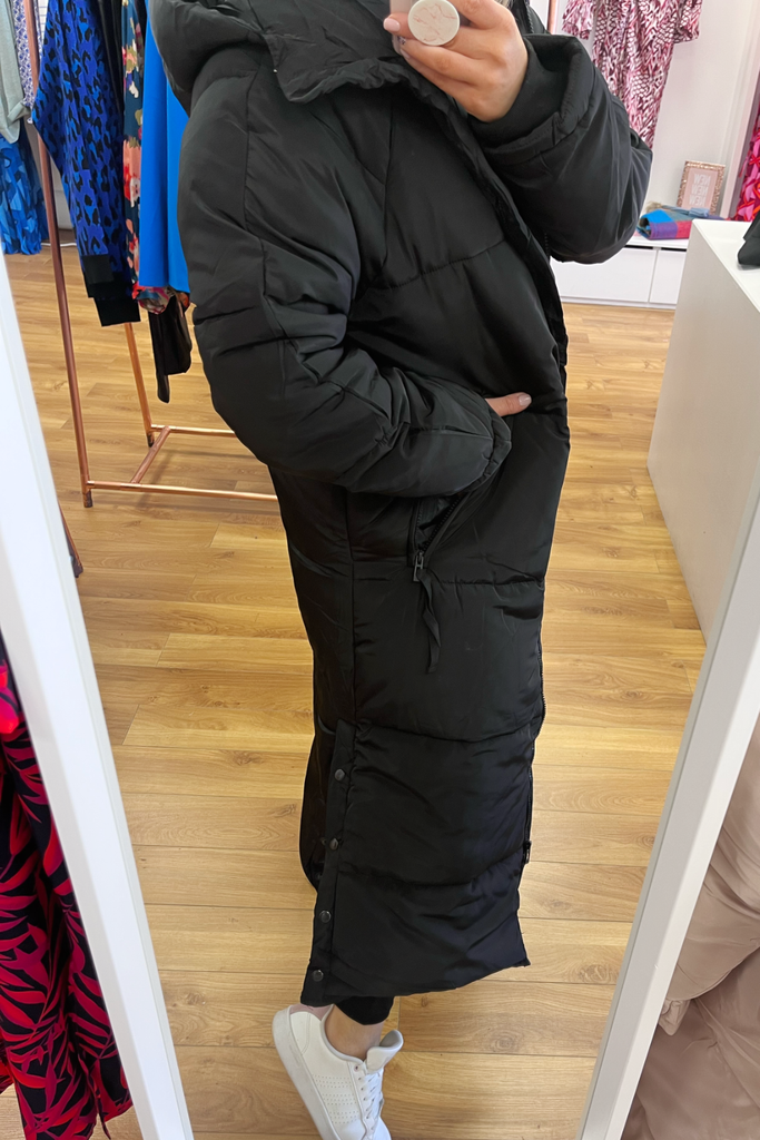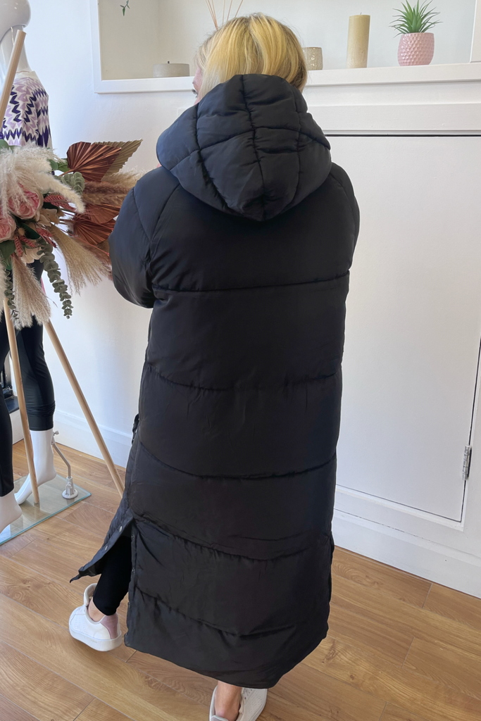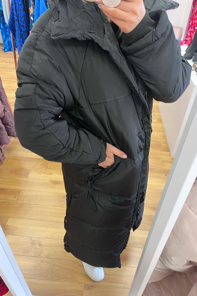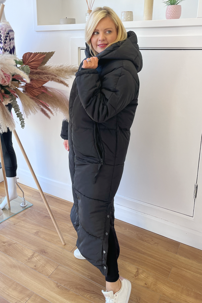 Oversized-longer length padded puffer coat with hood. Features a zip up front, full length sleeves with fitted cuffs, dual pockets with zip closure on the outside and an inside pocket. It has side button detail for great flexibility. Amazing length to give coverage and warmth. Fully lined