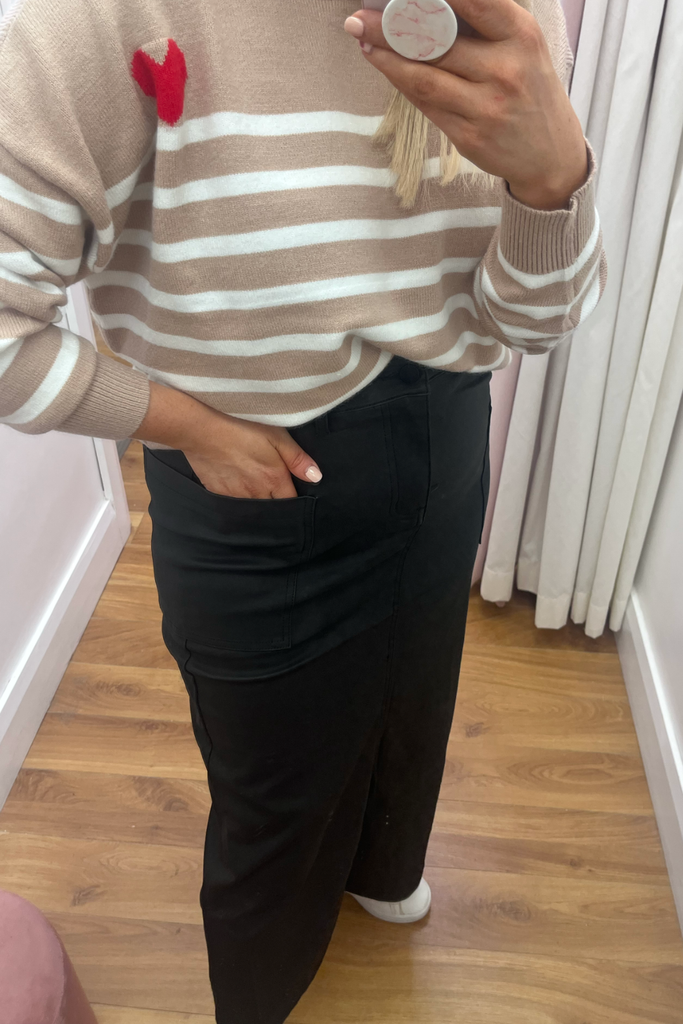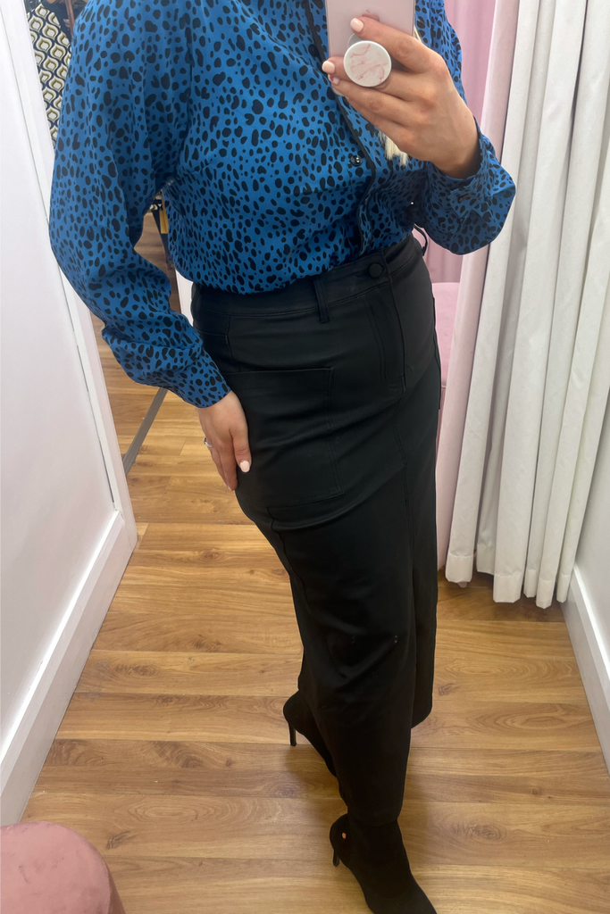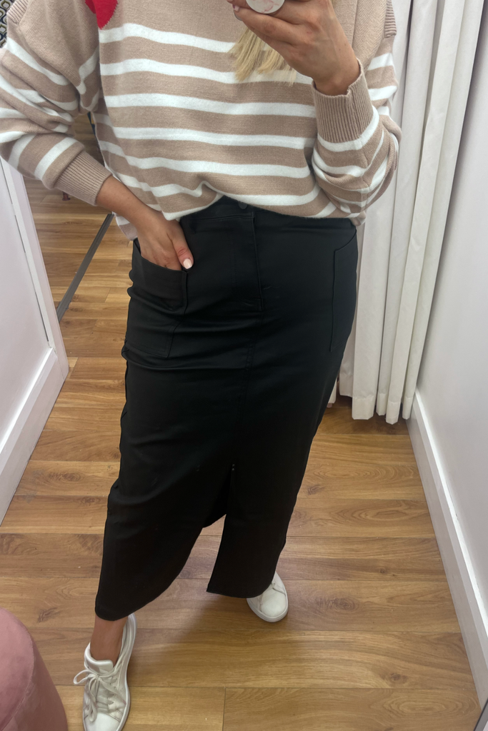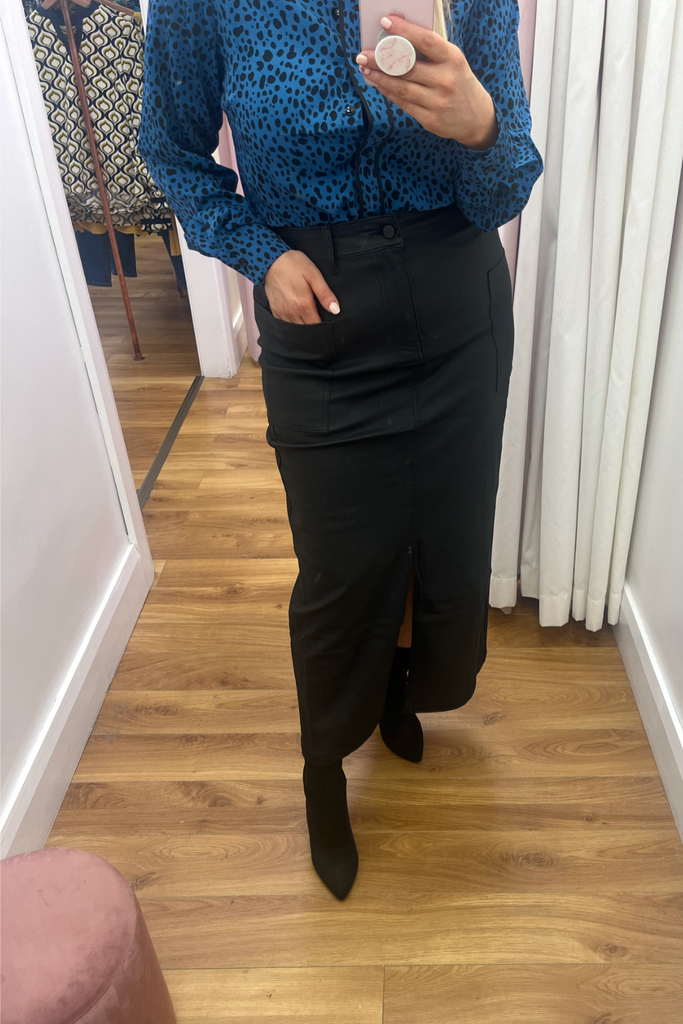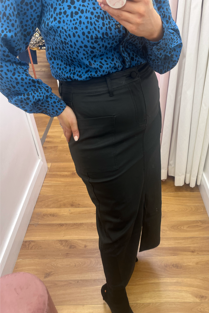 The midi skirt trend continues! This high-waisted style comes in a matte finish leather-look black with front pockets and front split. Perfect with blouses, knitwear and tees!