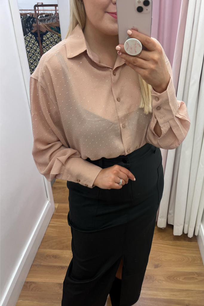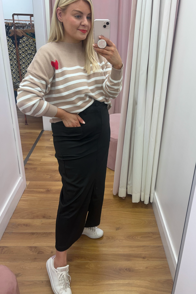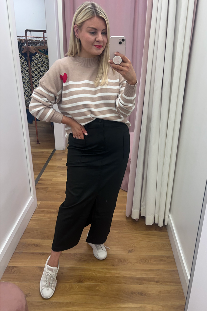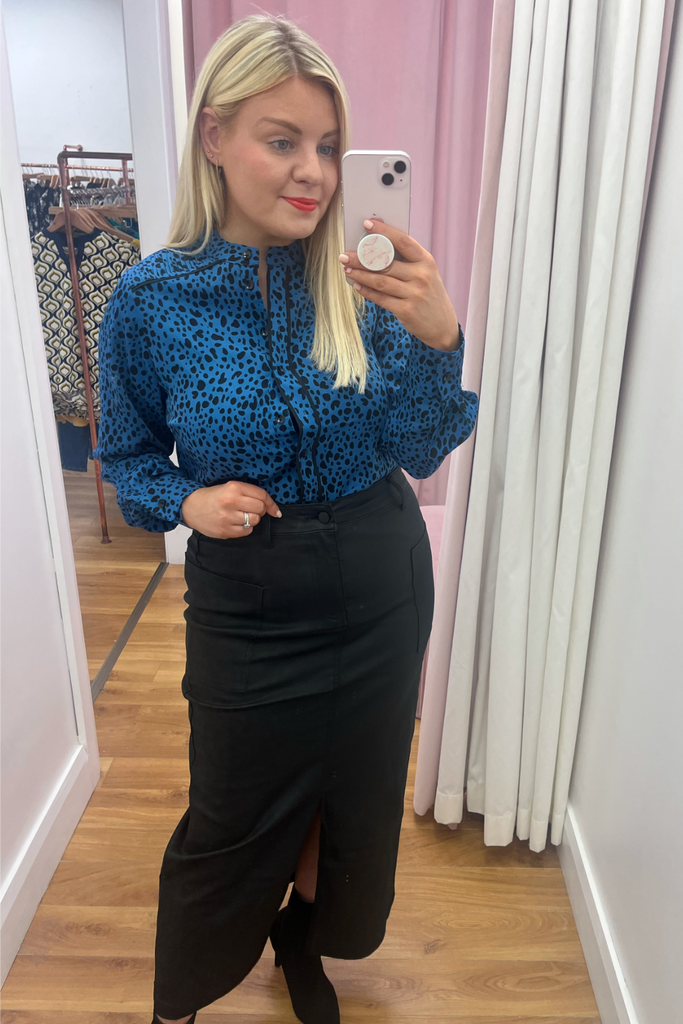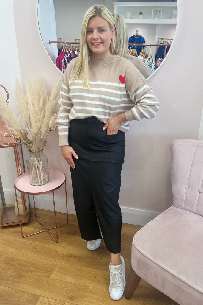 The midi skirt trend continues! This high-waisted style comes in a matte finish leather-look black with front pockets and front split. Perfect with blouses, knitwear and tees!