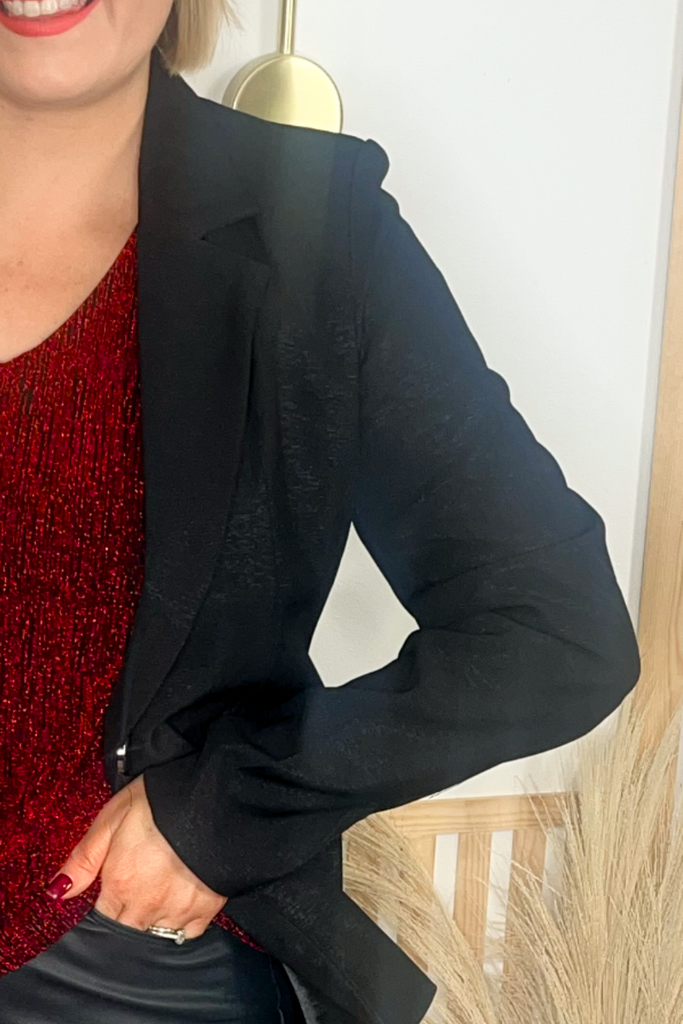 Black sculpted blazer with single button. This style has a subtle glitter effect