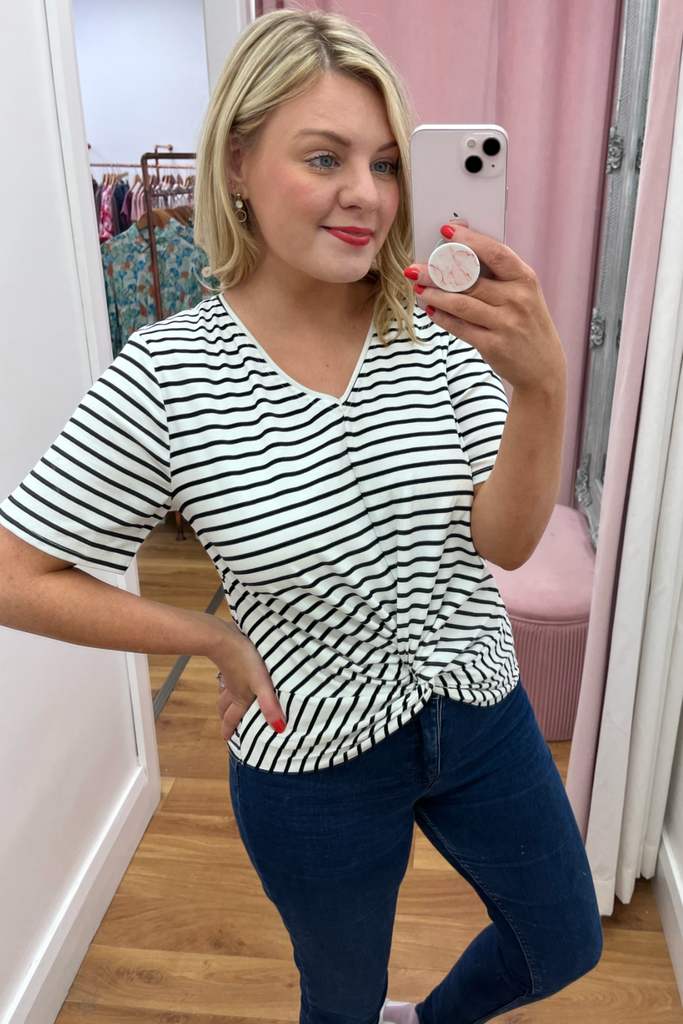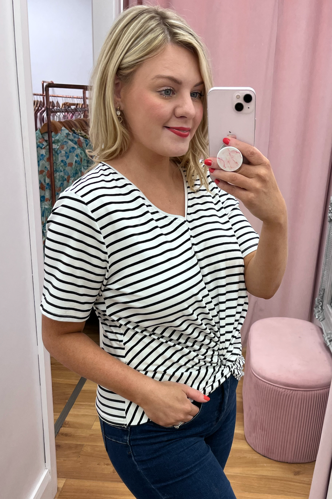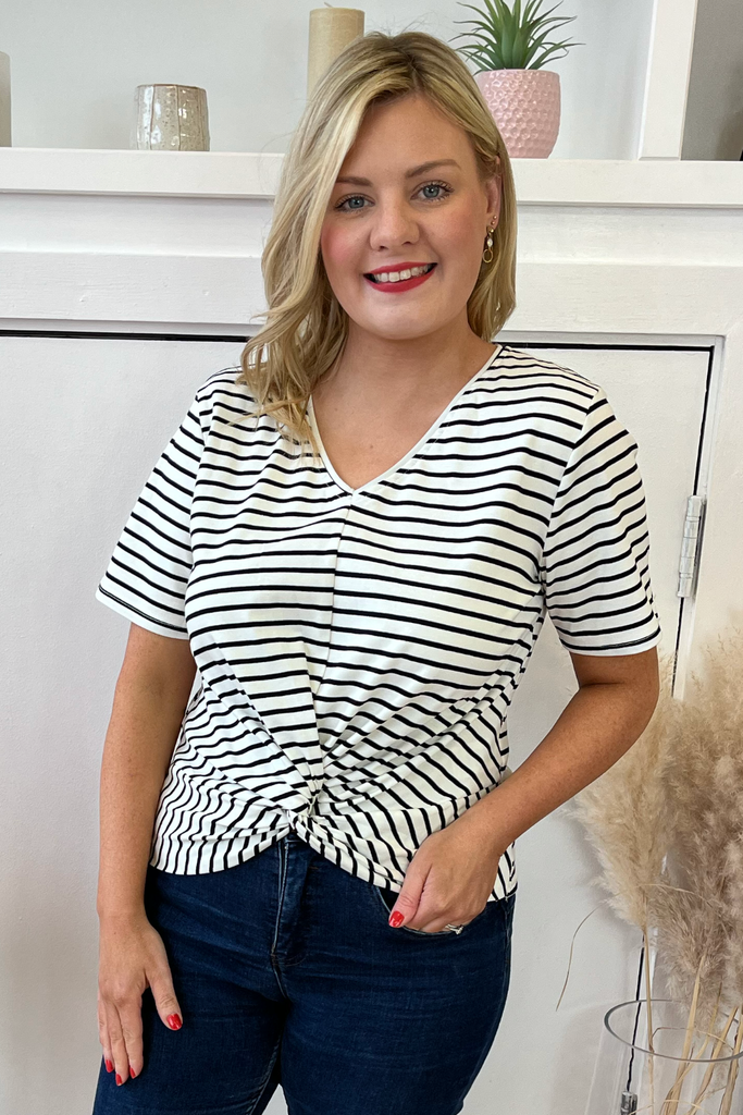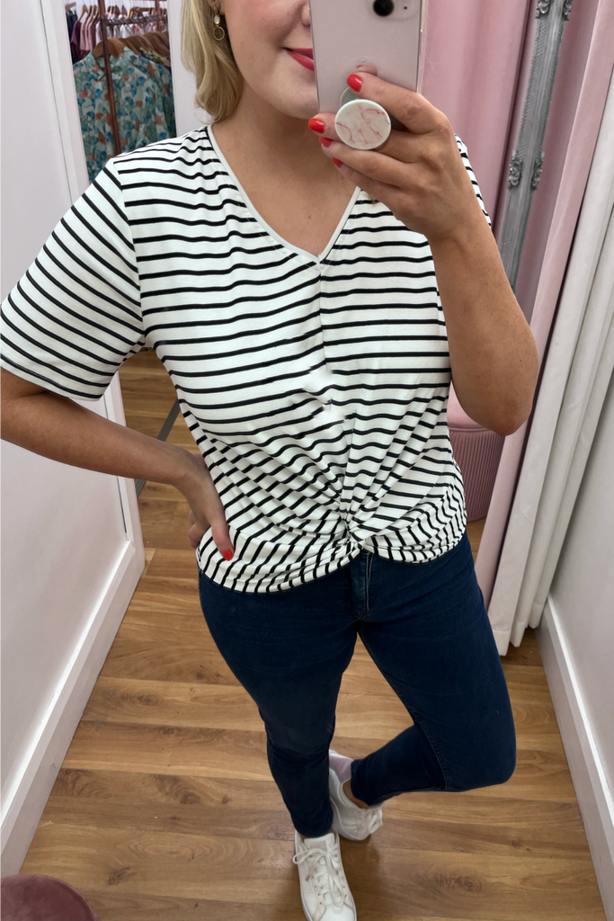 Horizontal stripe tee in black and white with half sleeve and twist front. Perfectly paired with denims and a trainer, wedge or heel.