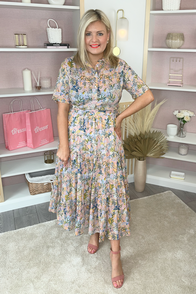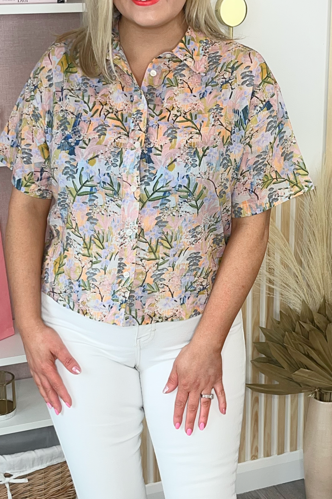 Short sleeve lightweight blouse with collared neck and buttoned front. Perfectly paired with denims and a trainer, or matching skirt.