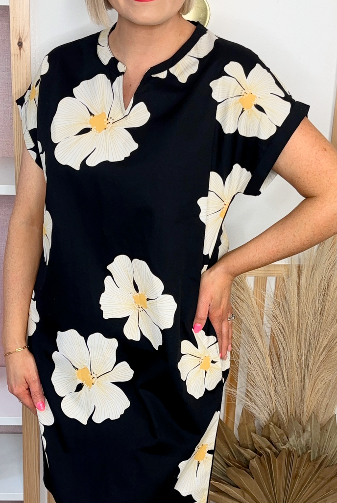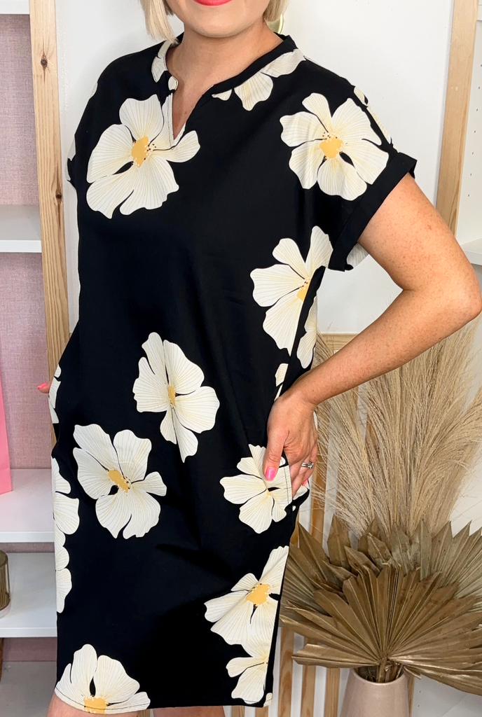 Black V-neck shift dress with half cap sleeve and bold floral print. And pockets! This style is unlined