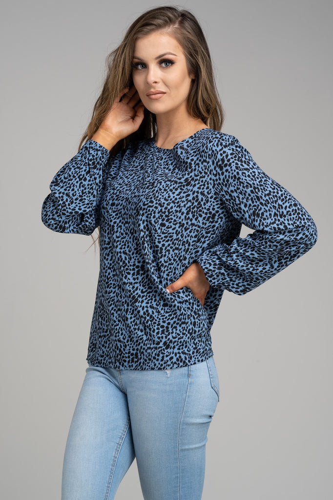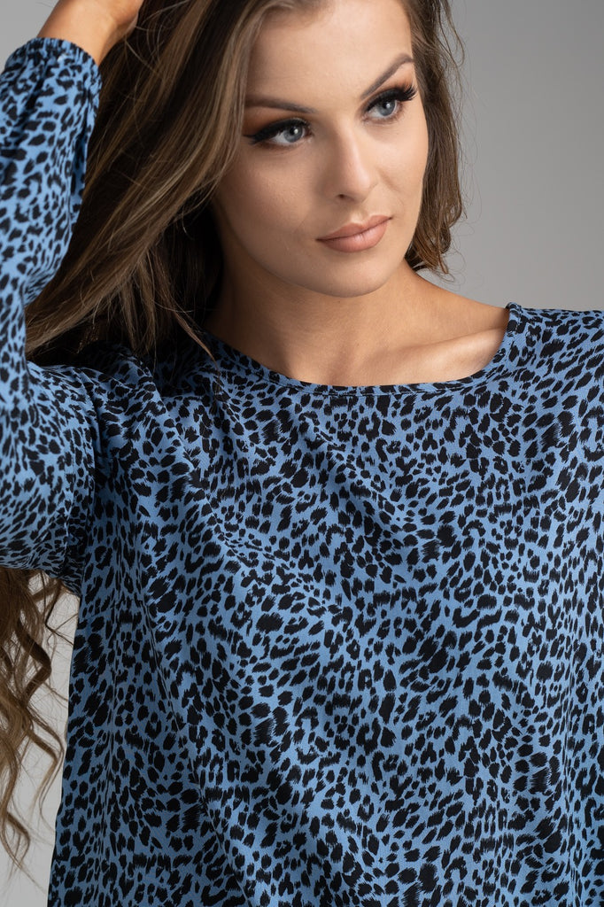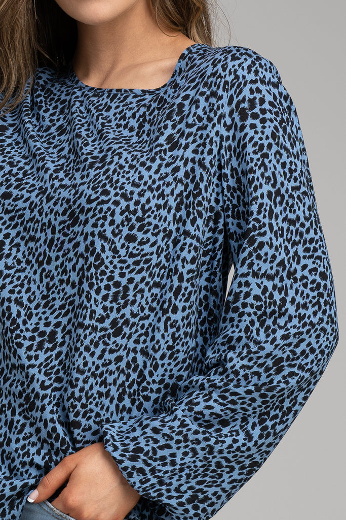 Blue round-neck top with abstract animal print throughout. The sleeves have an elasticated cuffs.