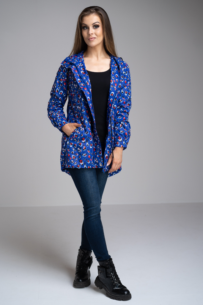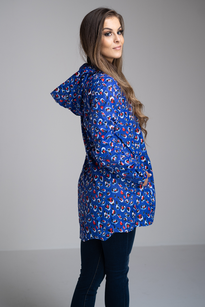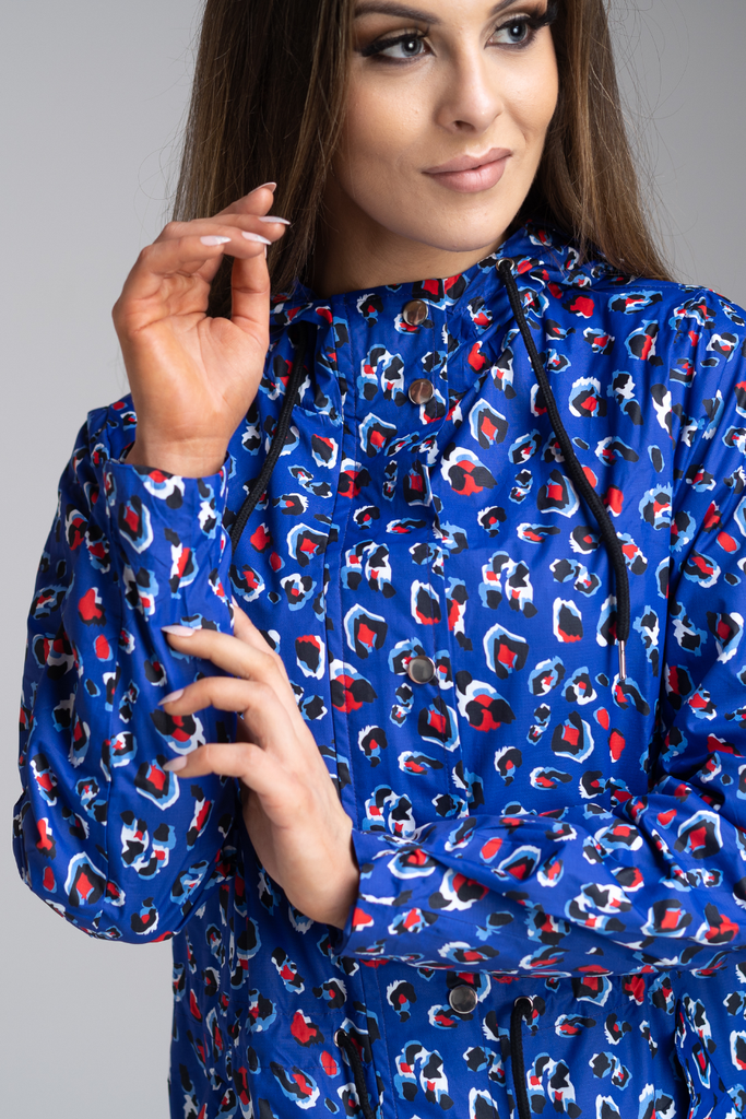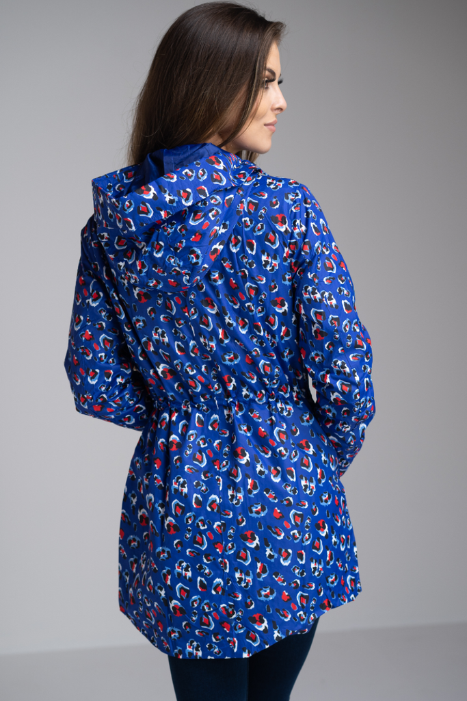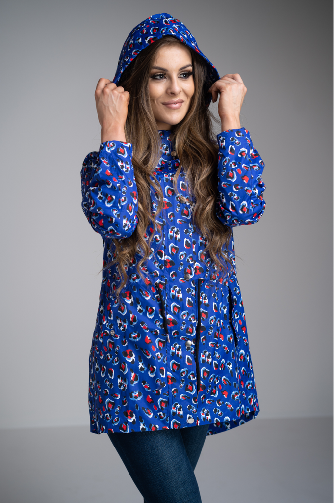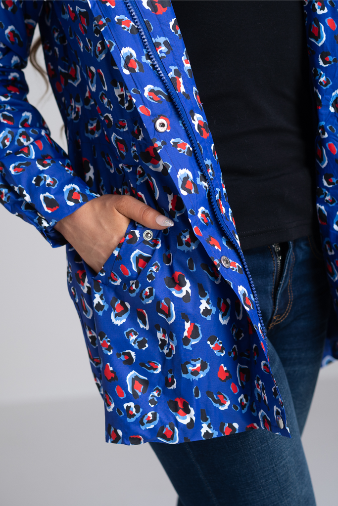 Blue raincoat with contrasting red animal print. Featuring an adjustable drawstring hood, long sleeves with snap-button cuffs and front flap pockets. It has an adjustable waist with drawstrings, front zip and snap-button down fastening.