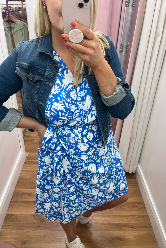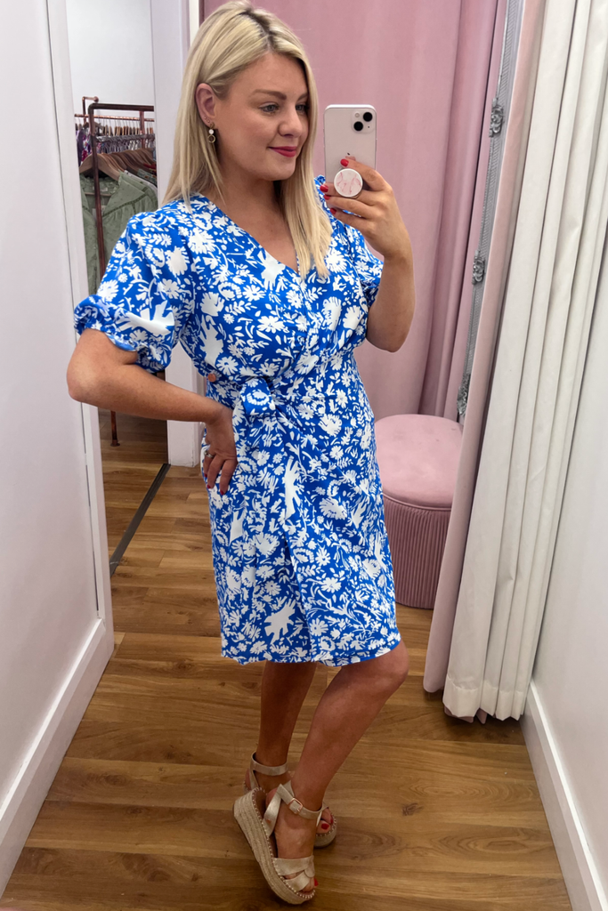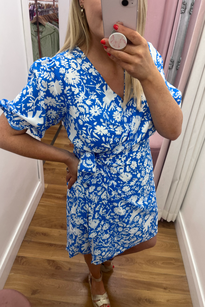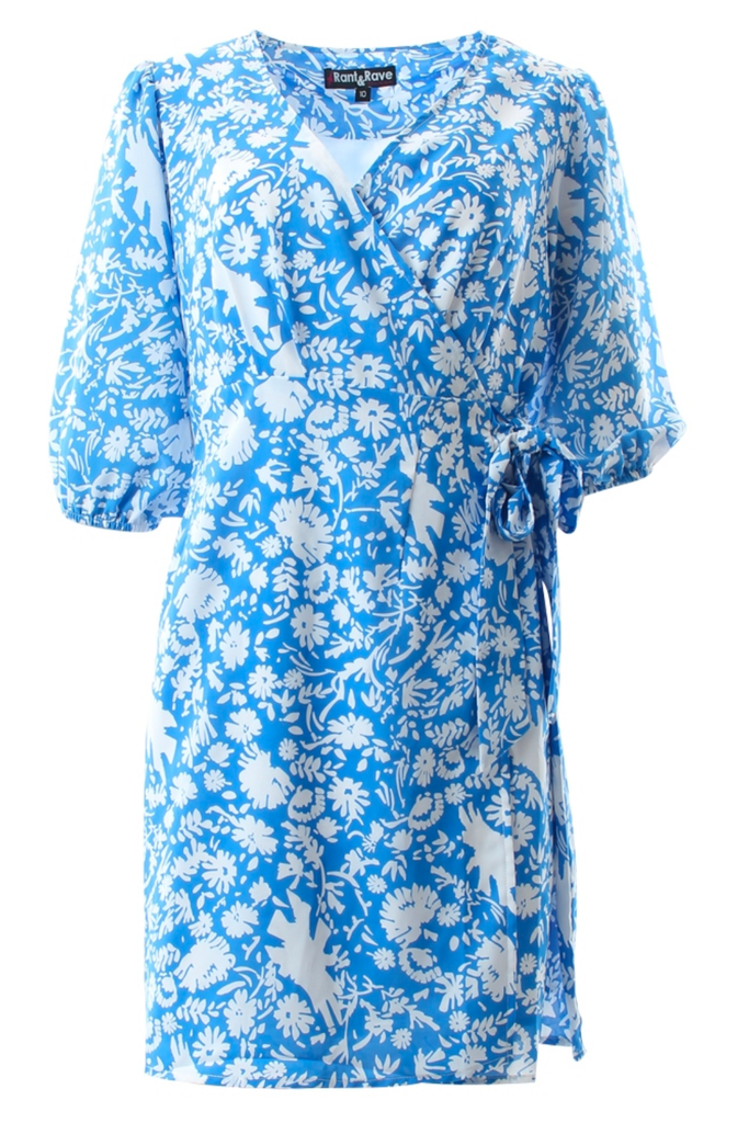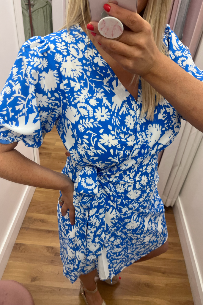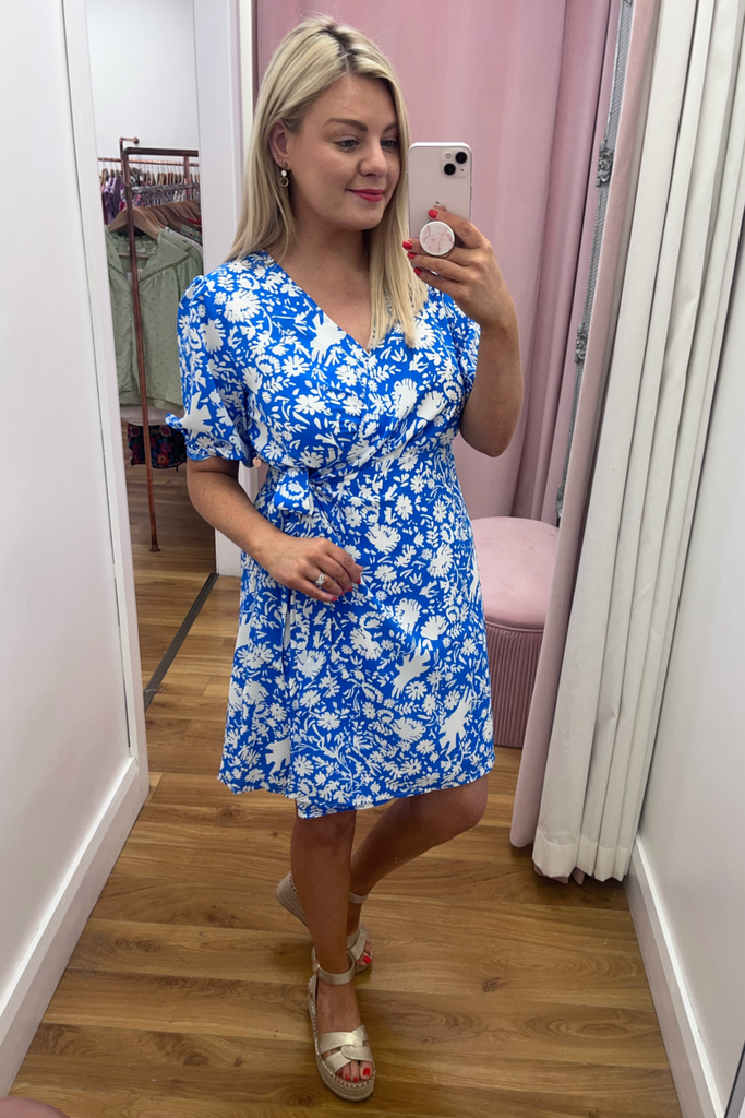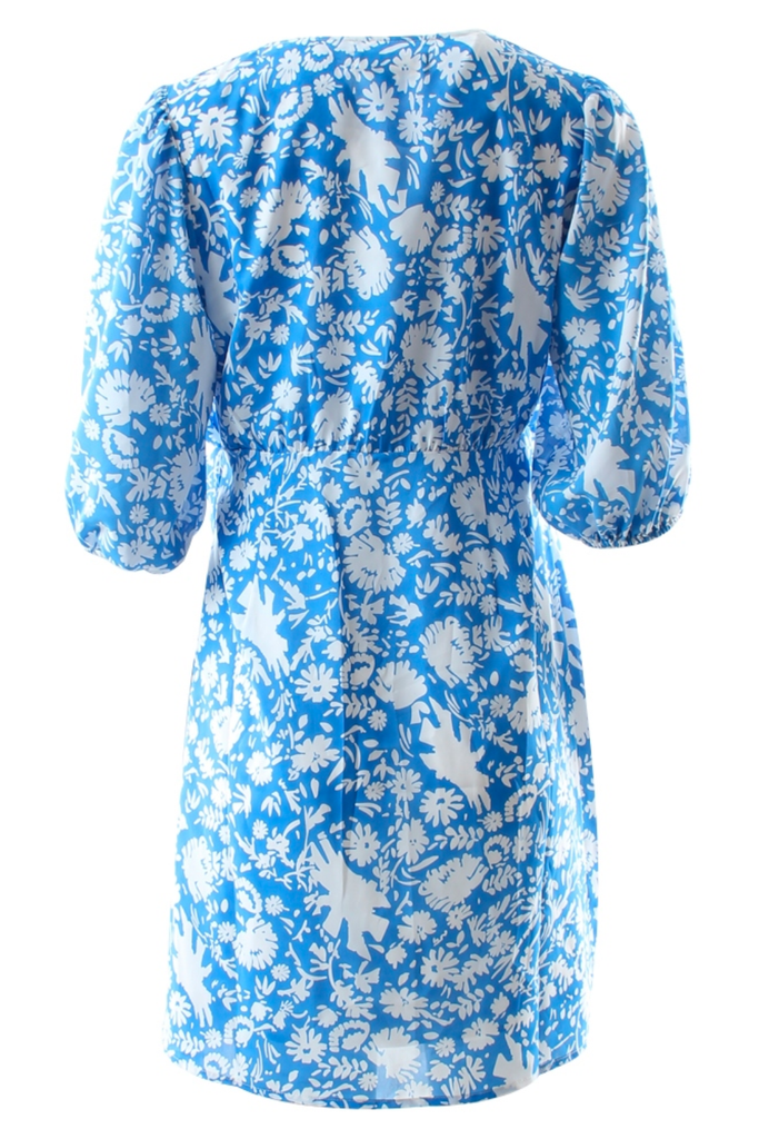 Printed in a stunning blue with white florals, this knee-length dress is designed in a super-flattering wrap silhouette framed by a V neckline and loose tie on one side to cinch in your waist. It features elbow length elegant blouson sleeves.
