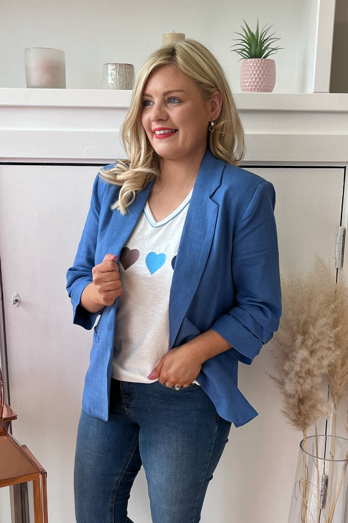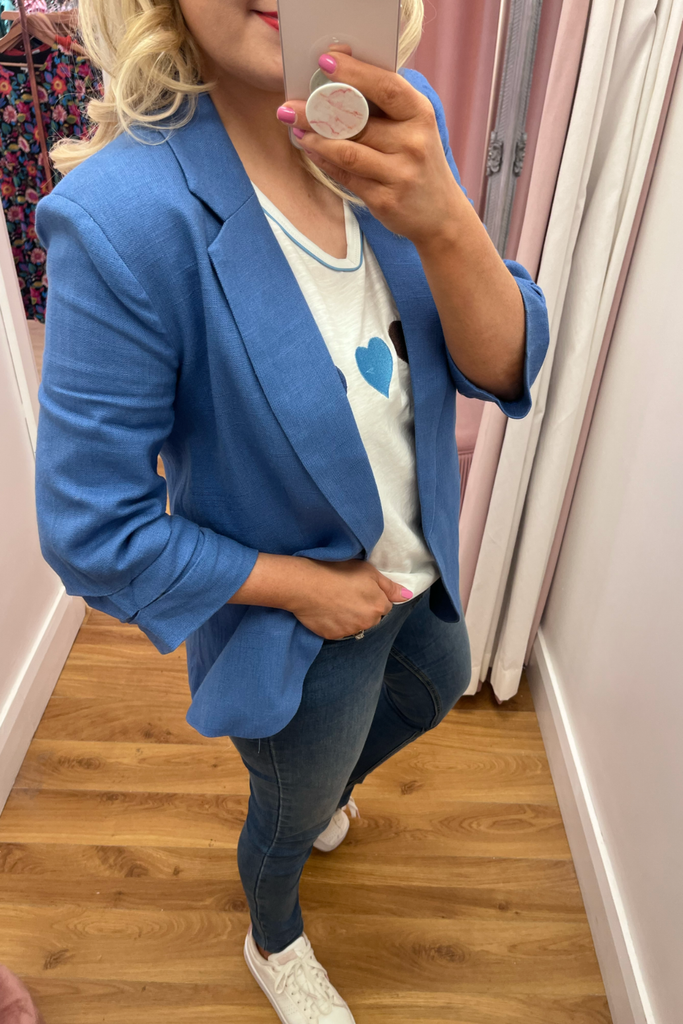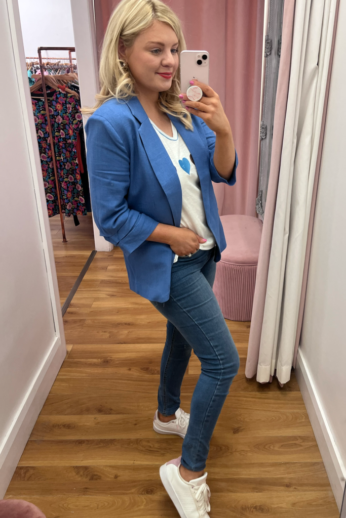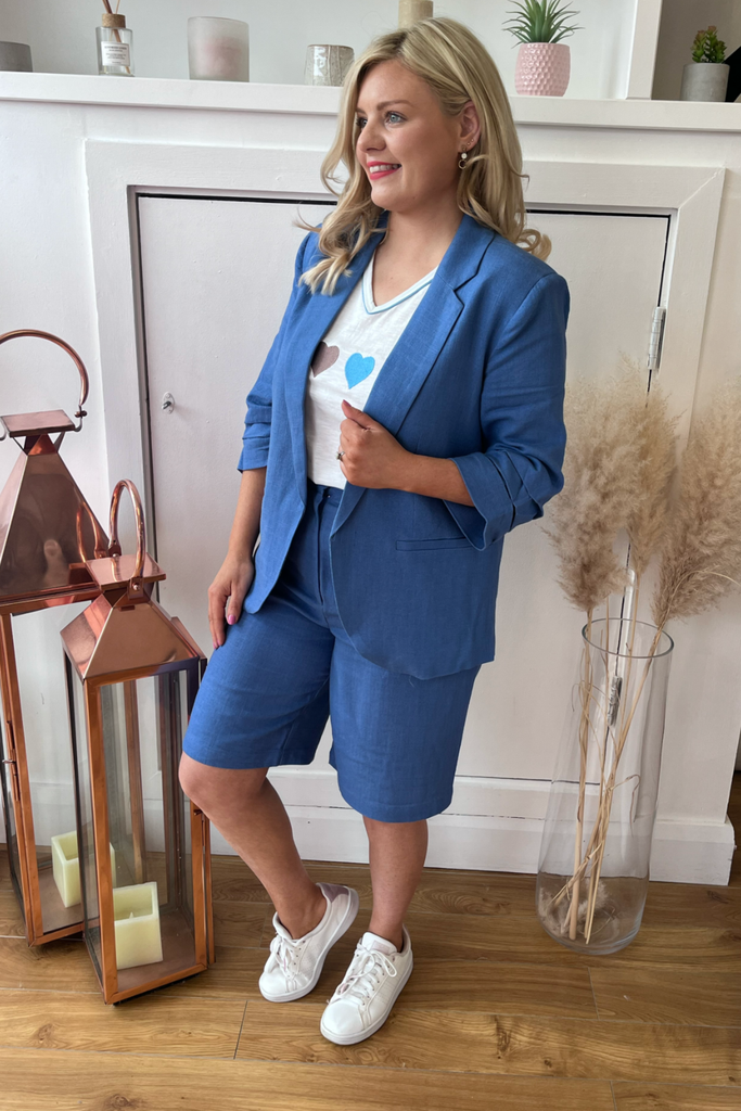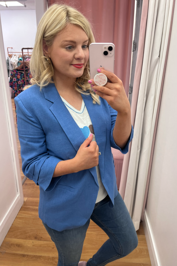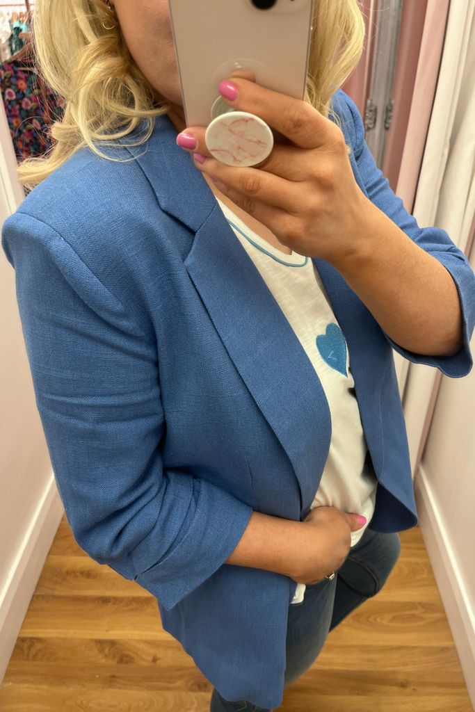 A gorgeous linen blend blazer in sky blue. With 3/4 length sleeve featuring a pleated detail at the arm. Perfect over dresses, with jeans, or with the matching shorts. This style is lined