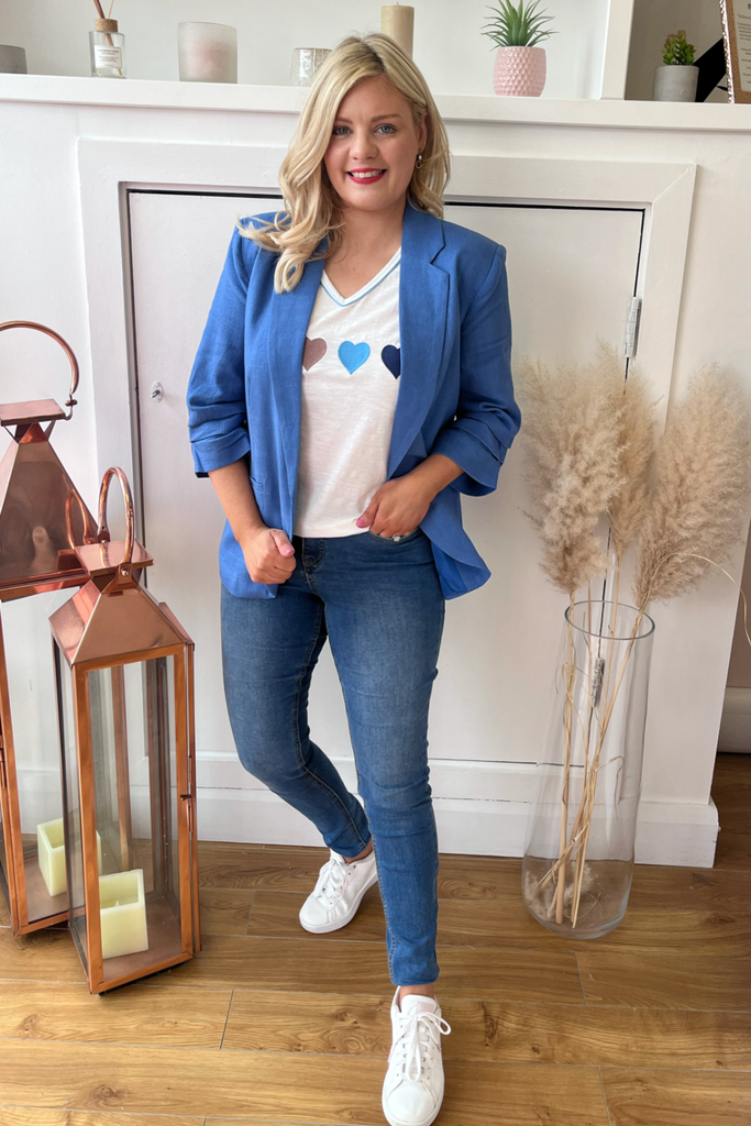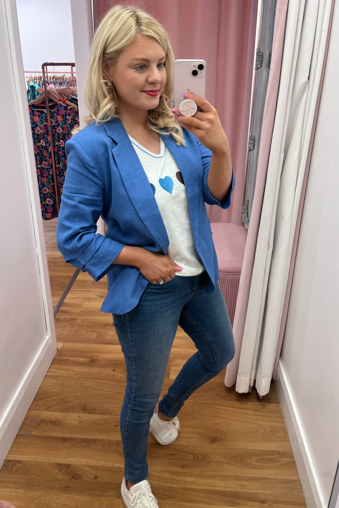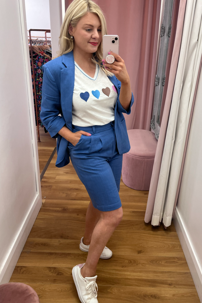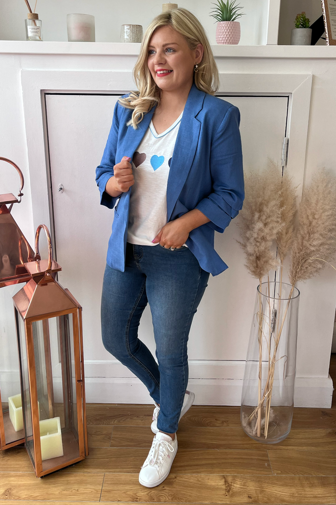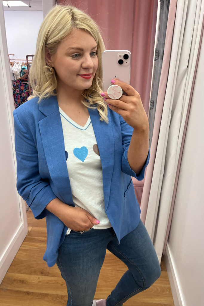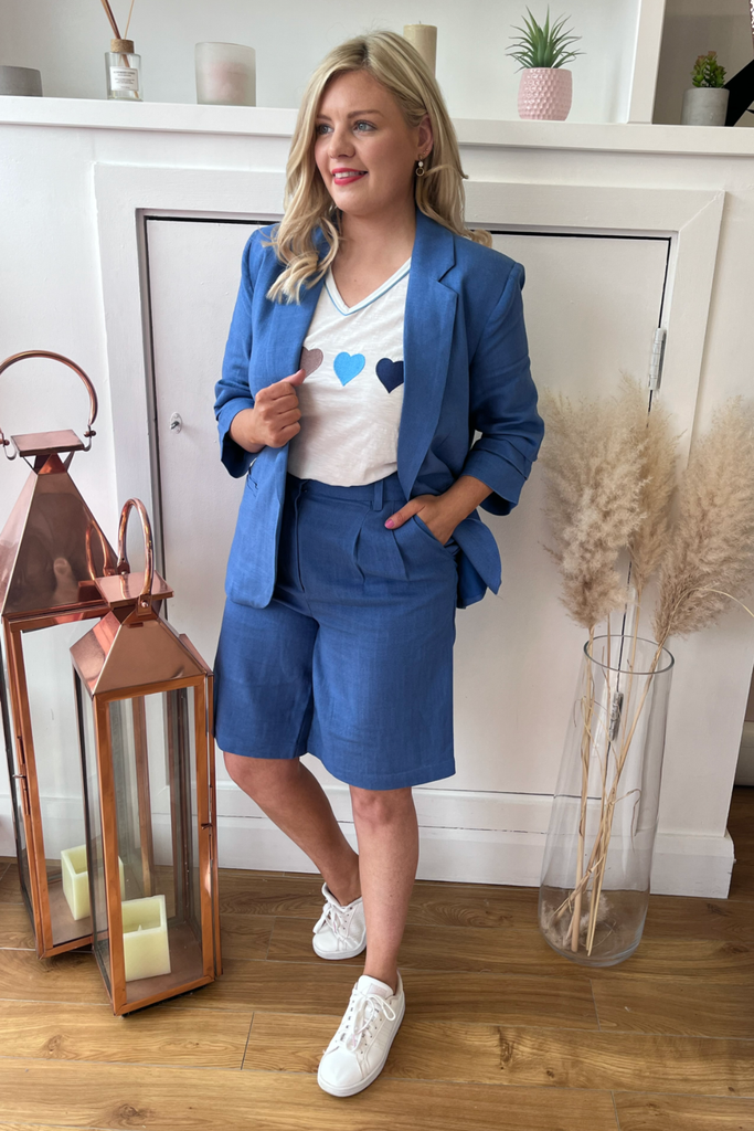 A gorgeous linen blend blazer in sky blue. With 3/4 length sleeve featuring a pleated detail at the arm. Perfect over dresses, with jeans, or with the matching shorts. This style is lined