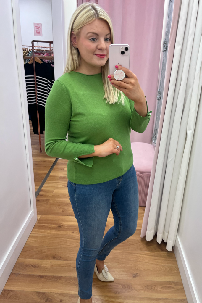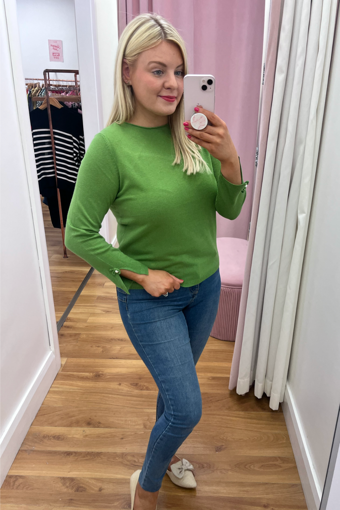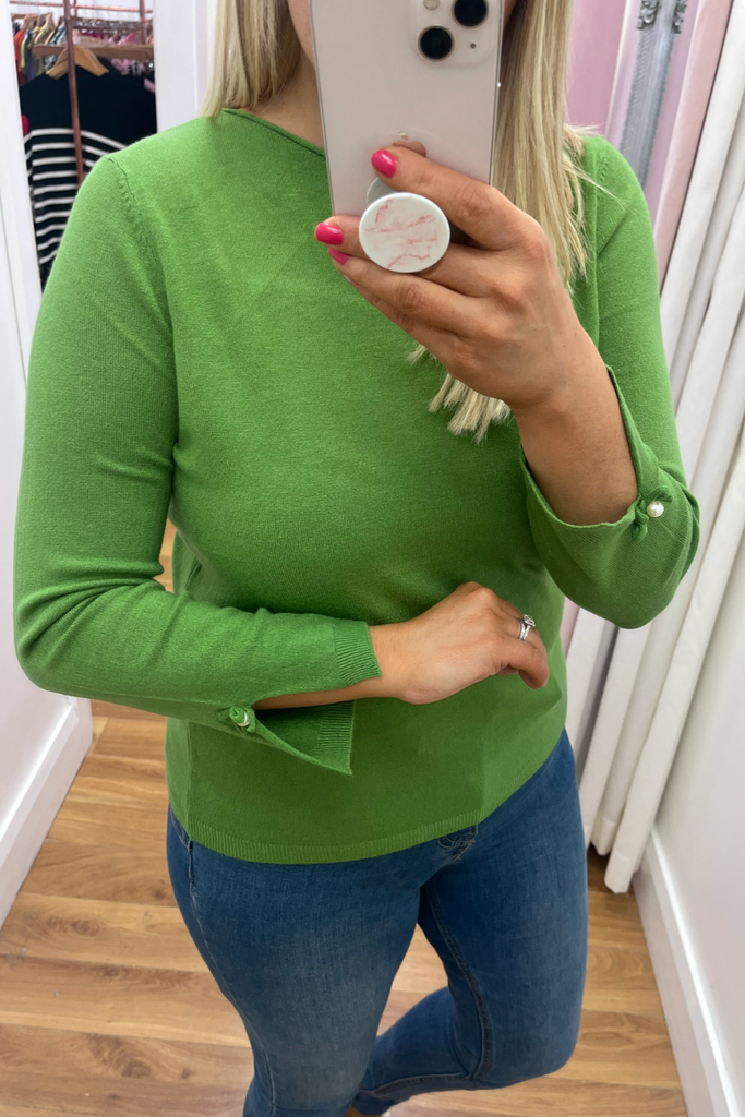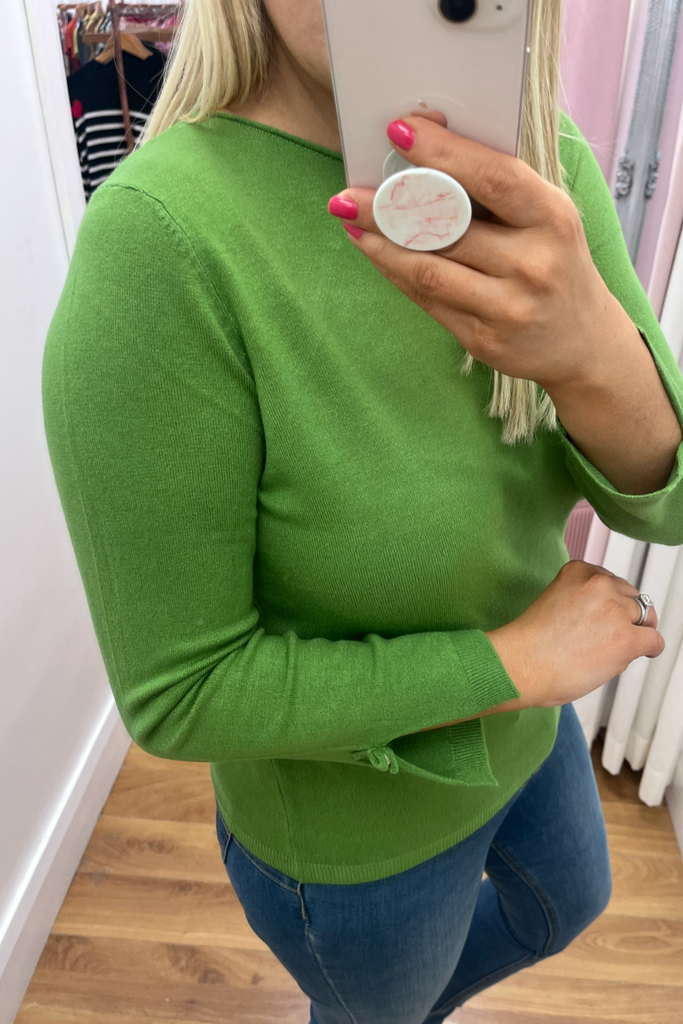 Fine solid colour knit with round neck. Featuring pretty bow and pearl detail at the cuff. The sweetest knit perfect to wear on its own or layer over dresses