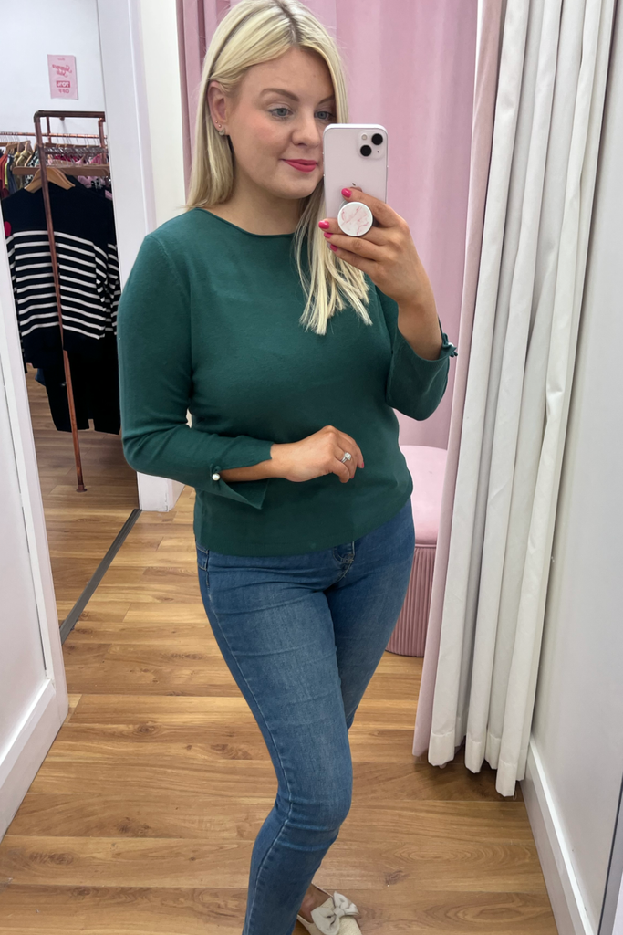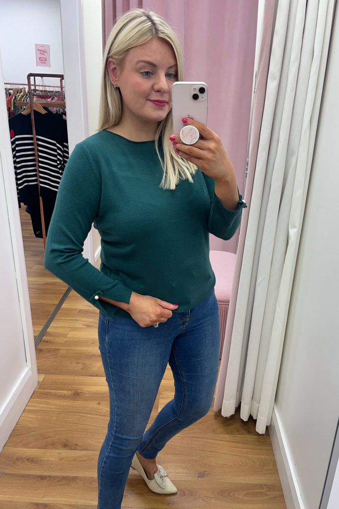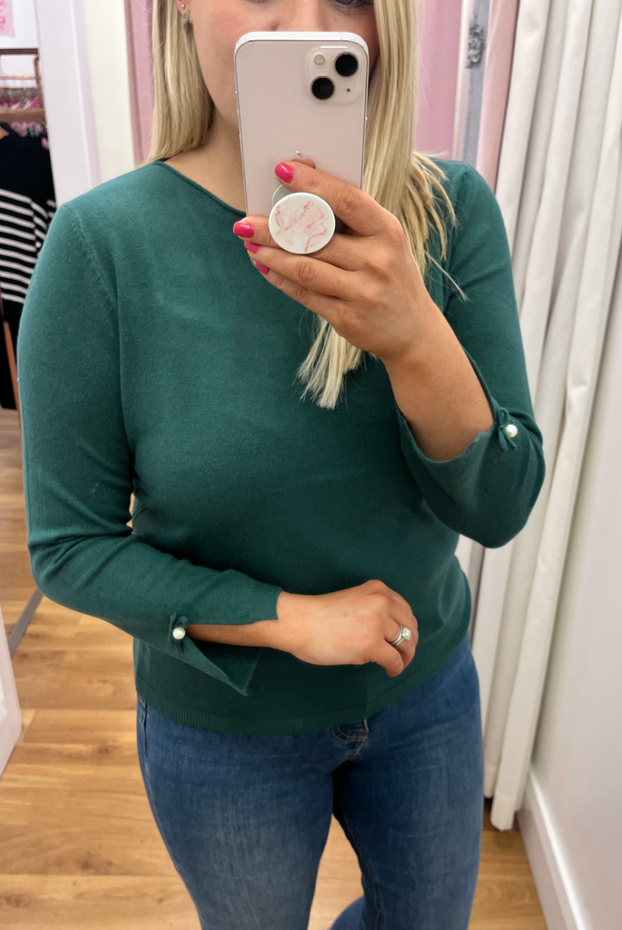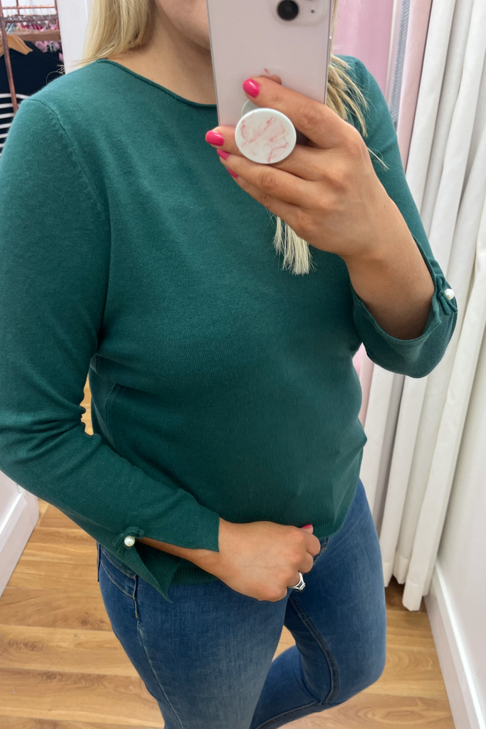 Fine solid colour knit with round neck. Featuring pretty bow and pearl detail at the cuff. The sweetest knit perfect to wear on its own or layer over dresses