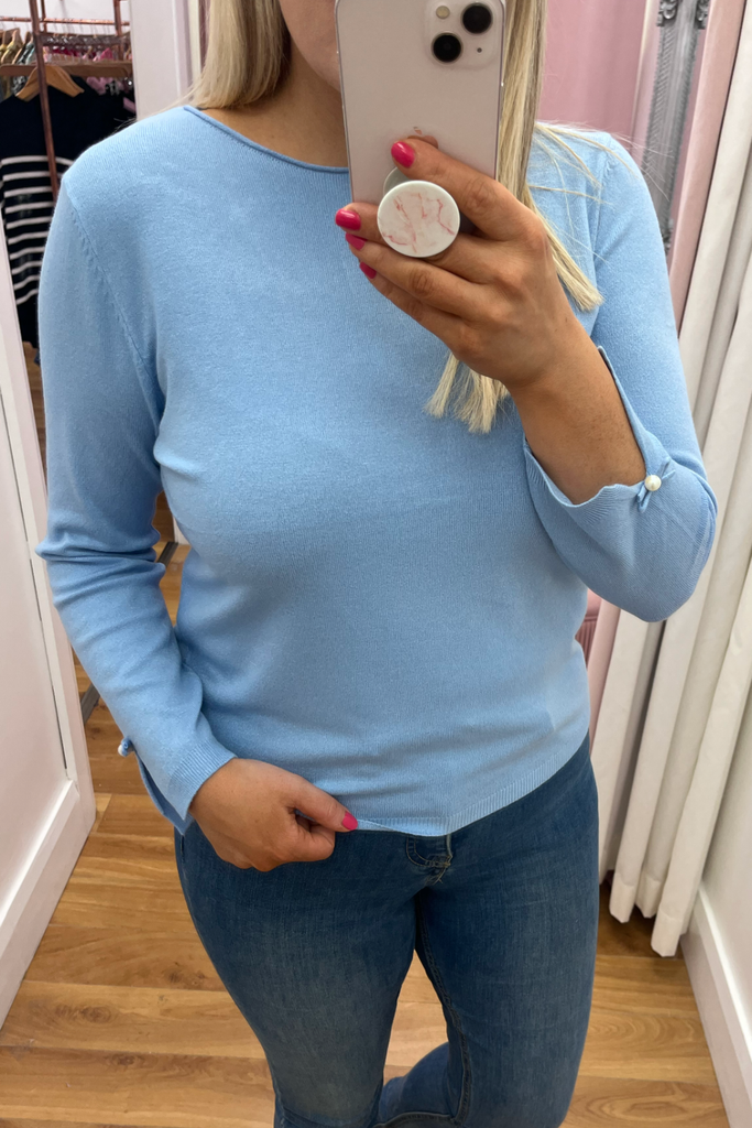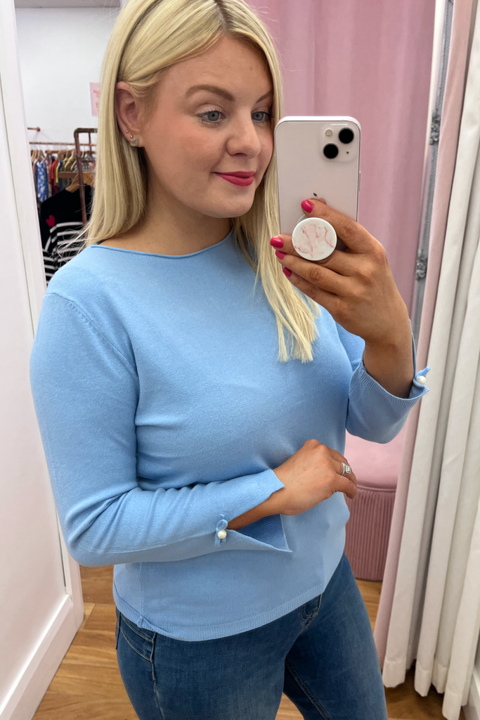 Bow & Pearl Cuff Jumper (Sky Blue)