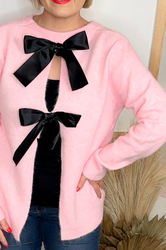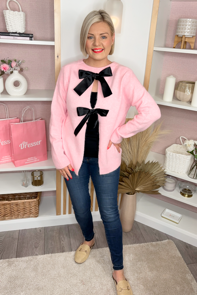 Two-way block colour sweater with statement black bows. Multiple colours available