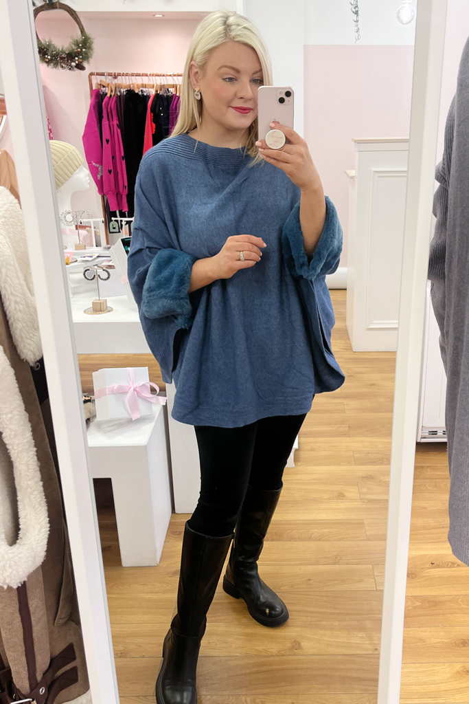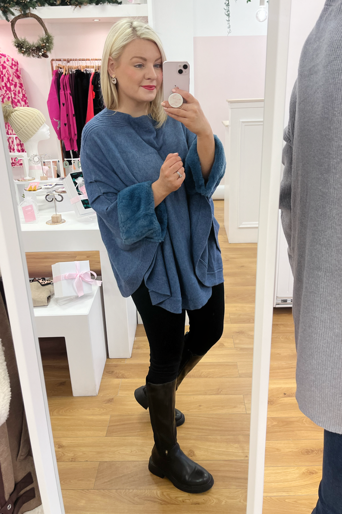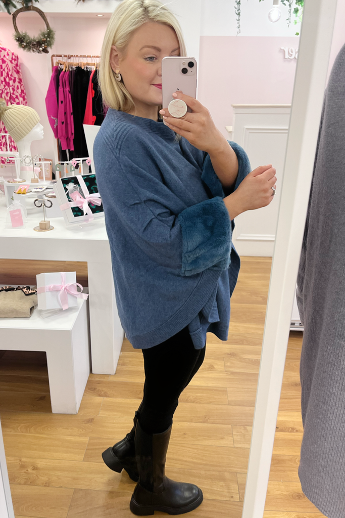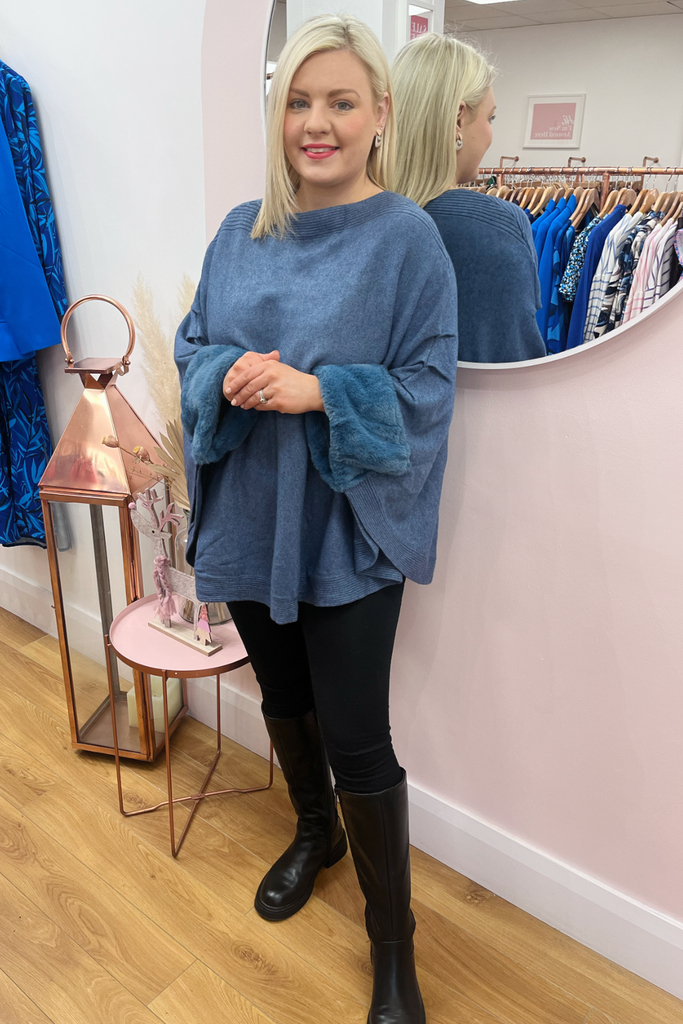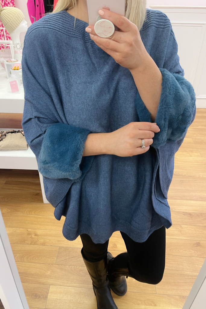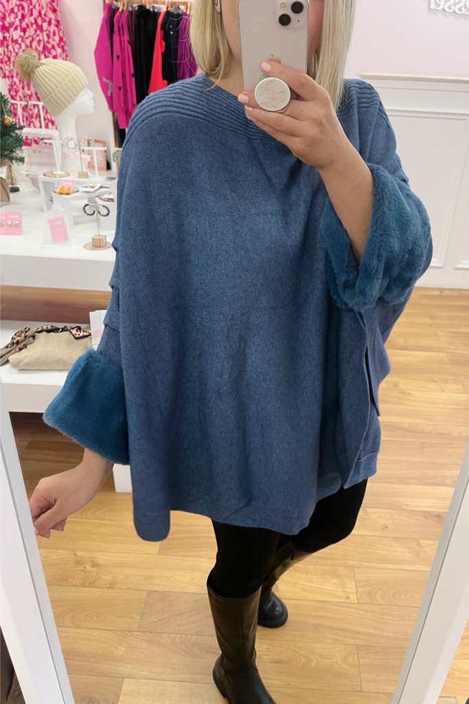 Cape style jumper with faux fur trimmed cuff. This style has great long length.