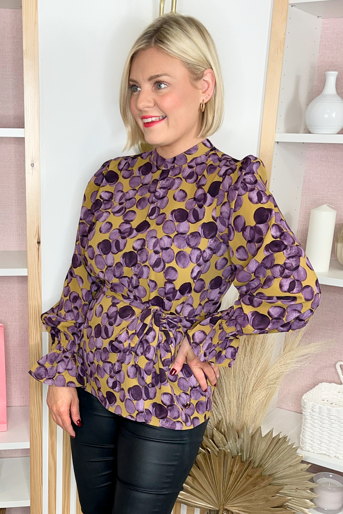 Striking printed blouse with peplum cuff and optional tie for the waist or neckline. This style is unlined